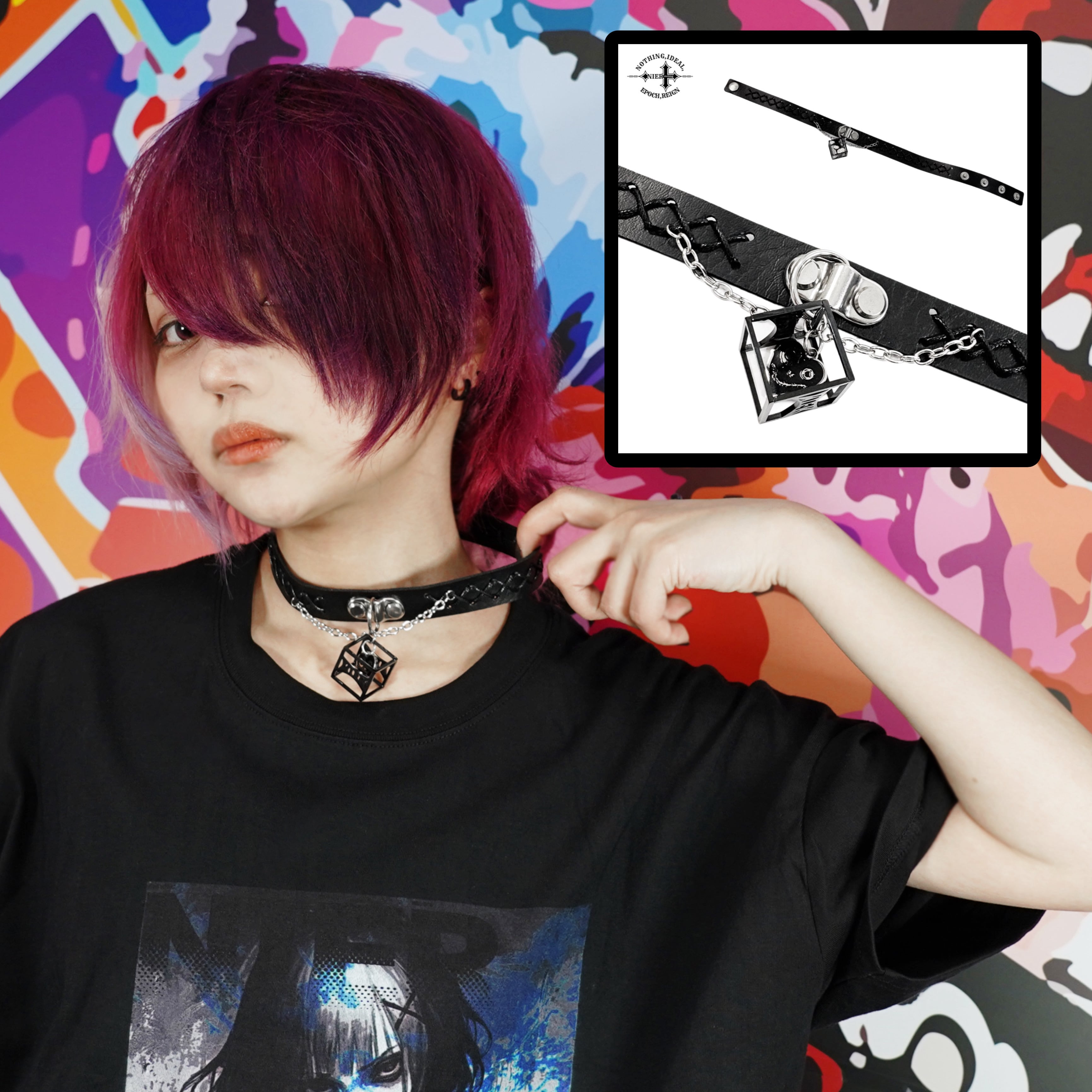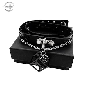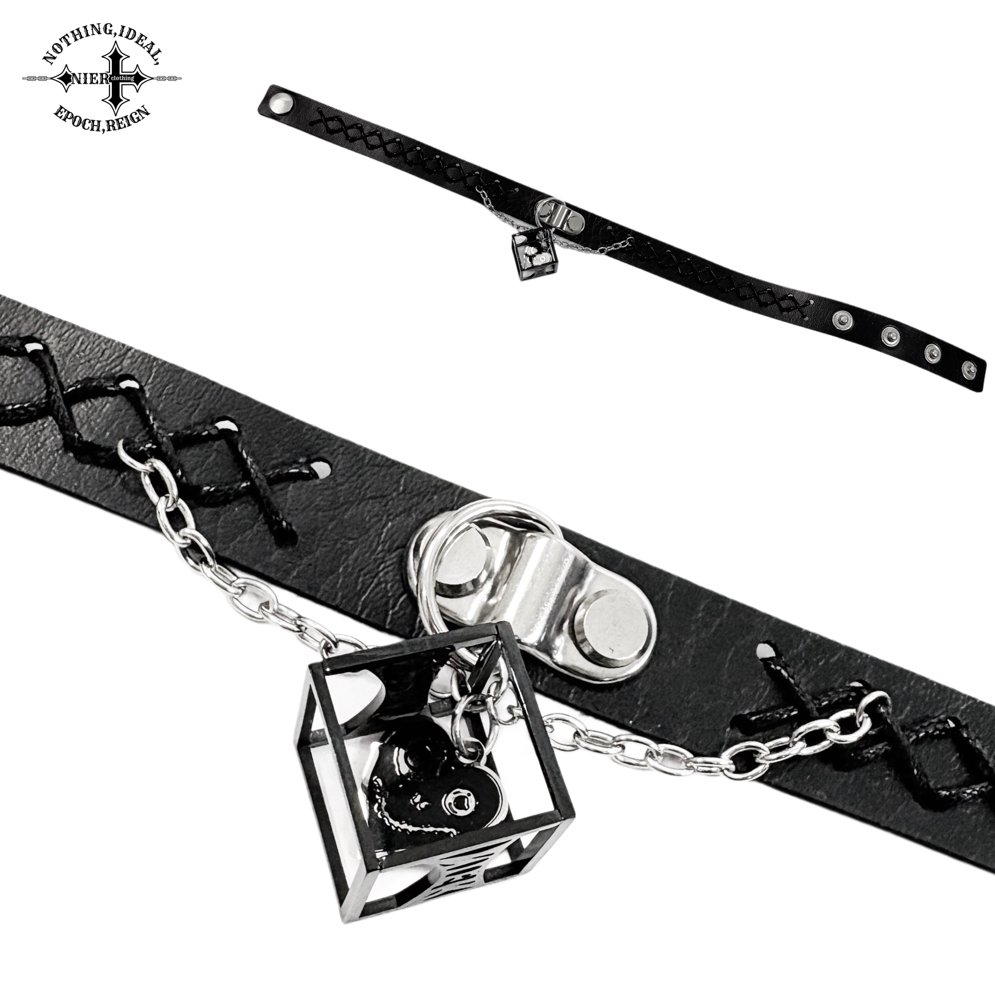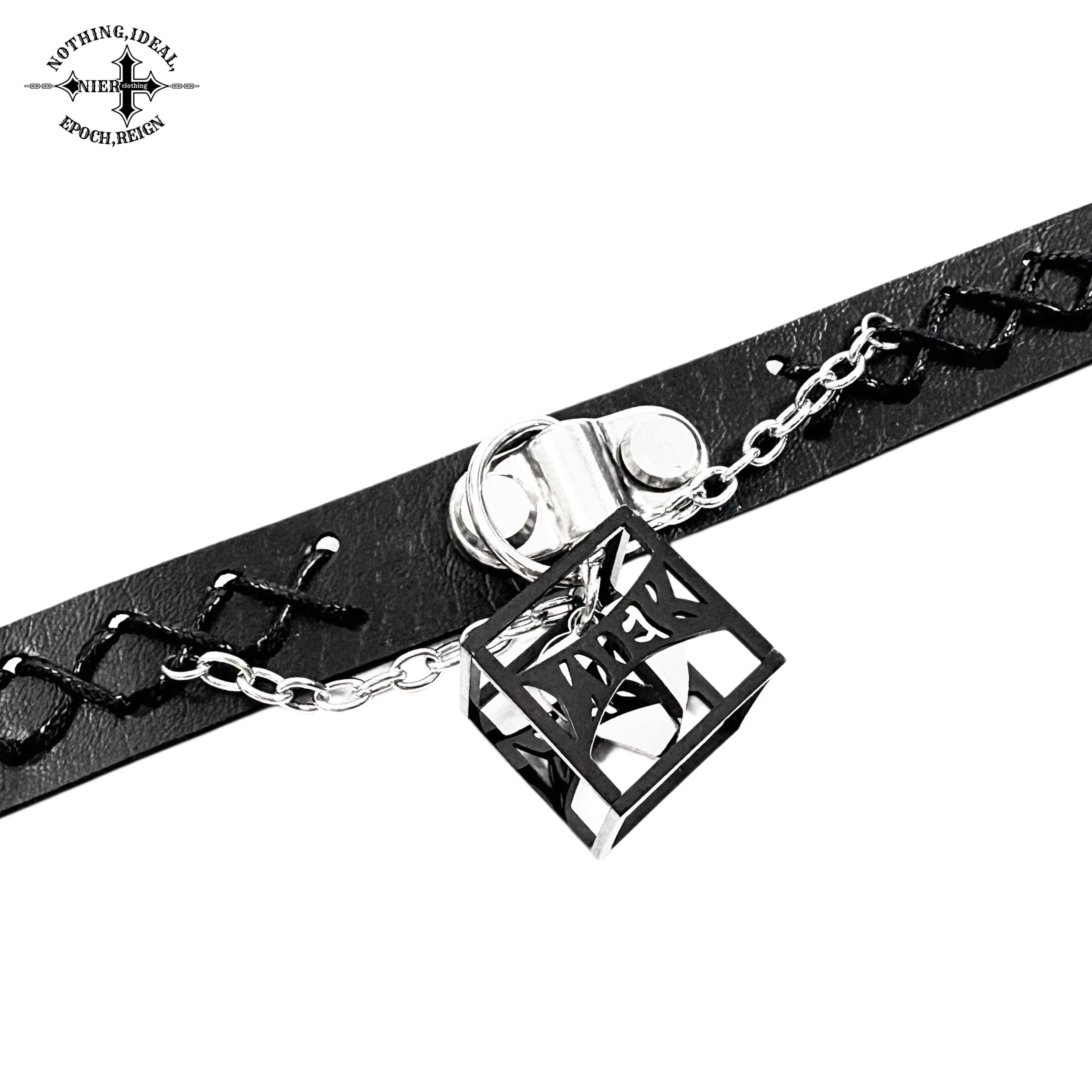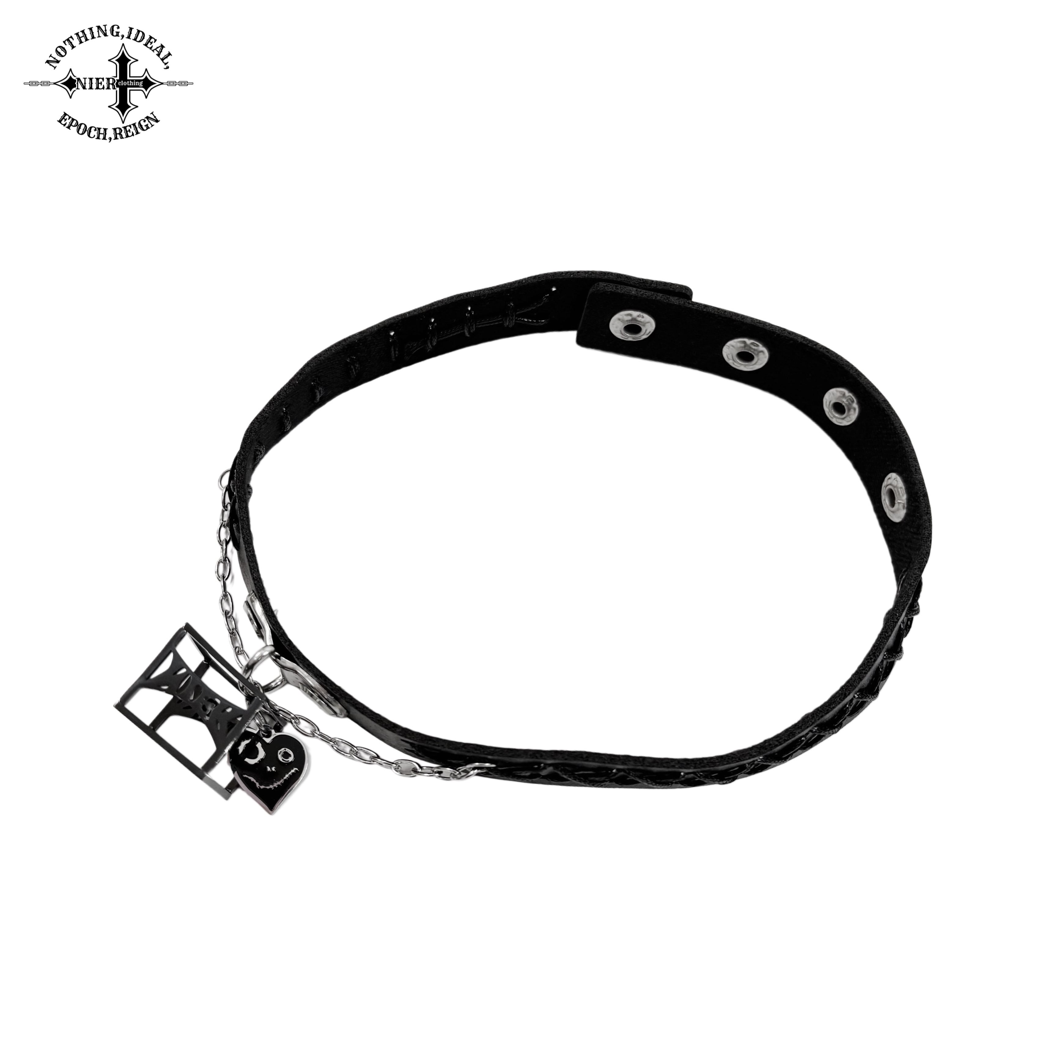 存在感抜群のチャームと編み込みレザーが首元を彩るゴシックチョーカーです。