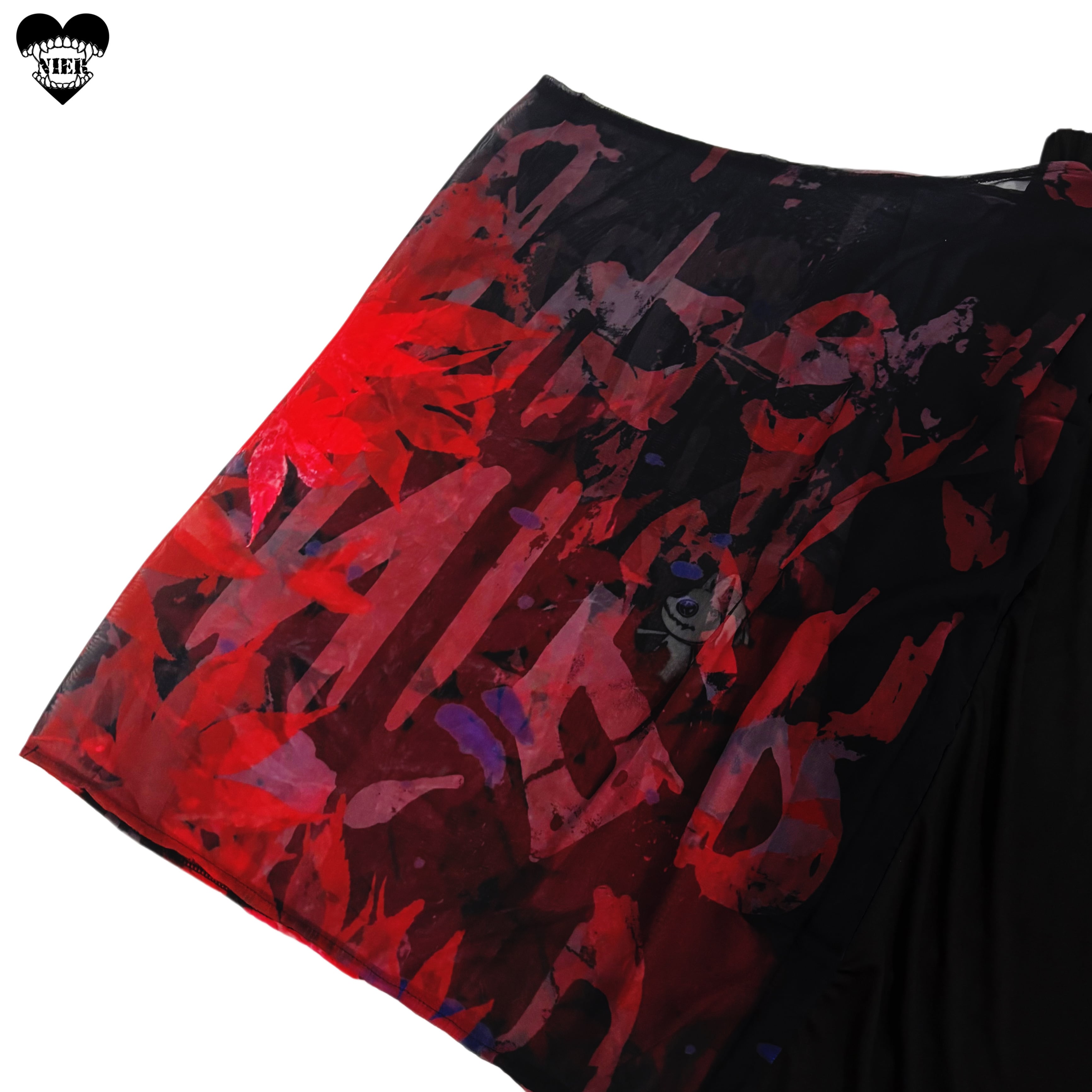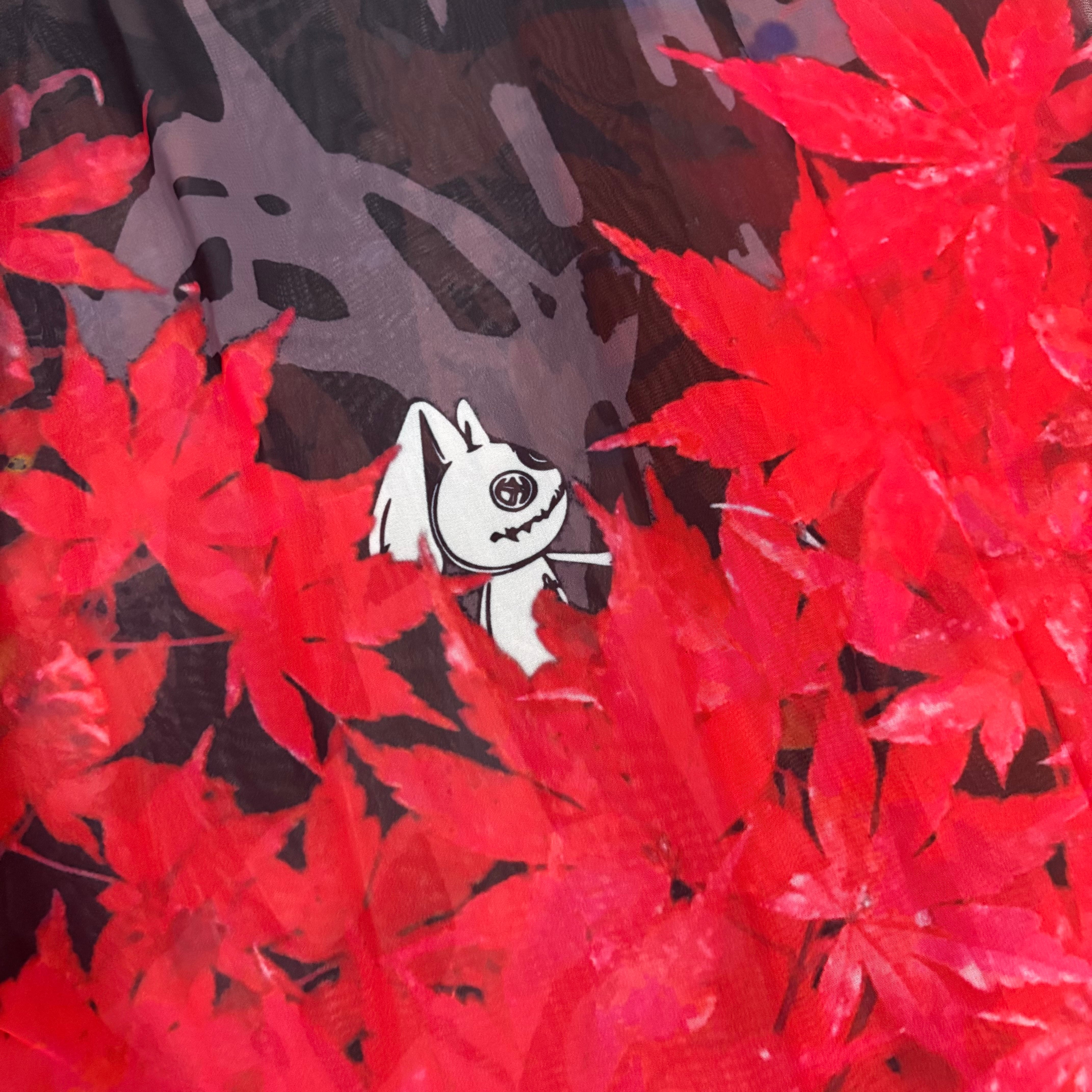 大胆に広がるシースルーフラップに描かれた紅葉柄とロゴが目を惹く、