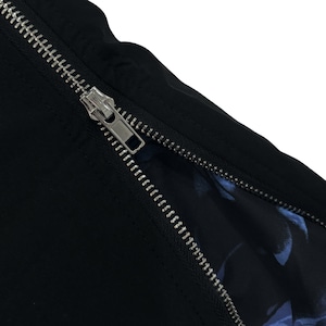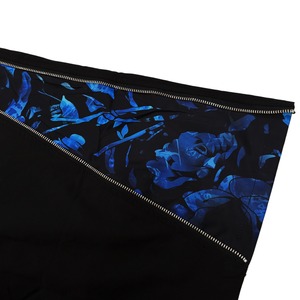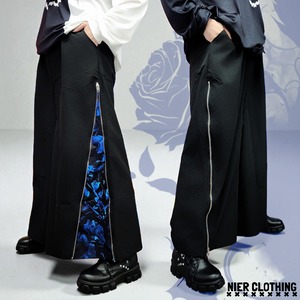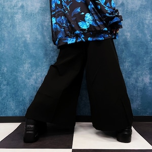 深いブラックに艶めくブルーの総柄が覗く、存在感抜群のワイドパンツとなっております。