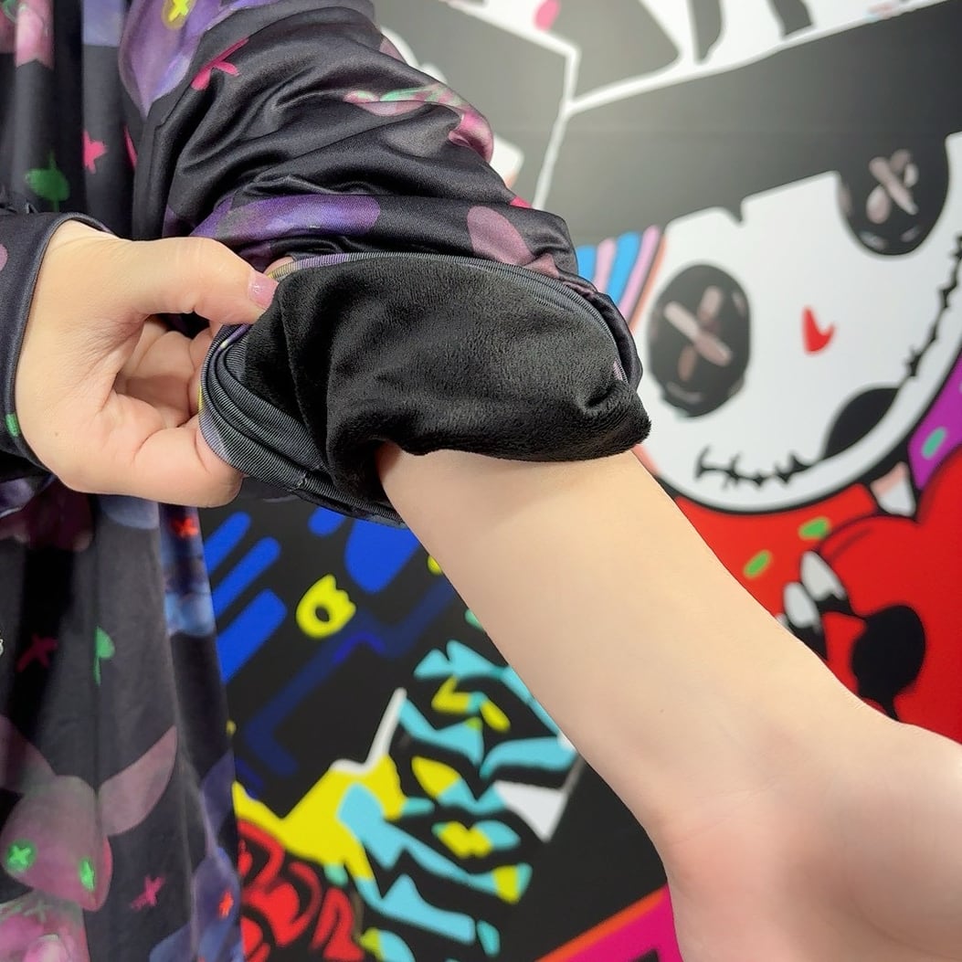 ポップでダークな世界観が詰め込まれた総柄デザインの裏起毛アウターです。