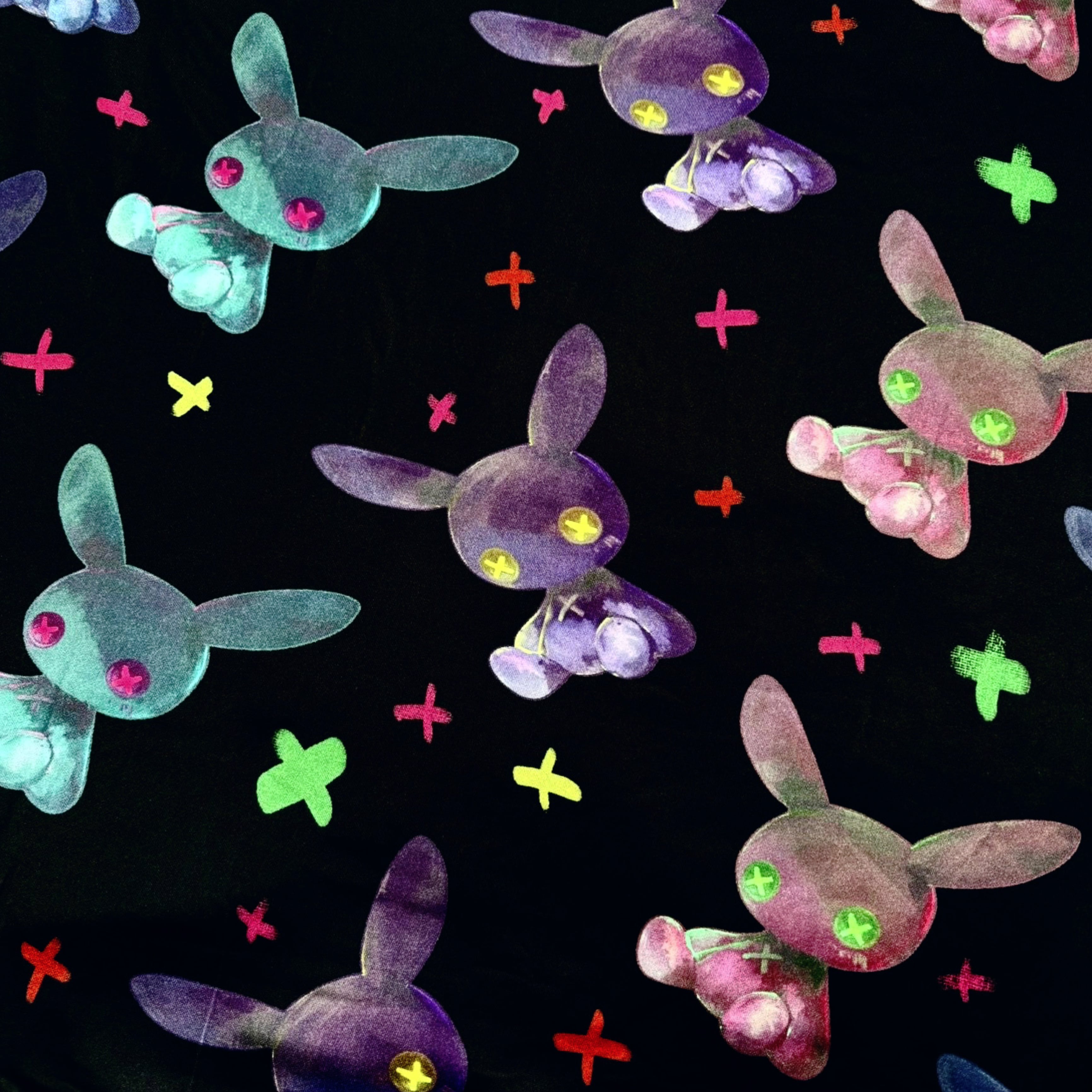 ブラックベースの生地に、カラフルなRabbitモチーフを散りばめ、