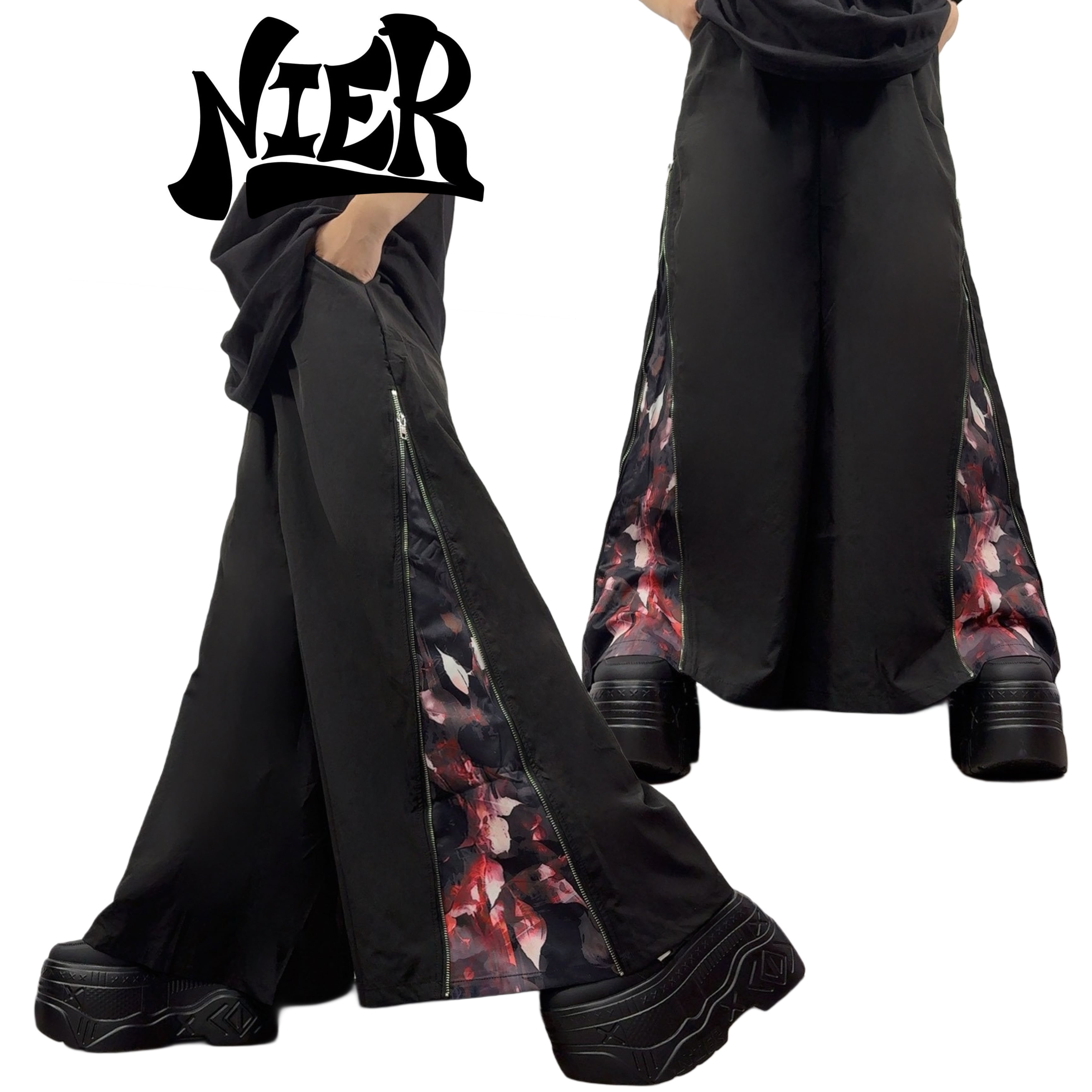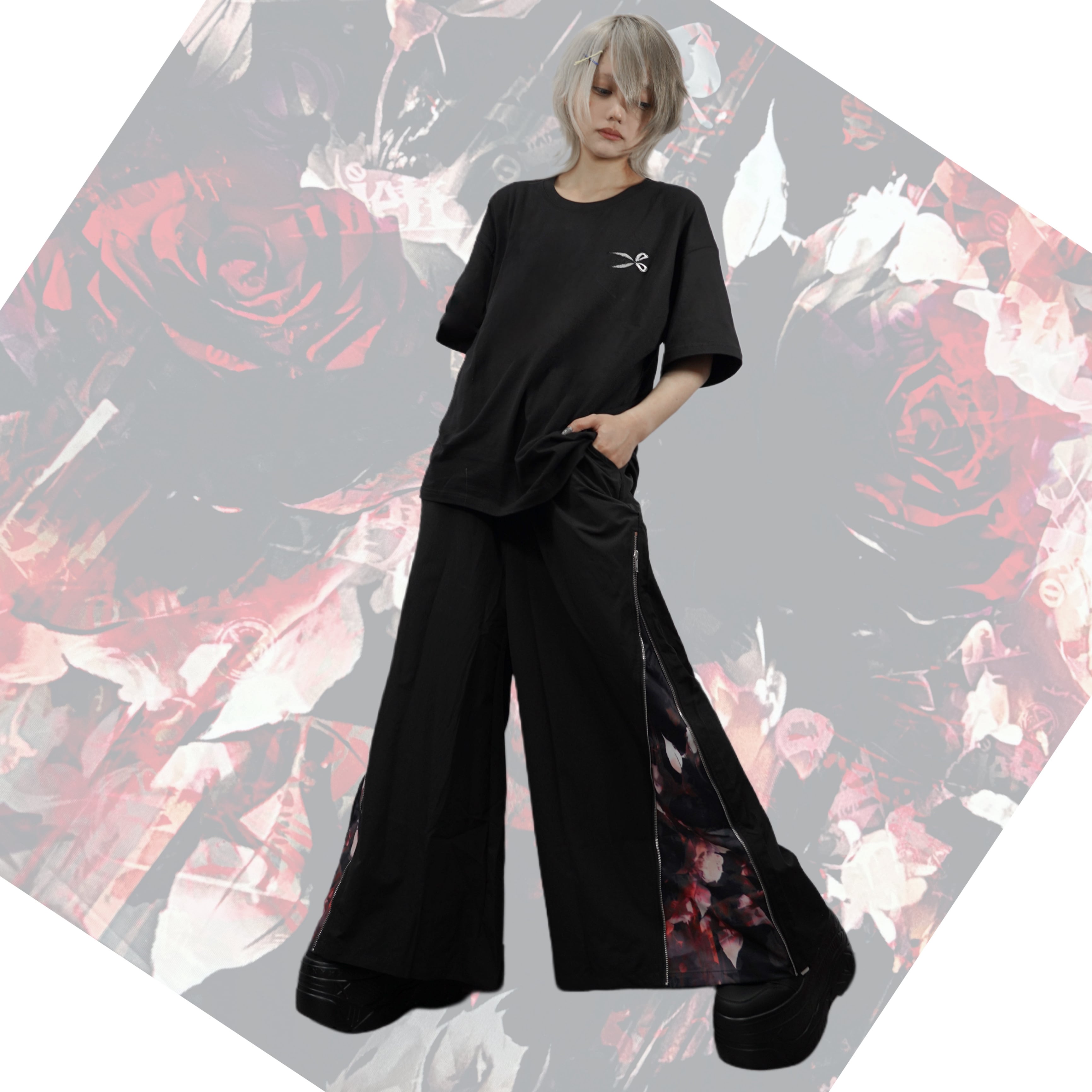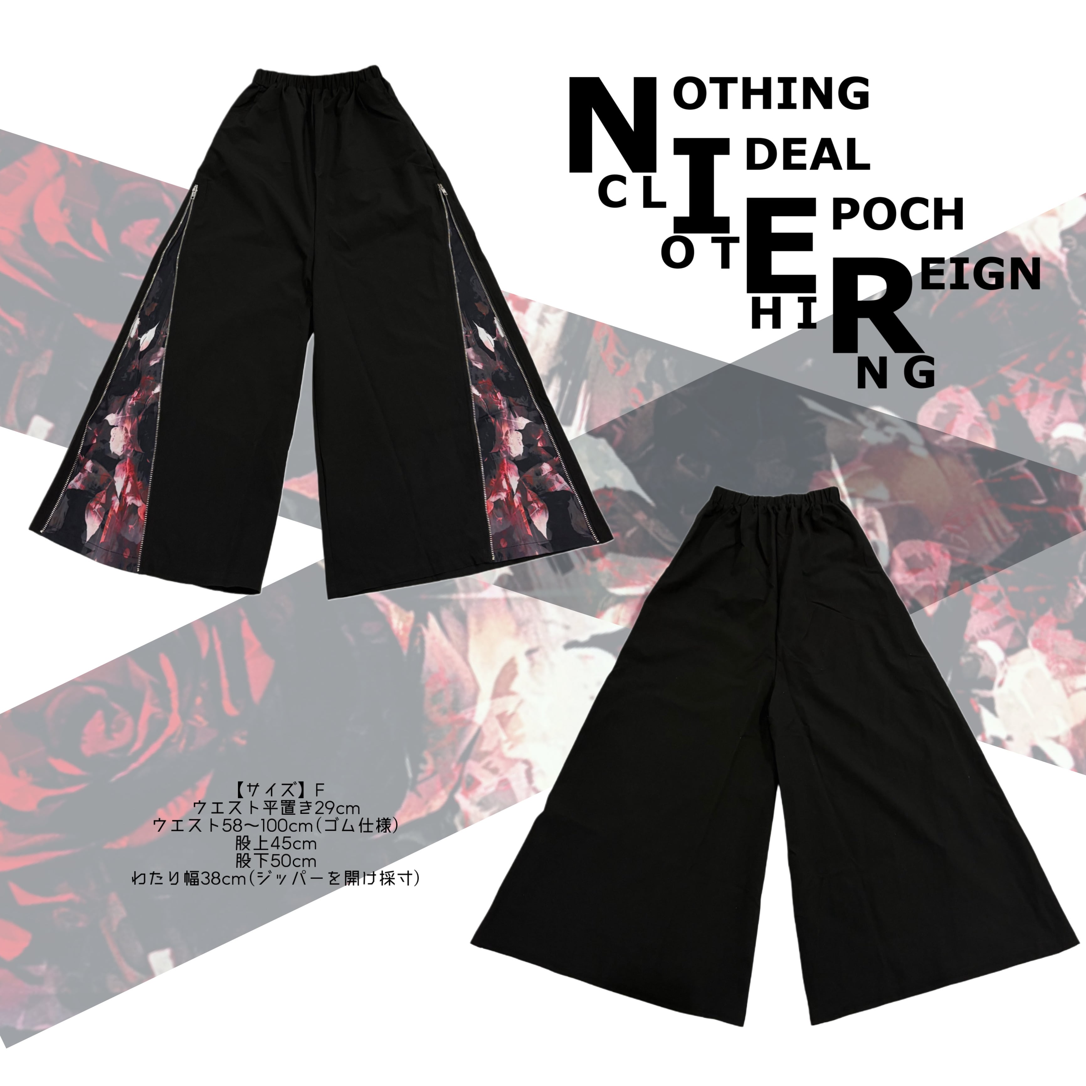 ZIPを開けば闇の中に咲くような赤薔薇が覗く、華やかさと退廃美を併せ持つワイドパンツが登場☆
