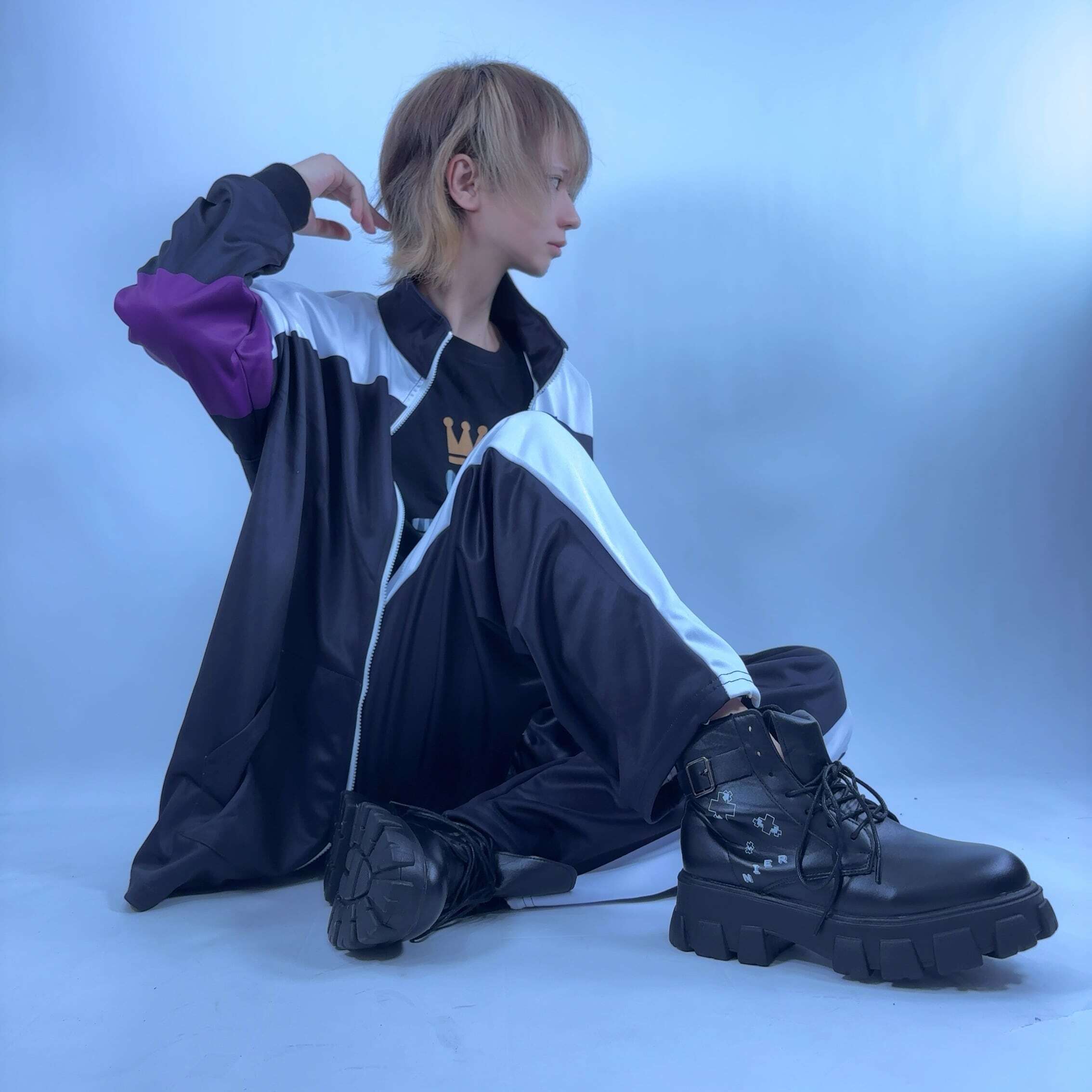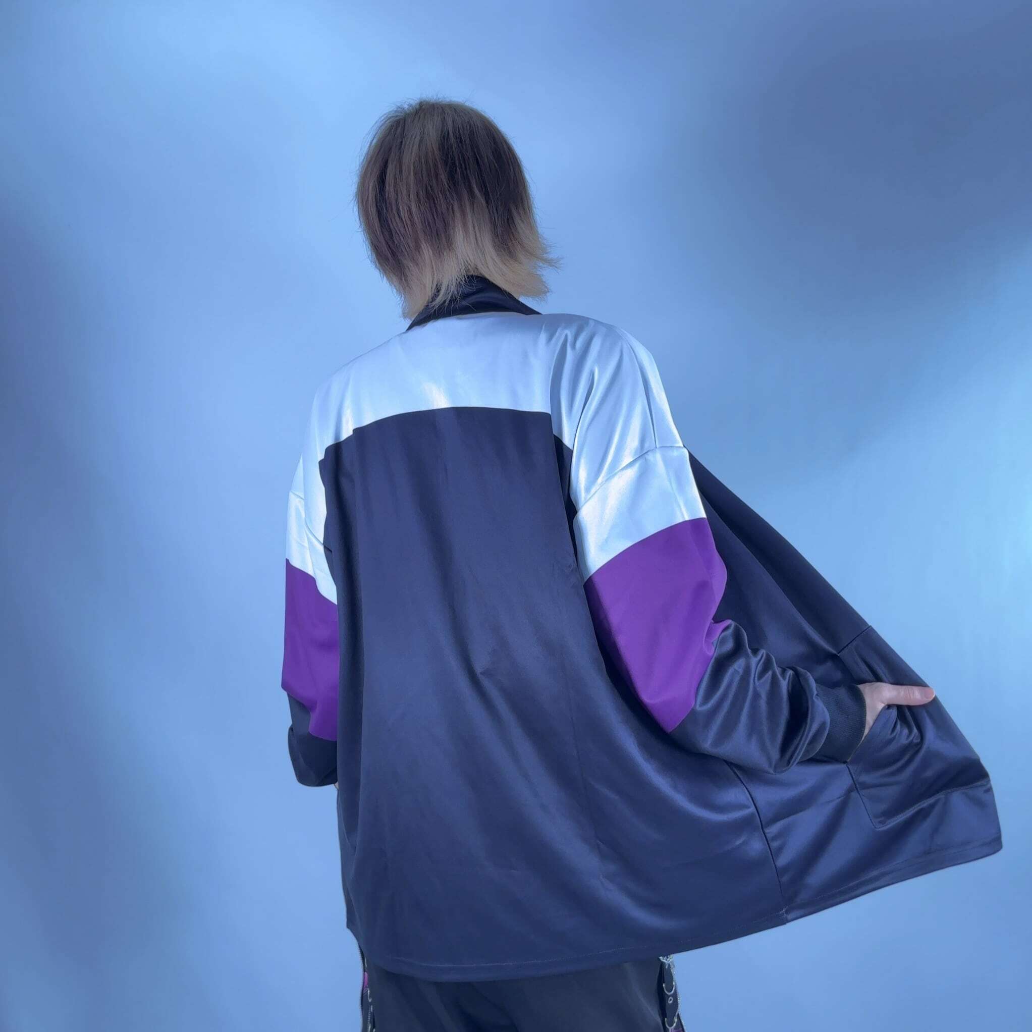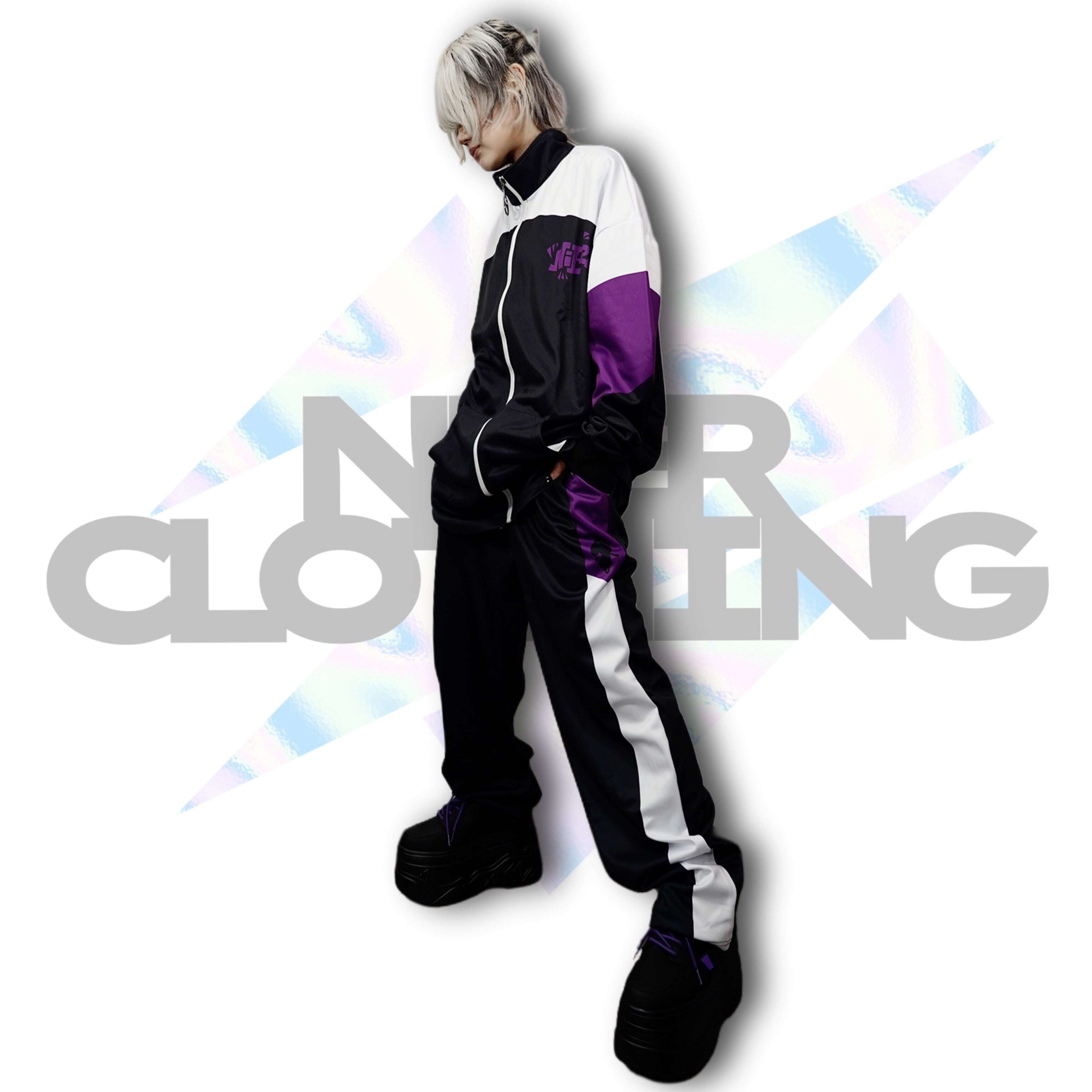 パープル×ホワイト×ブラックのトリコロールが目を引くアウター×パンツのセットとなります。