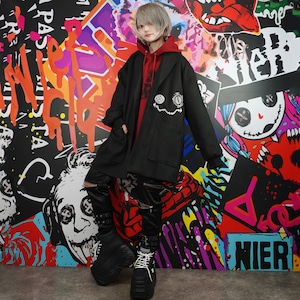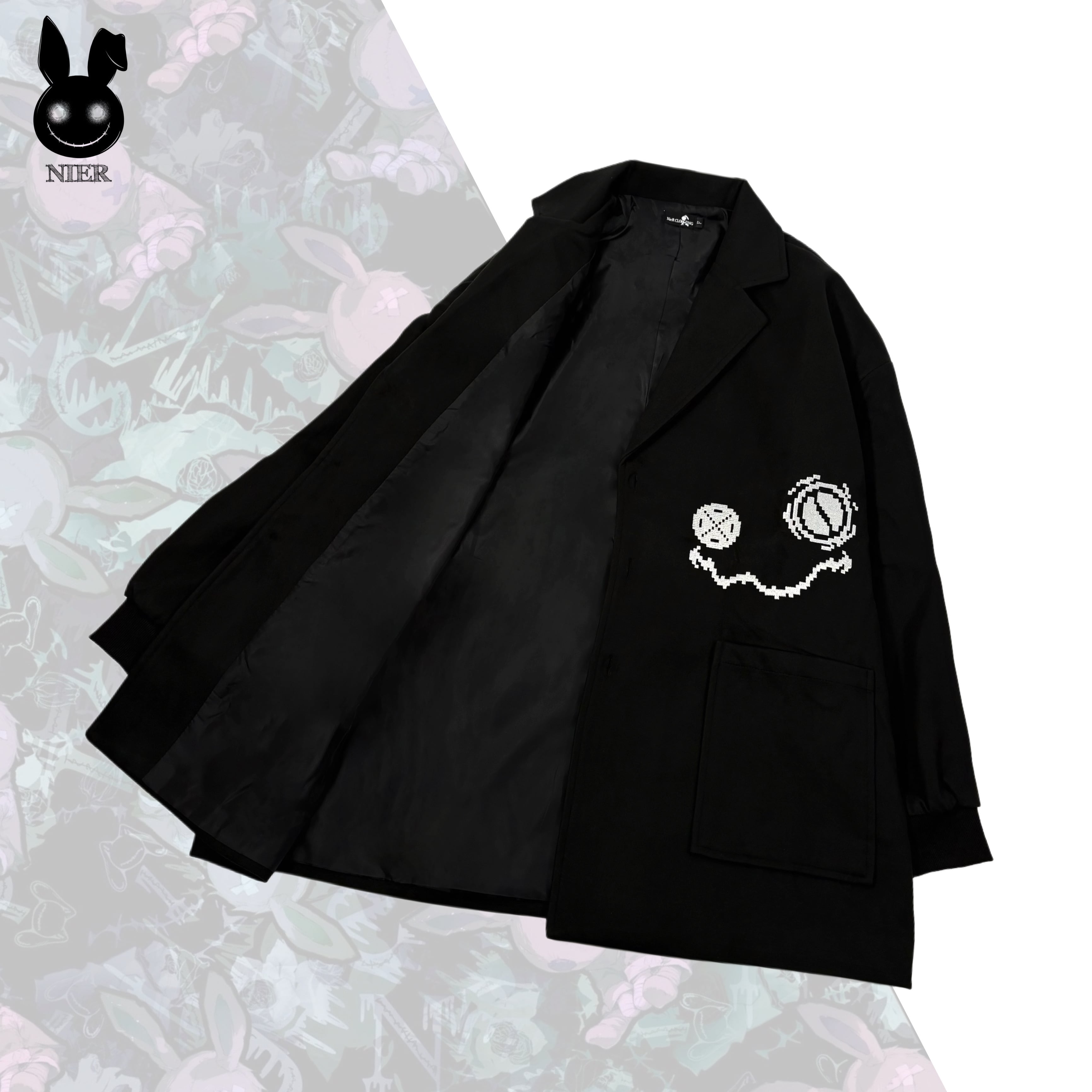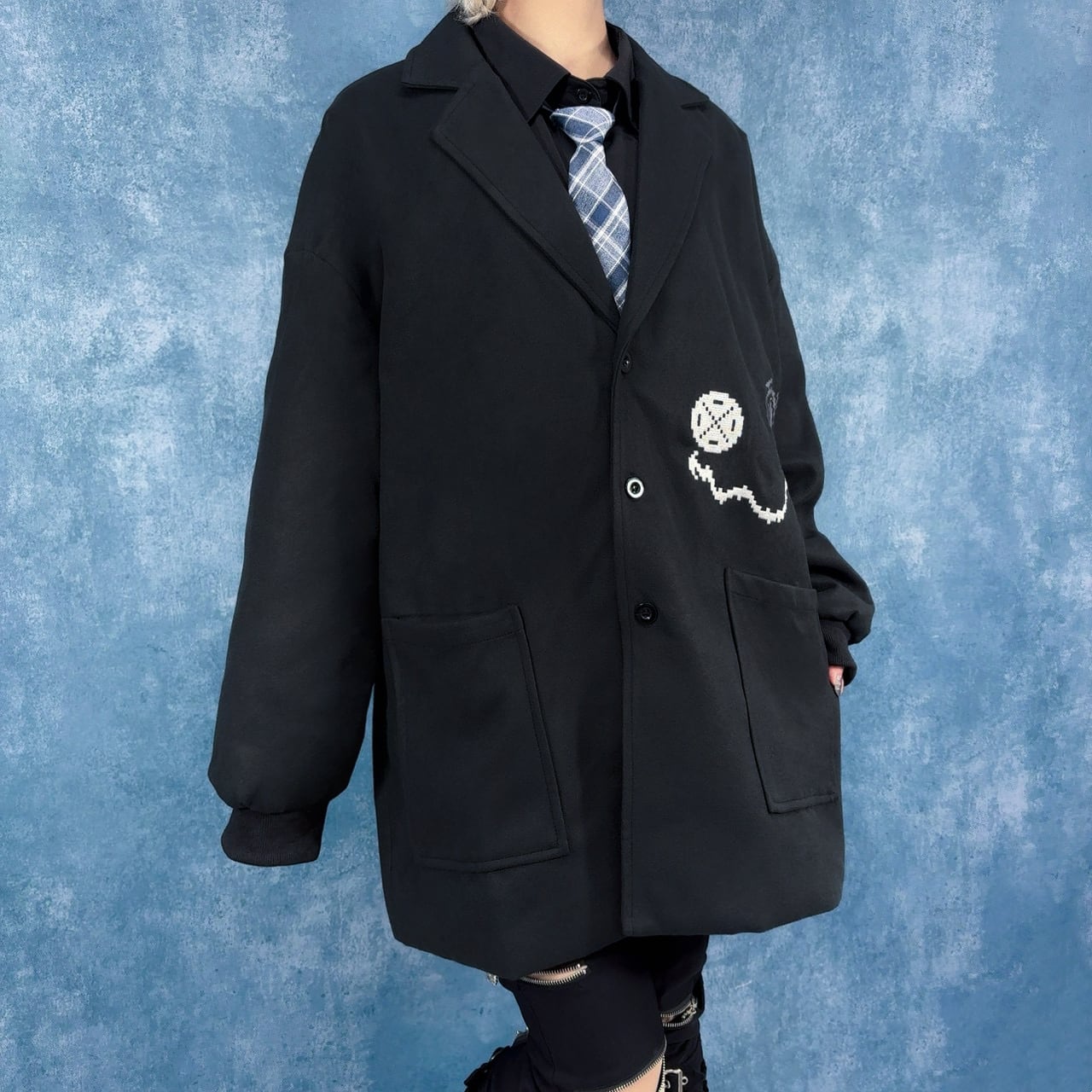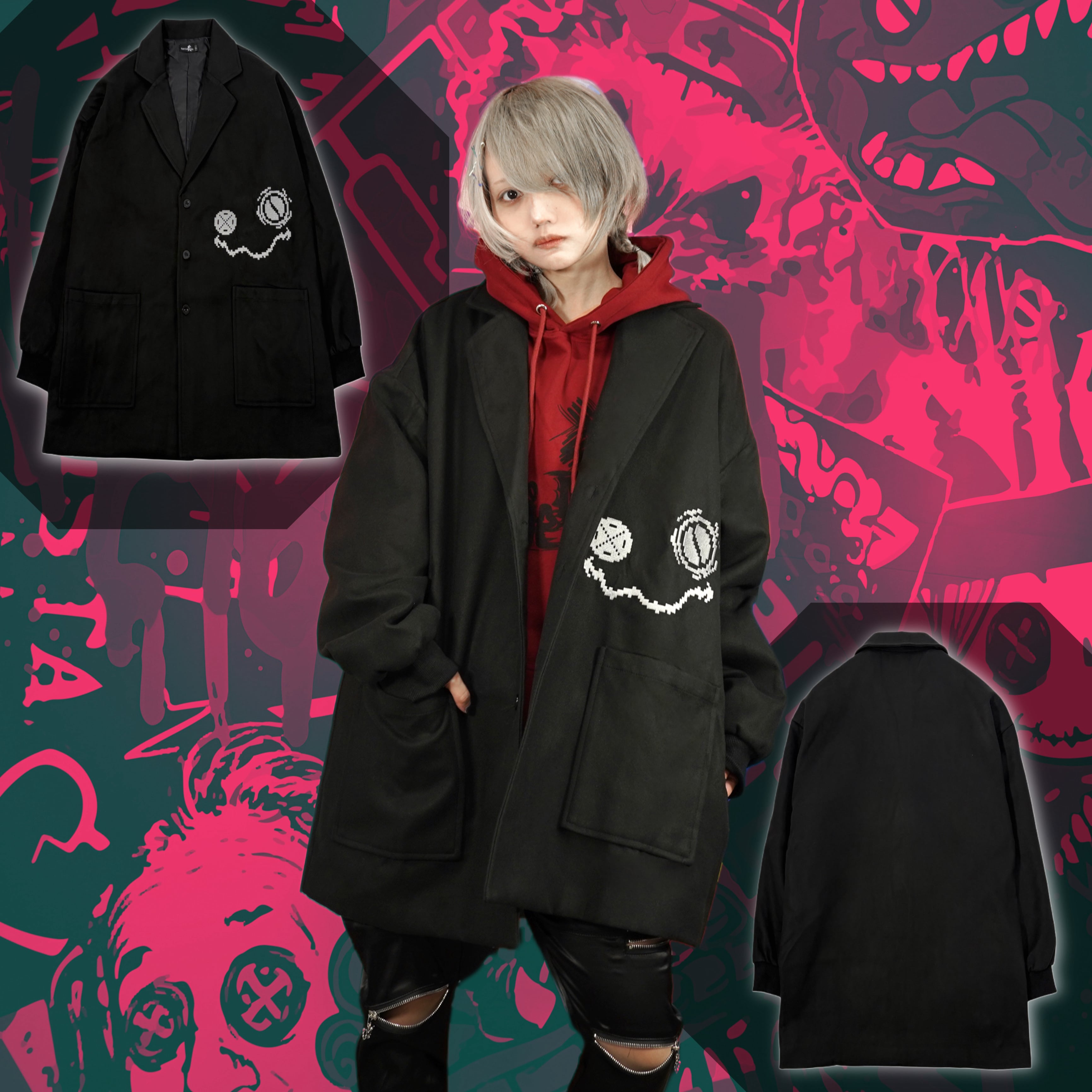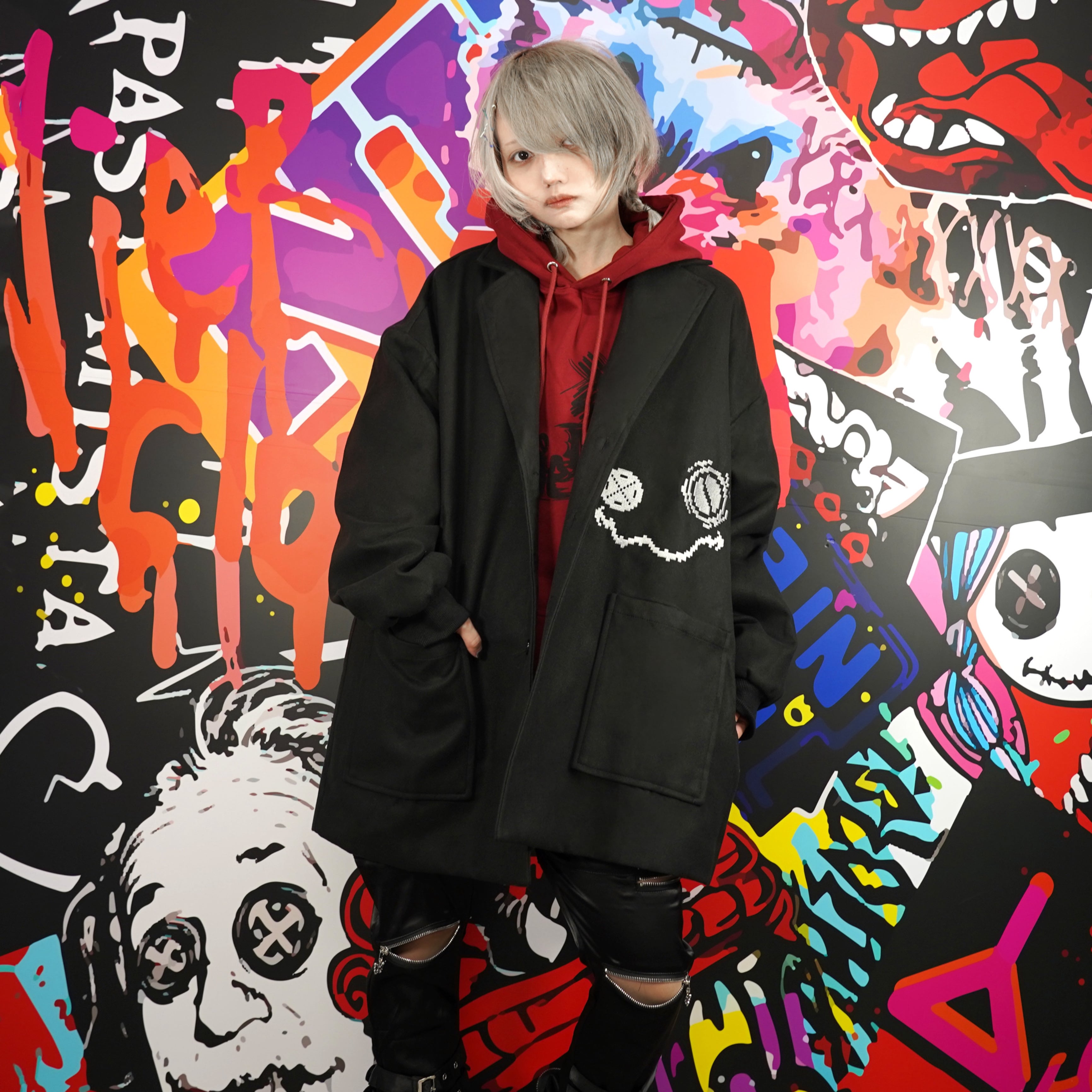 《11月11日限定目玉大特価》ドットフェイス刺繍入りオーバーサイズBLACKコート