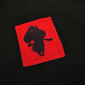 赤黒グラフィックのイラストパッチワークを大胆に配置。