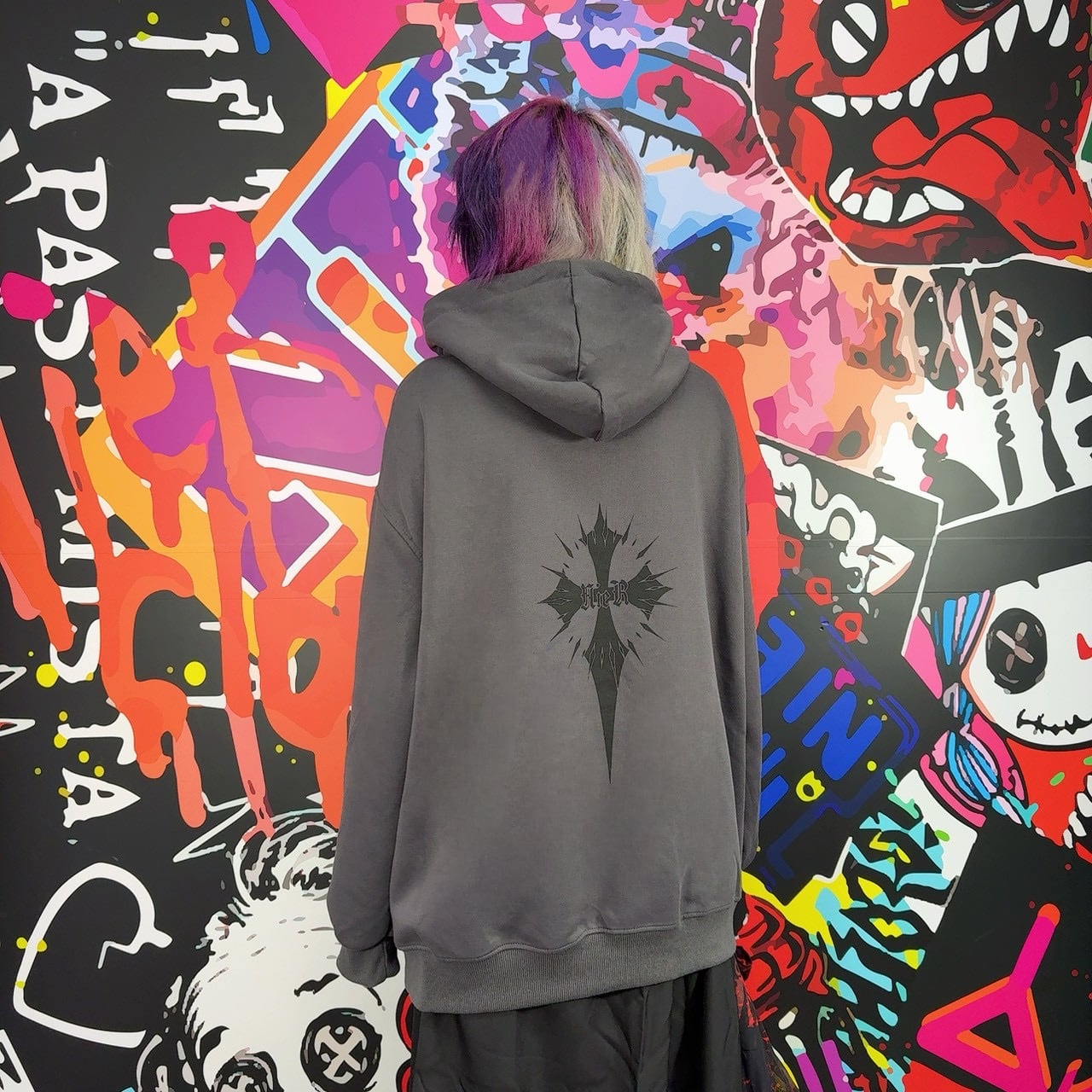ストリート×ダークの王道を体現した、普段着にもステージ衣装にも使える1枚です。