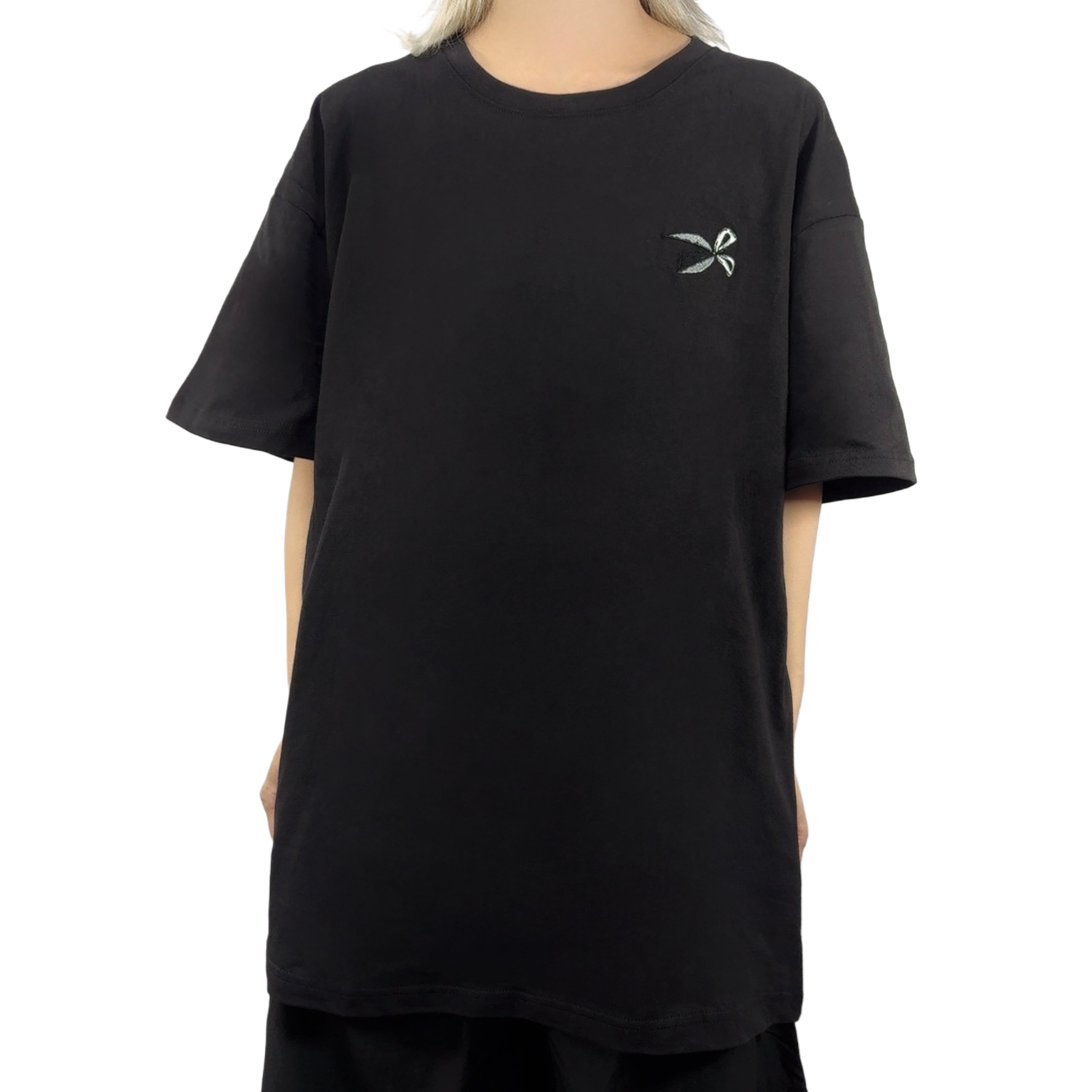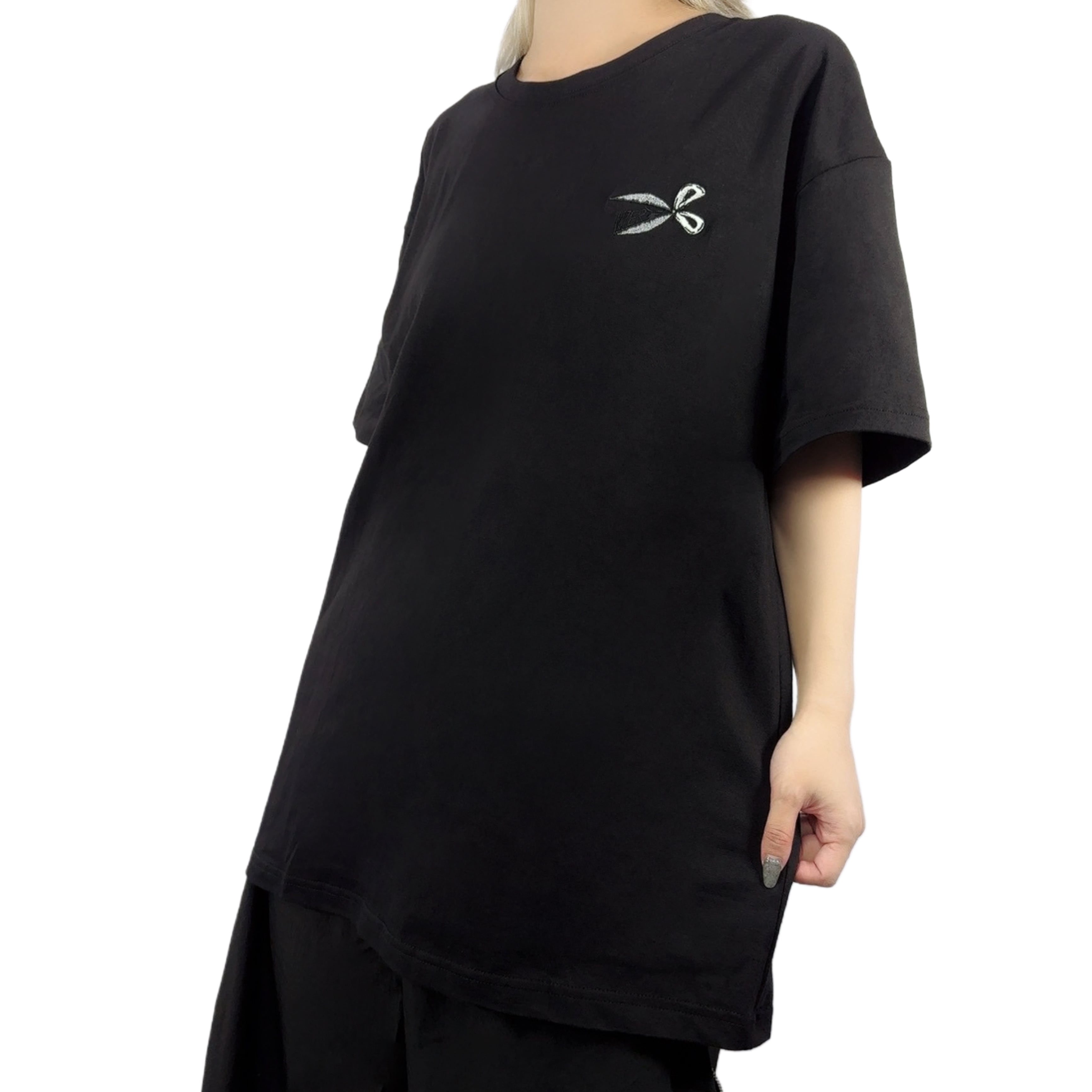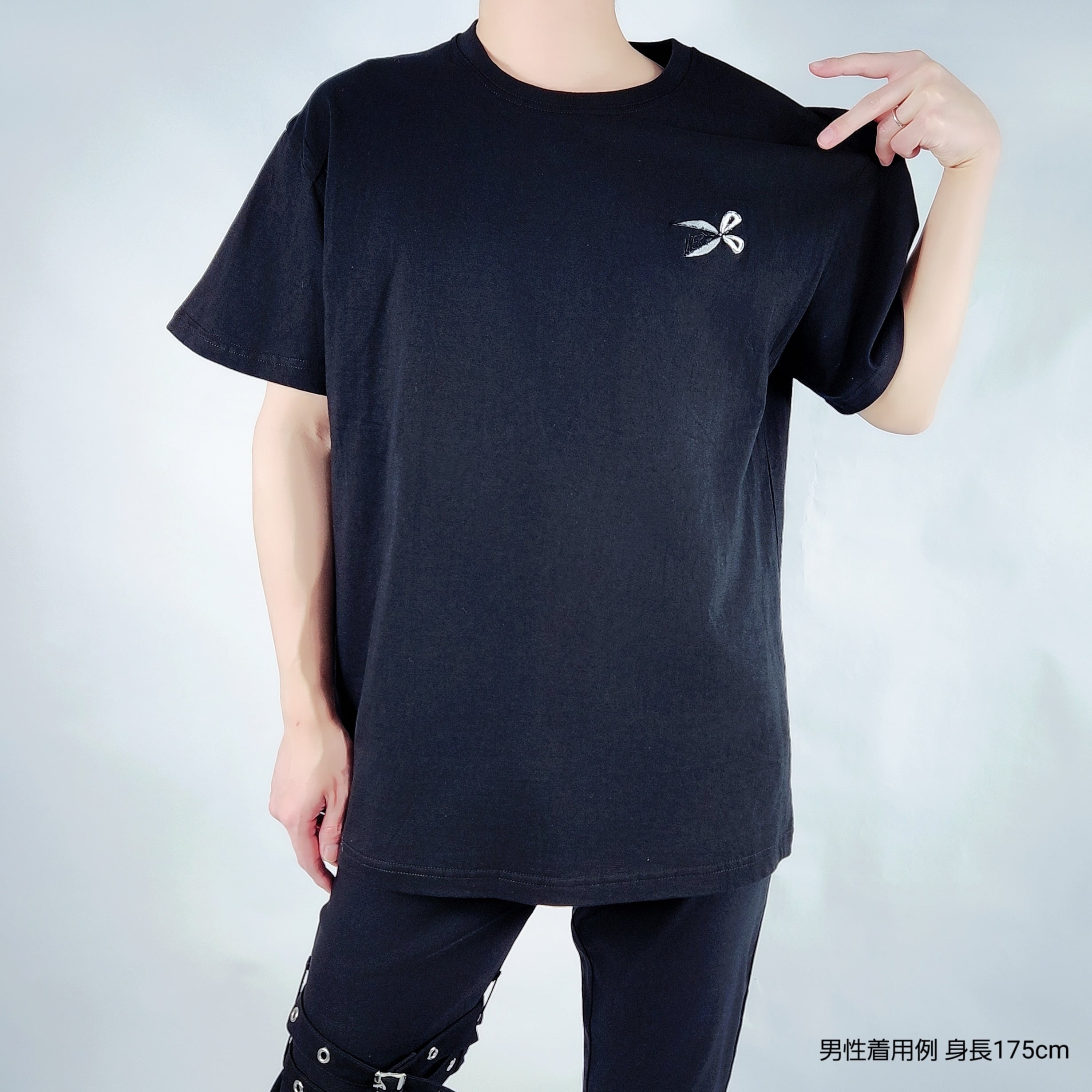 シンプルながら存在感を放つ、ハサミモチーフ刺繍が胸元で輝くブラックTシャツとなっております。