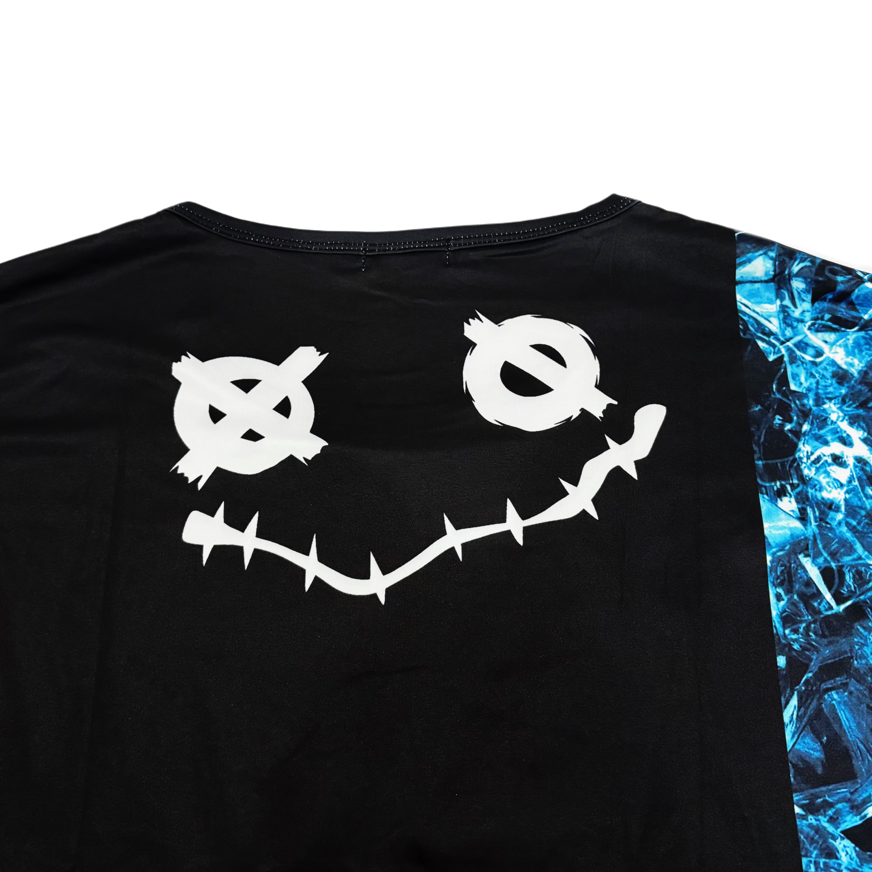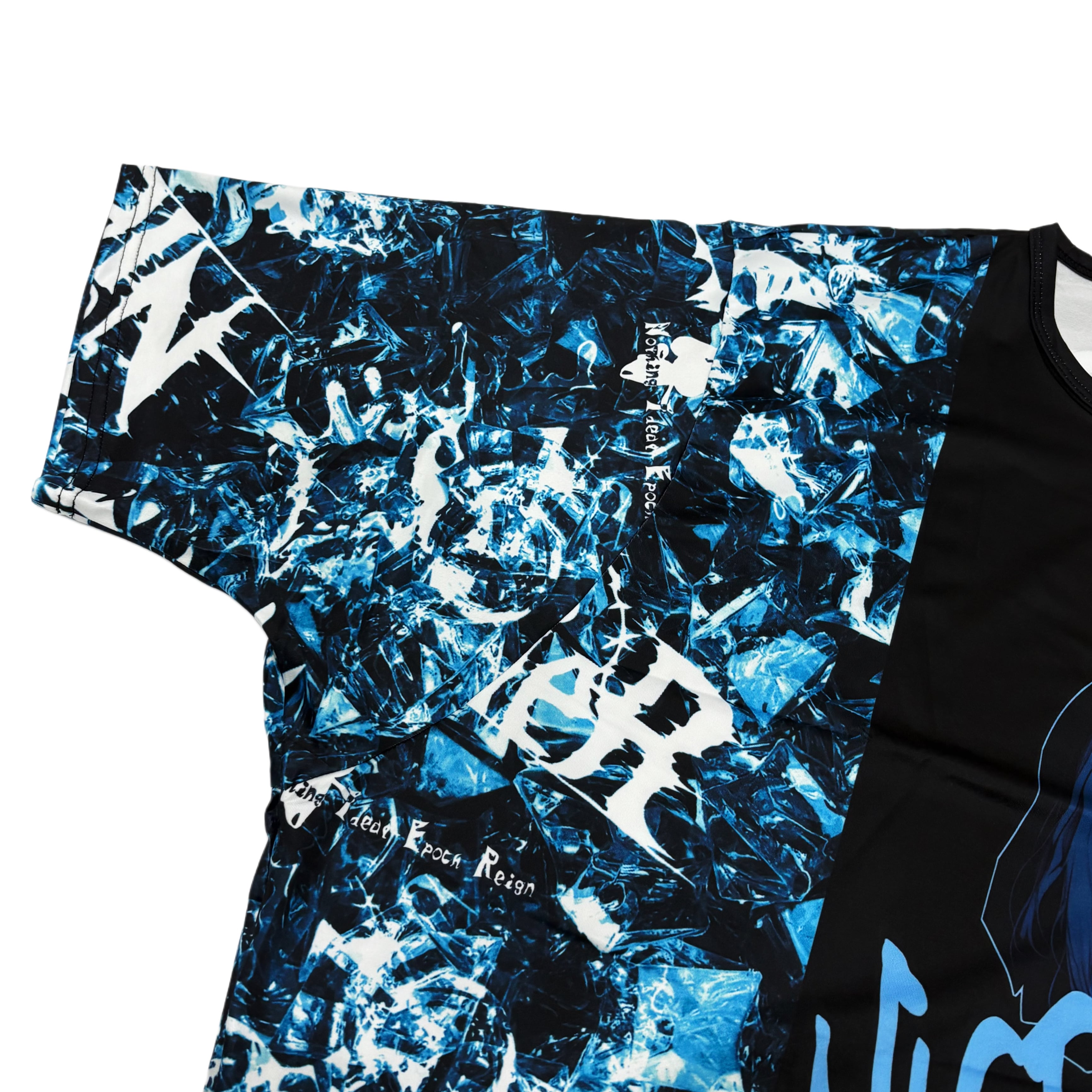 闇に沈むようなブラックボディに、氷の欠片が砕け散るようなブルーグラフィックを大胆に掛け合わせた唯一無二のデザイントップスです。