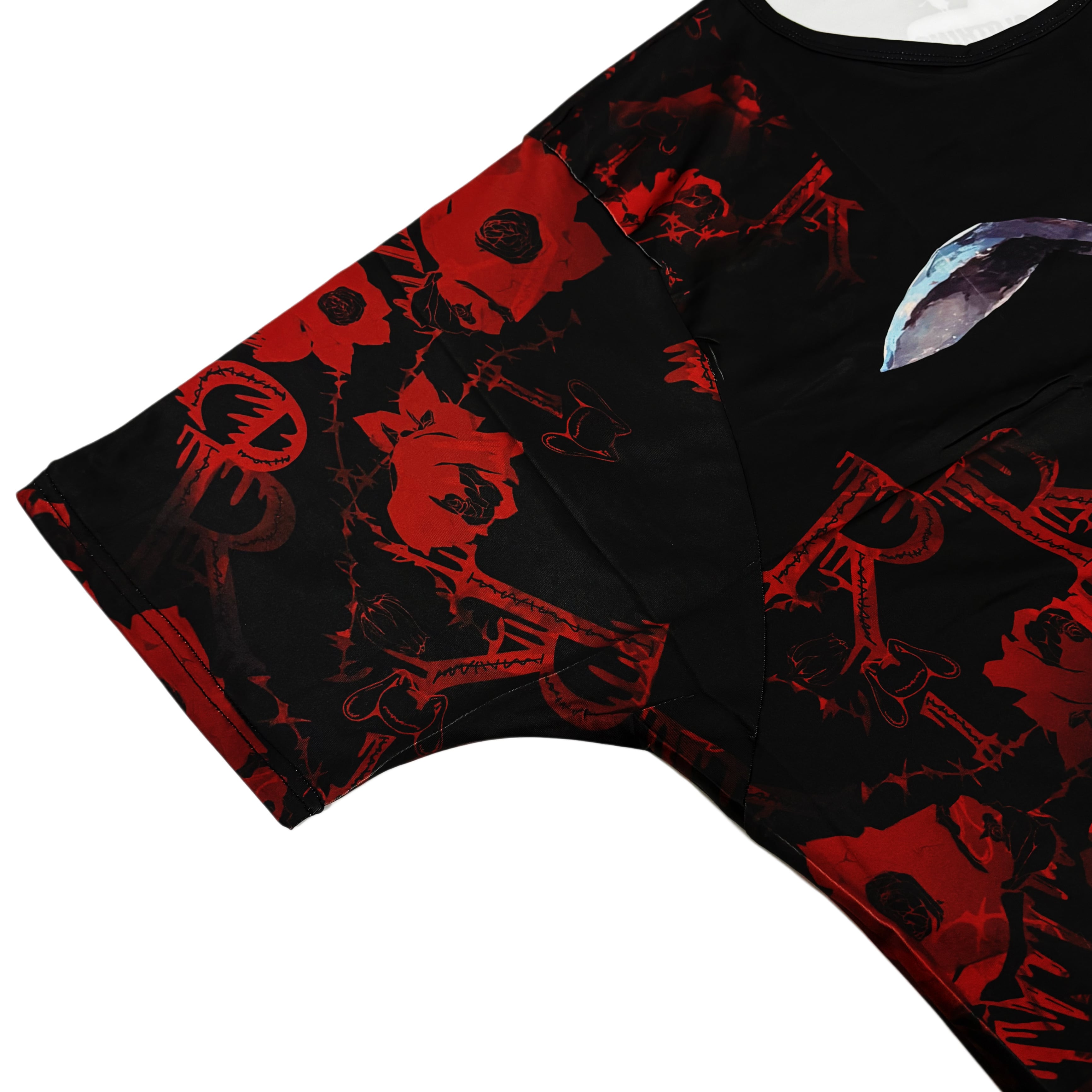 方袖には薔薇が連なるダークな総柄プリントを施し、唯一無二のゴシックスタイルを演出します。