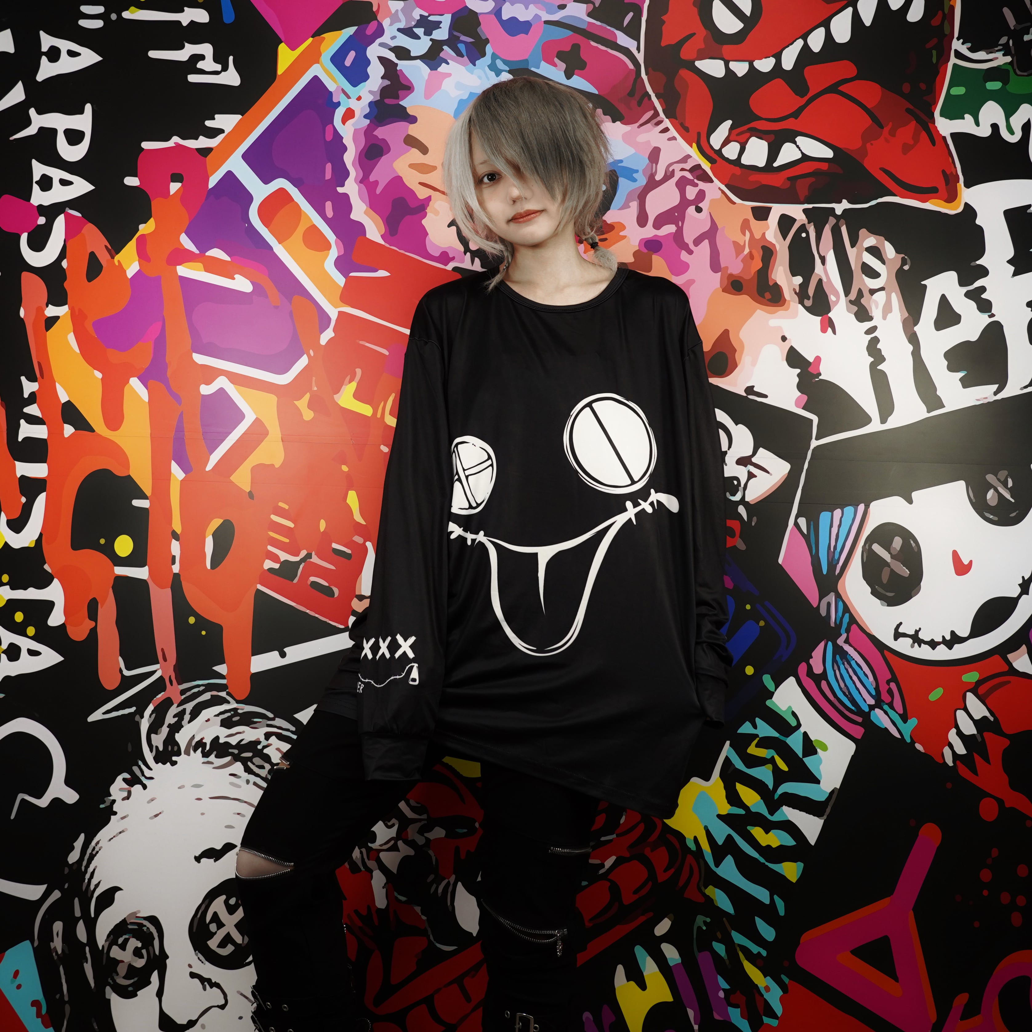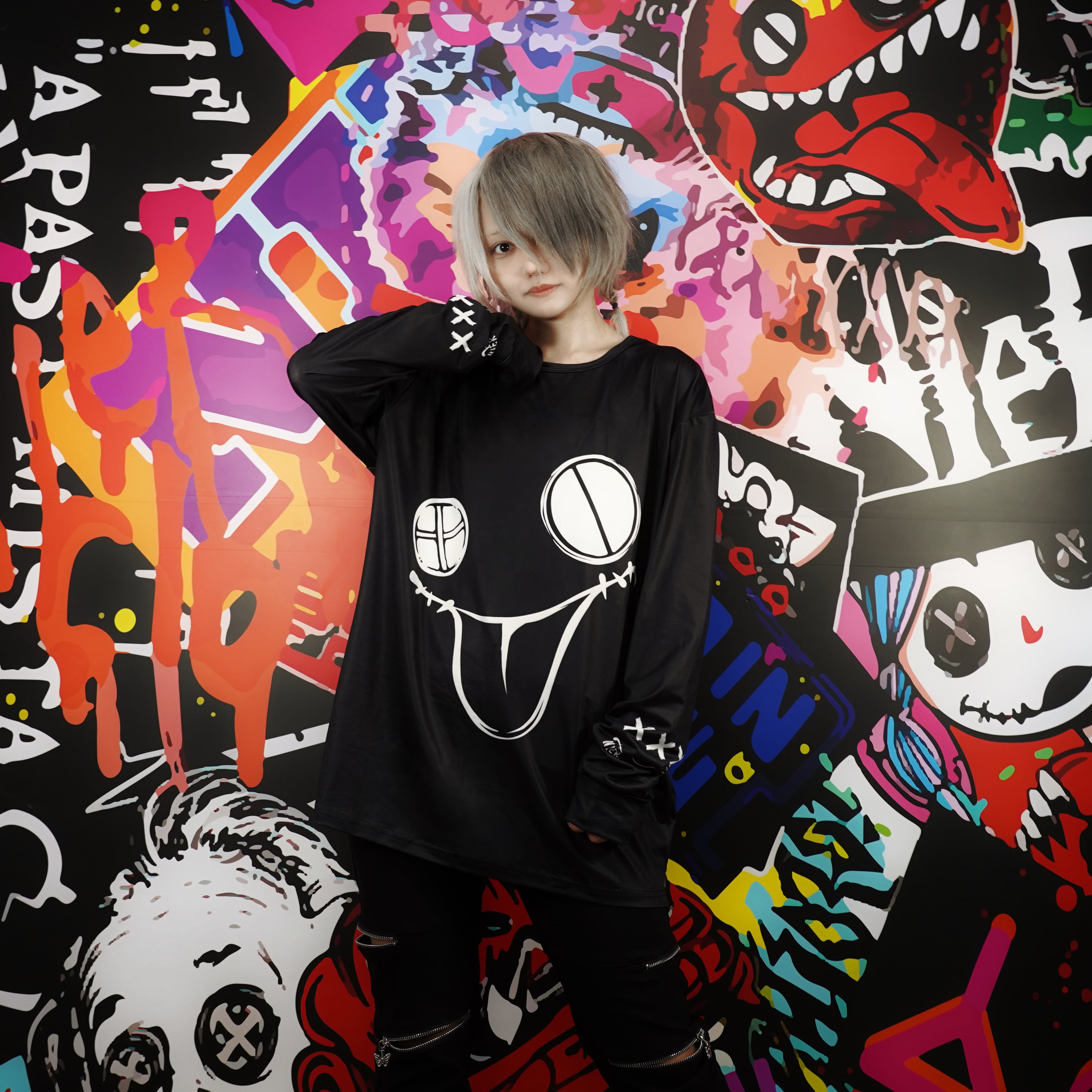 袖にまで施されたフェイスデザインが圧倒的存在感を放つオーバーサイズトップスが登場。