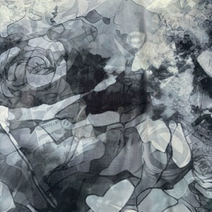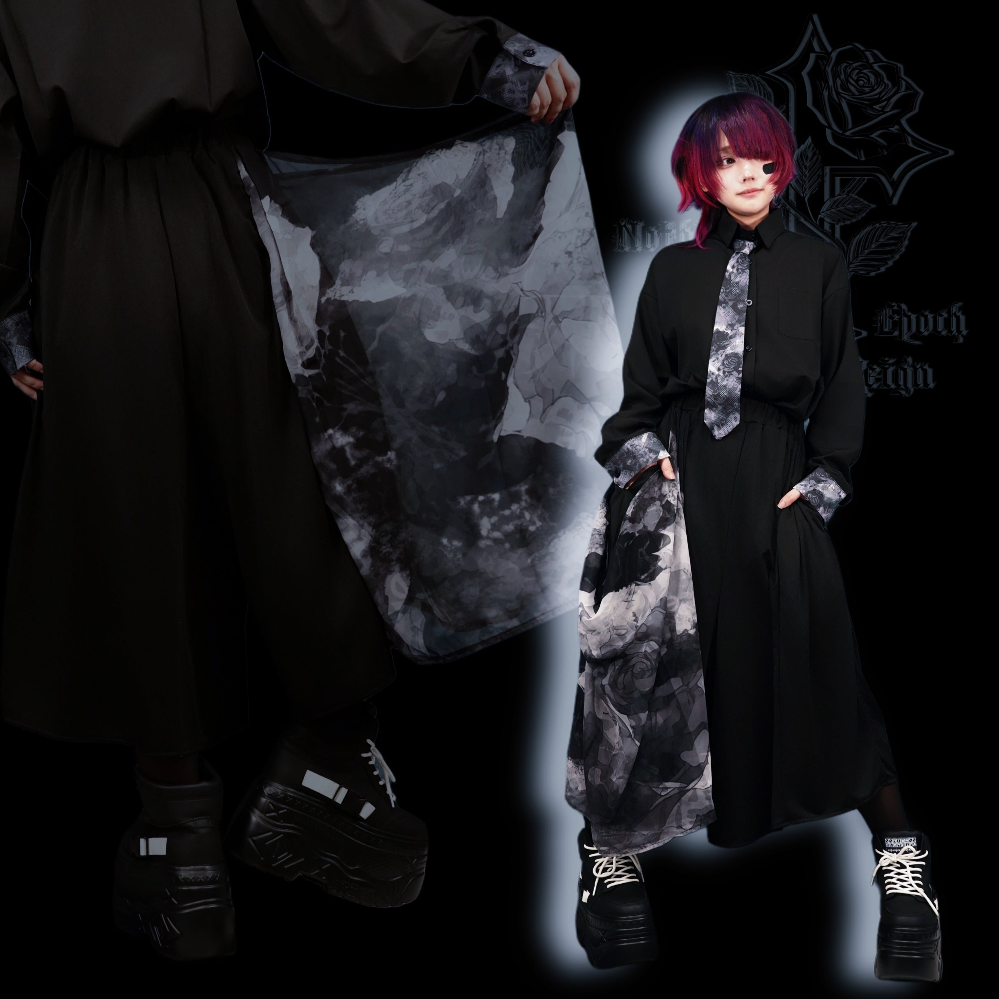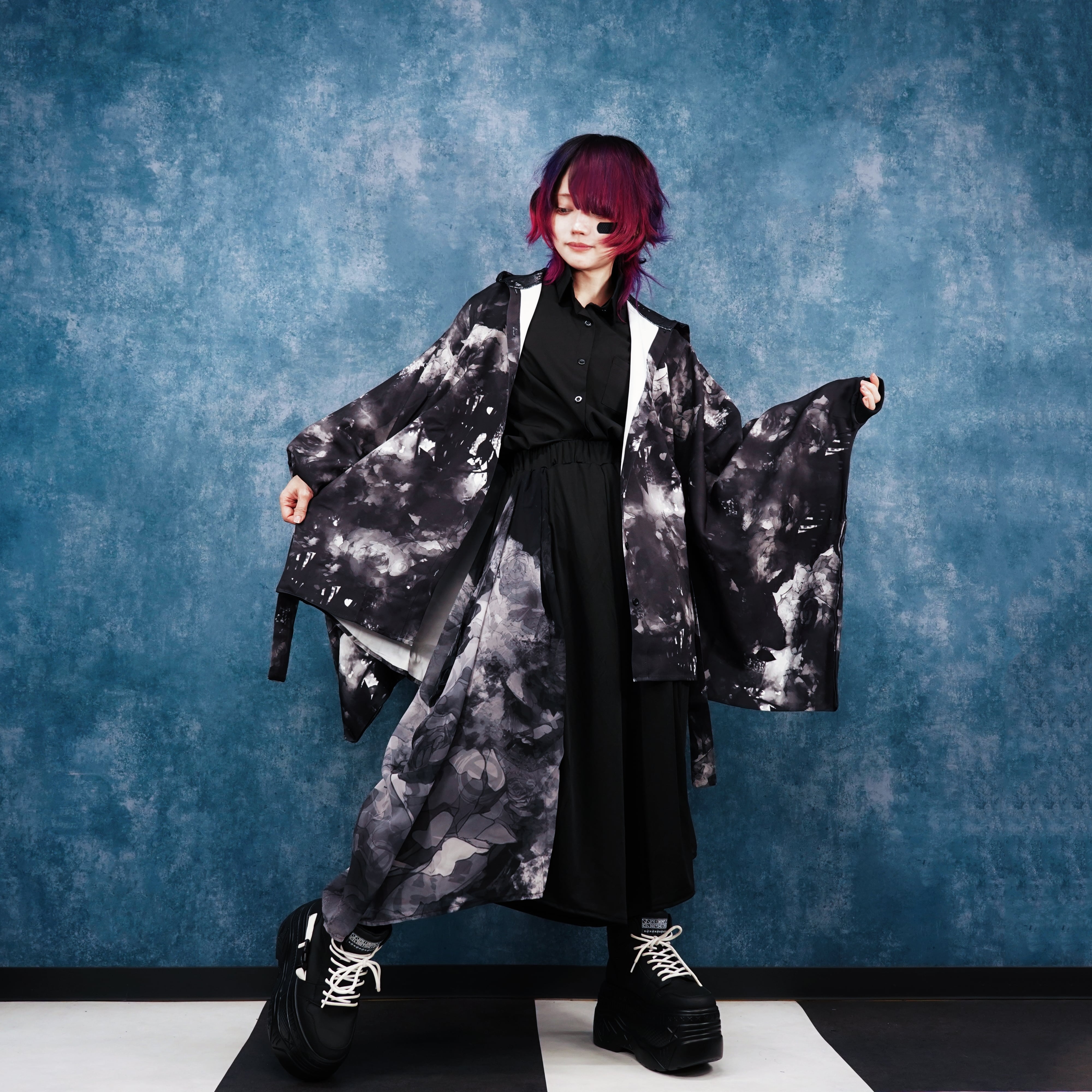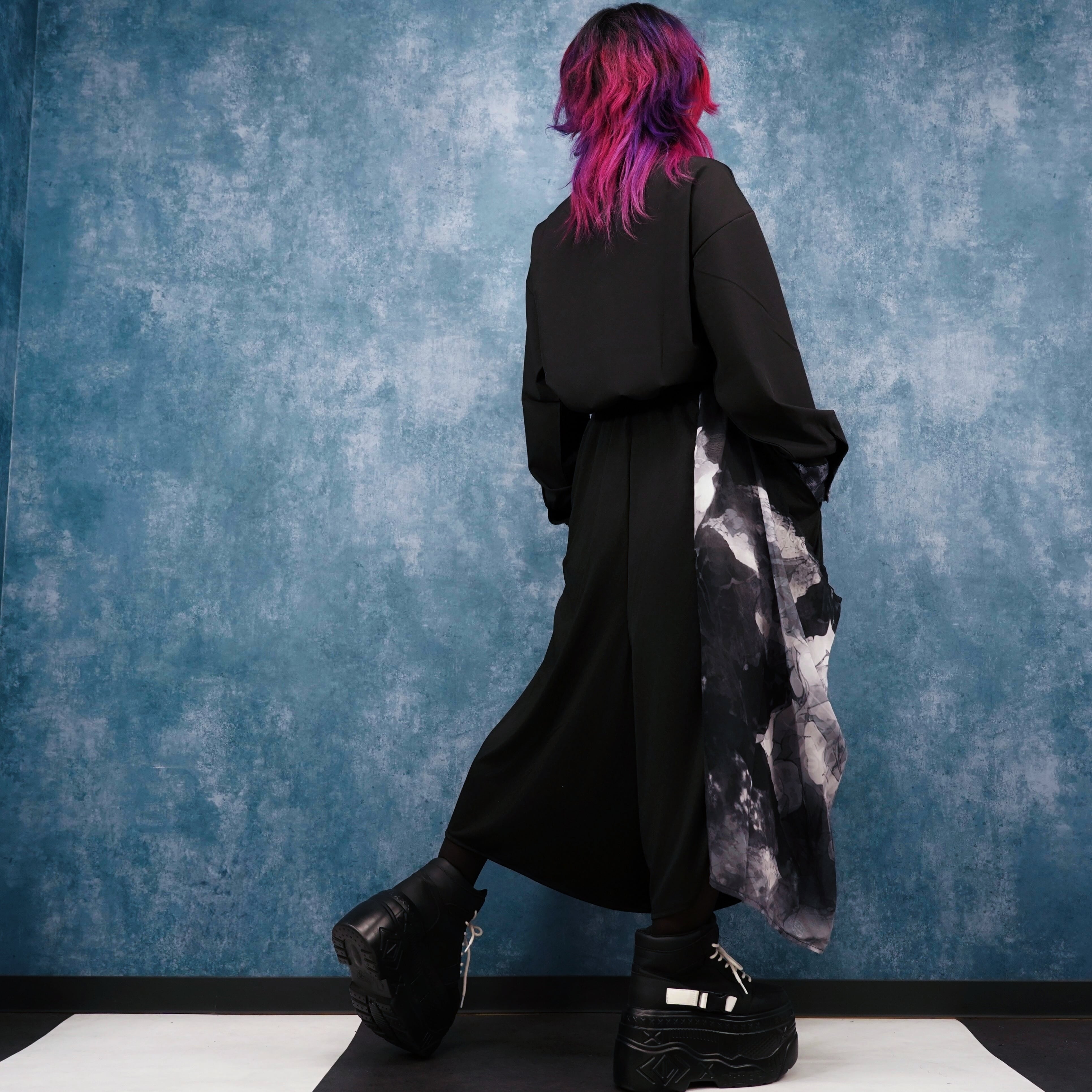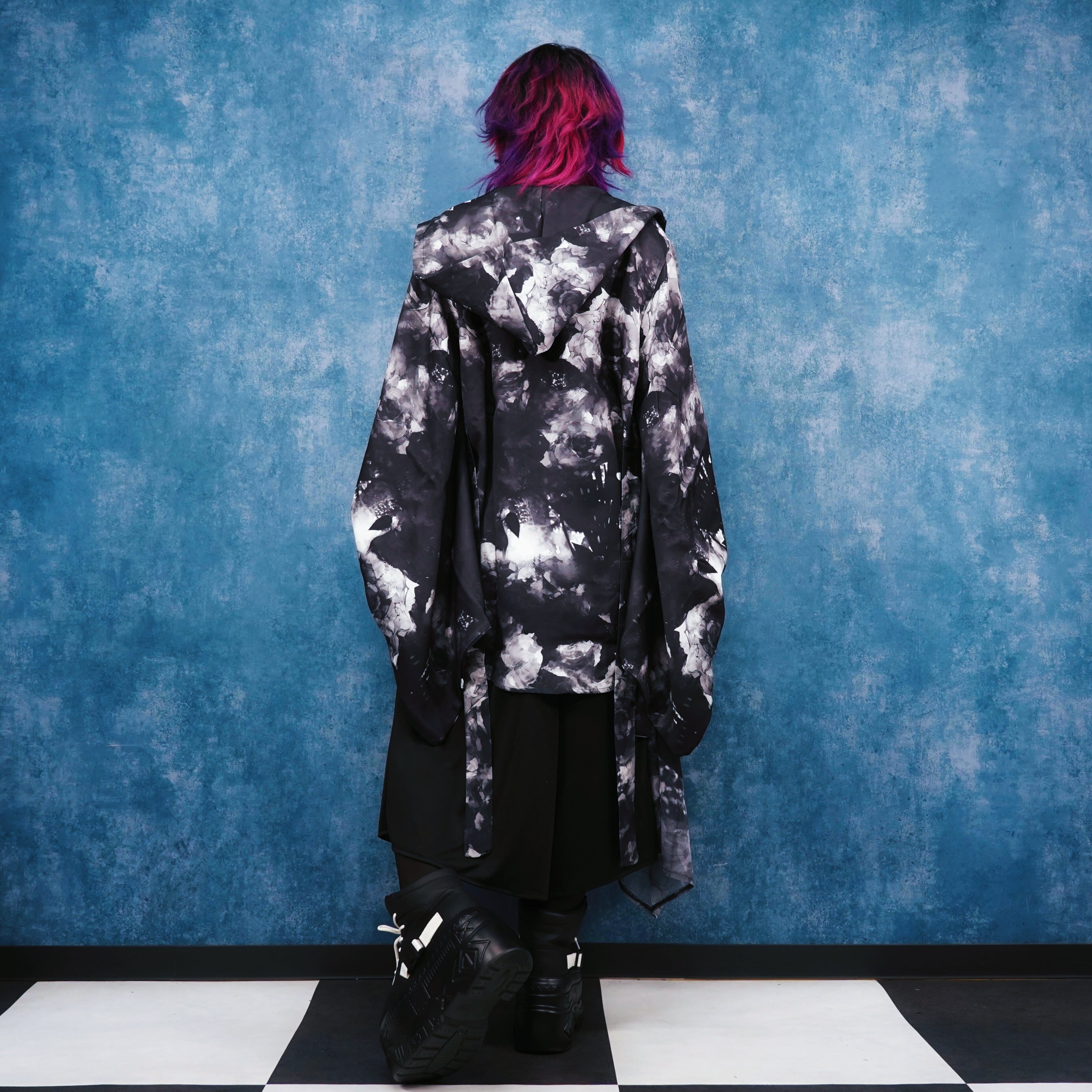 ・フード×袖リブ付き着物風袖総柄シャツ【MONOCHROME ARTISTIC ROSE】