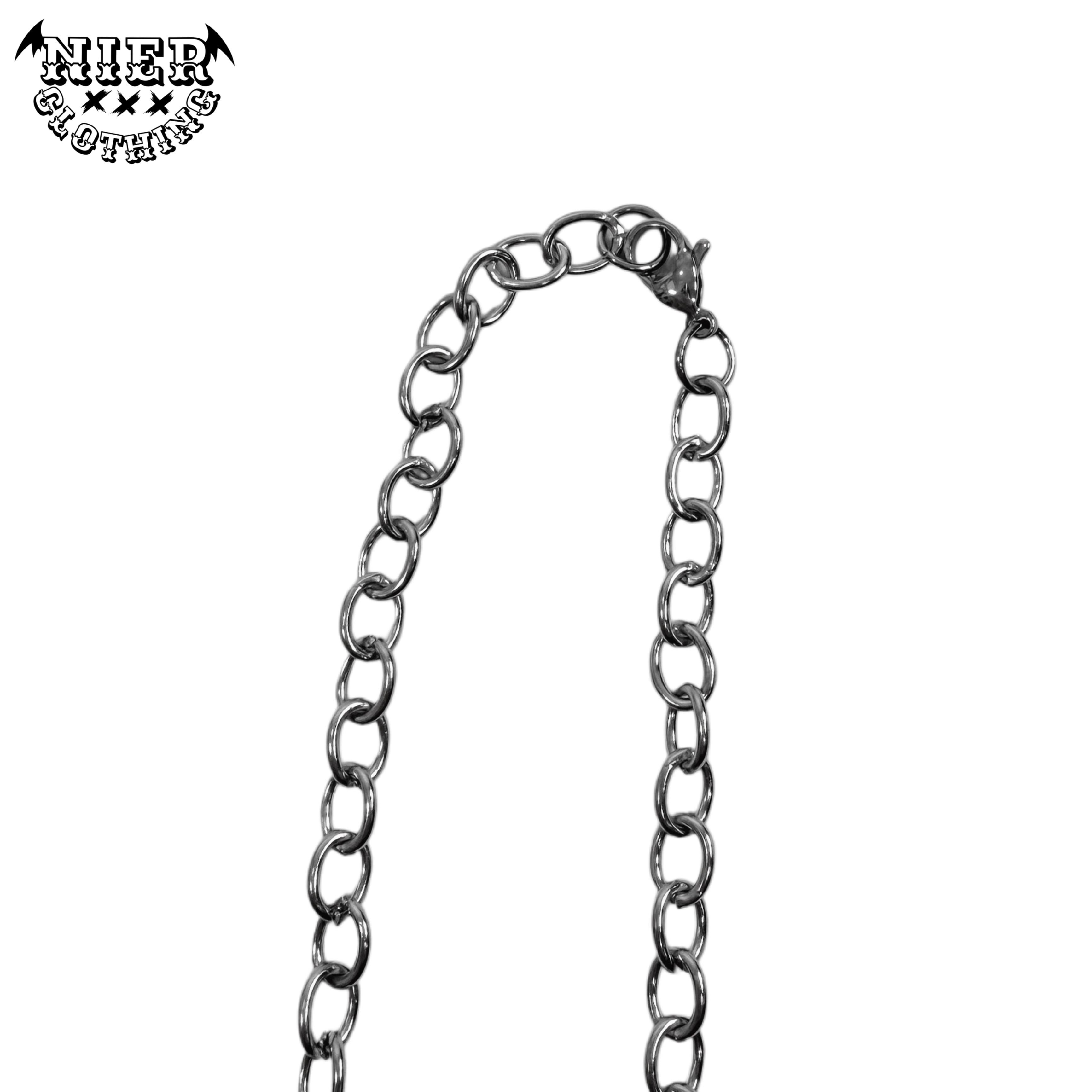 重厚感のあるシルバーネックレスはコーデを一瞬でダーク&ゴシックに仕上げてくれます。