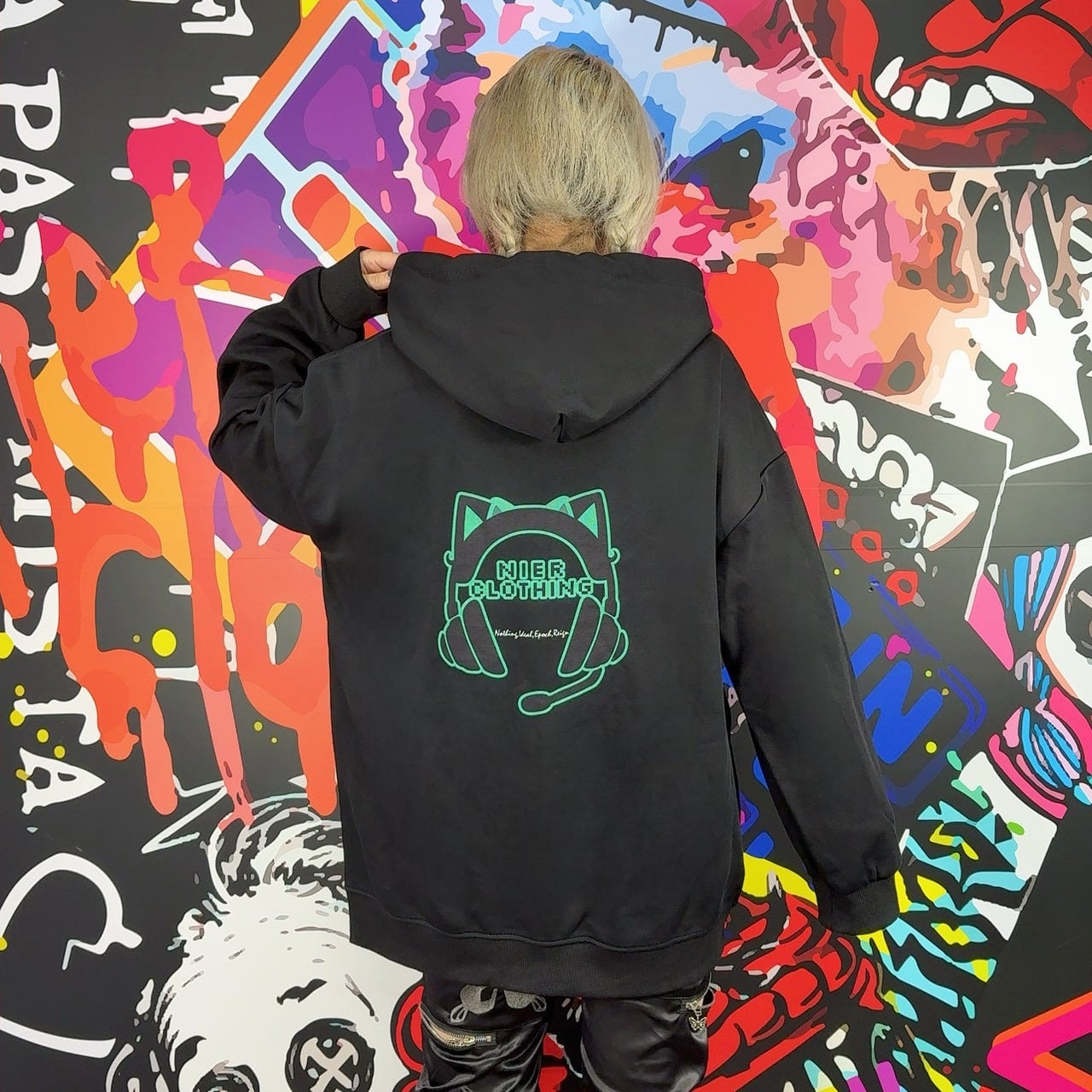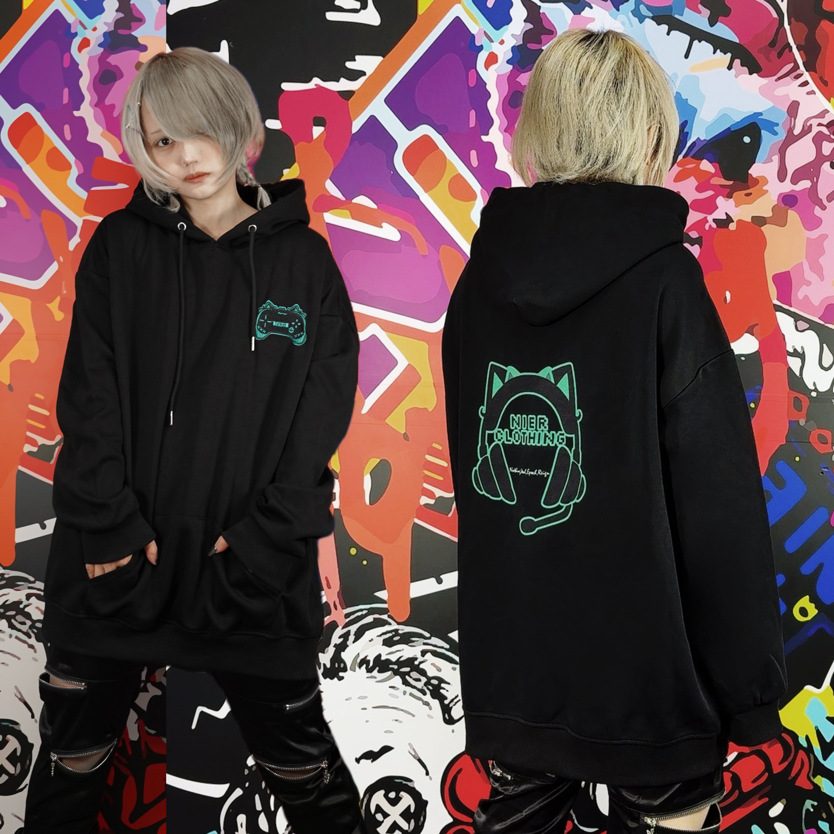 胸元にはコントローラー、背面にはヘッドホンのNIERロゴデザインが大胆に配置されたファン必見の1枚です。
