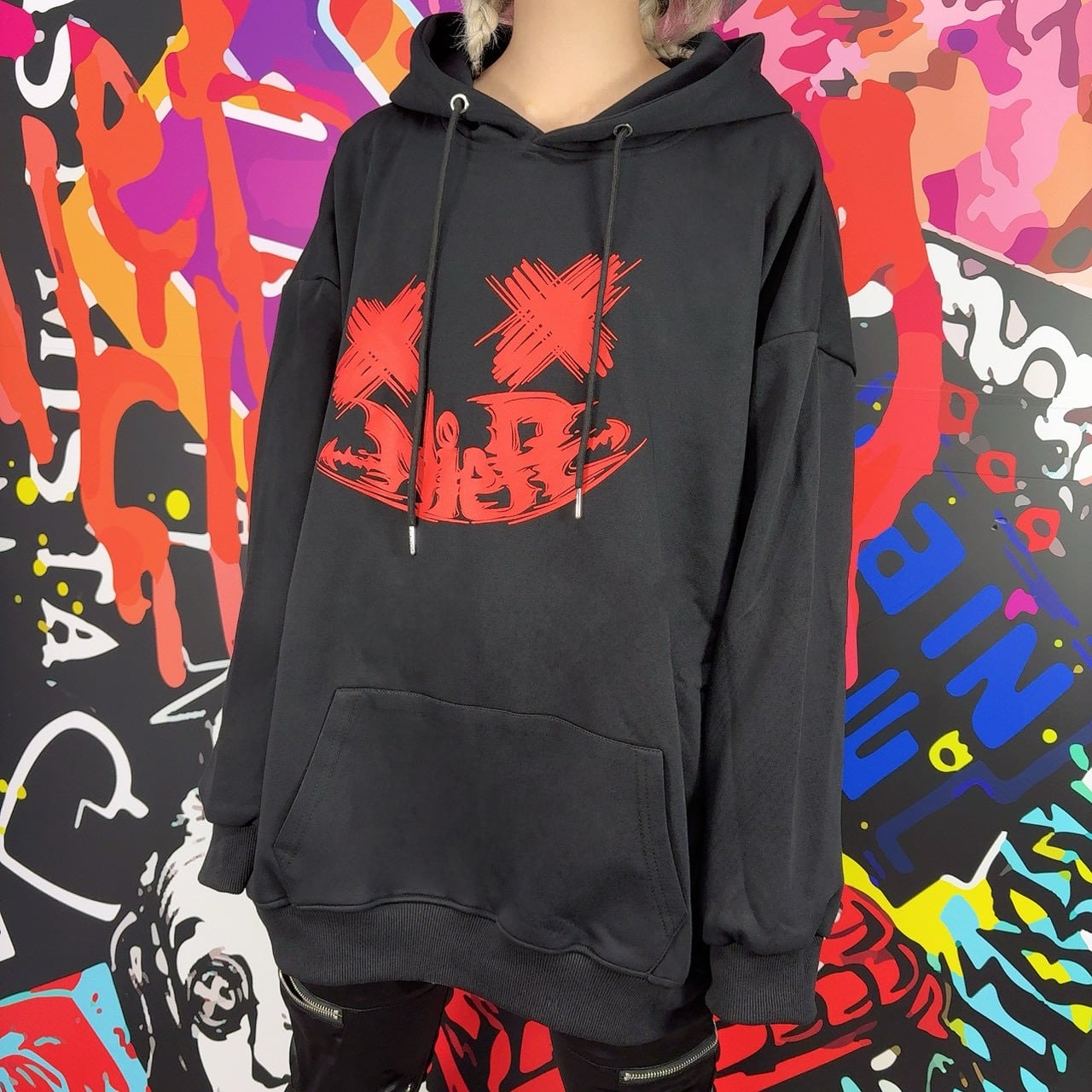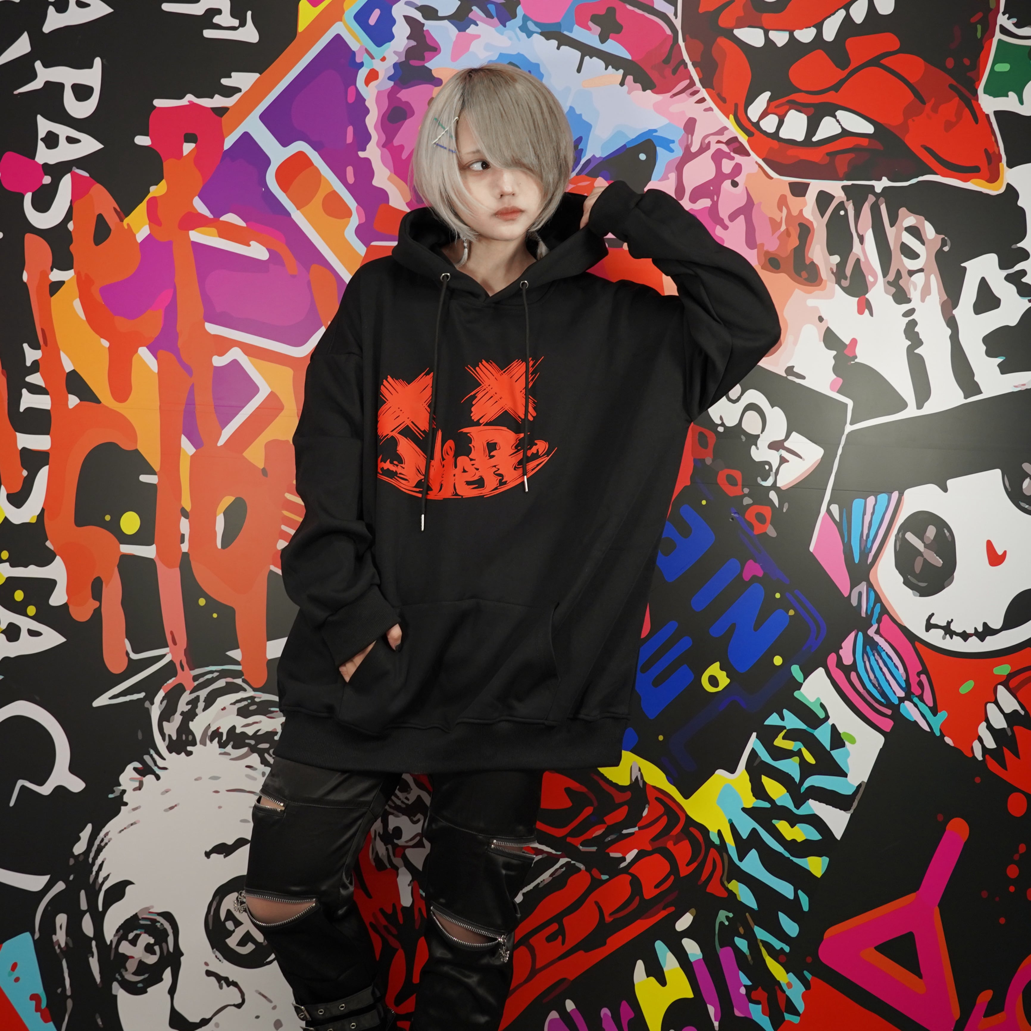 フロントに施されたフェイスロゴのグラフィックが圧倒的存在感を放つ、闇かわストリートパーカーです。