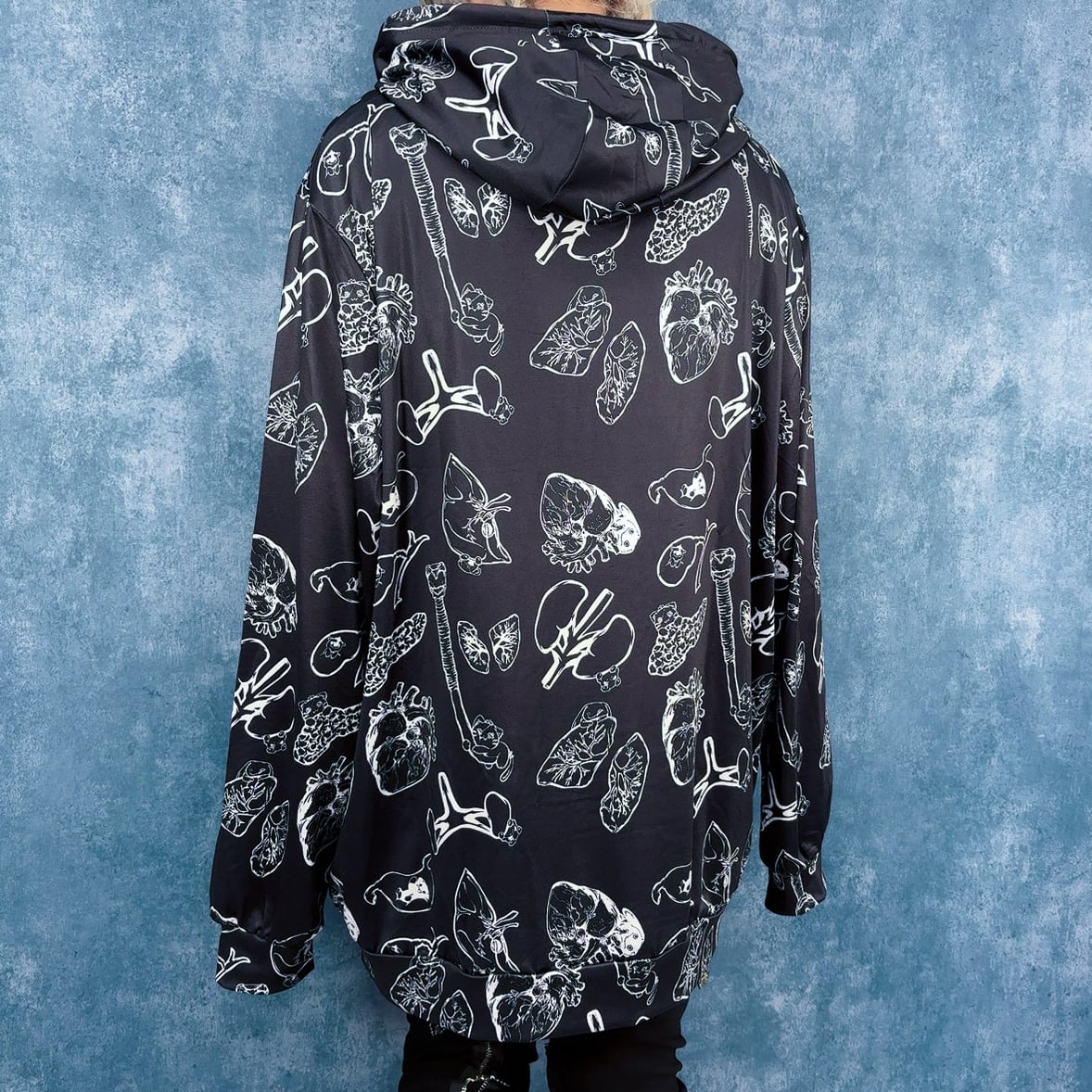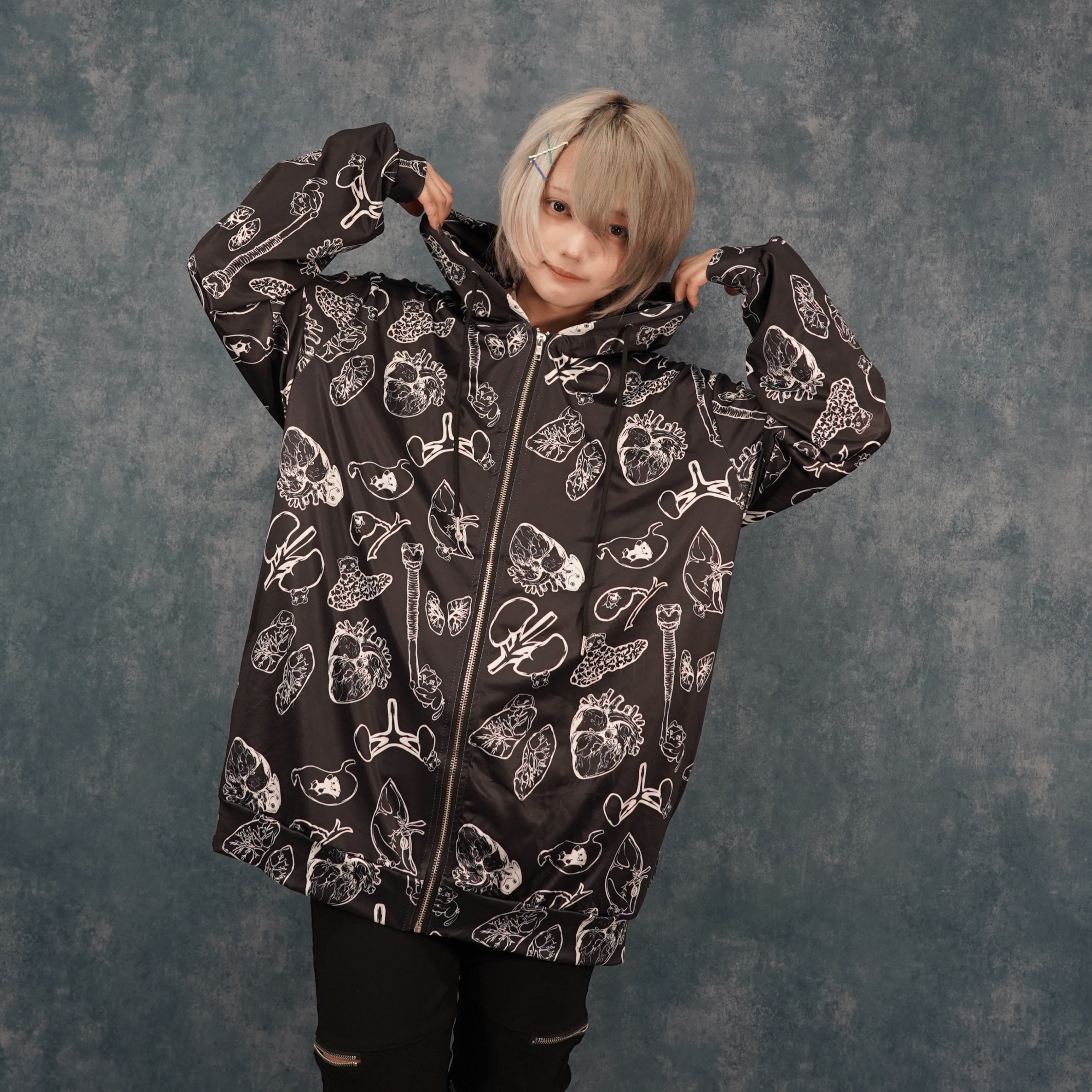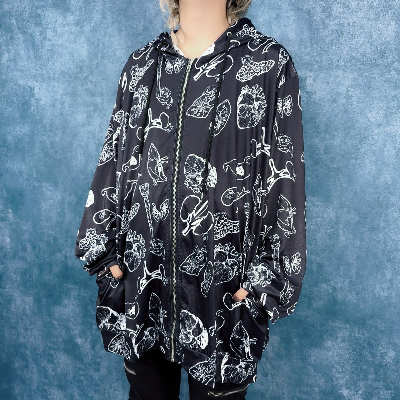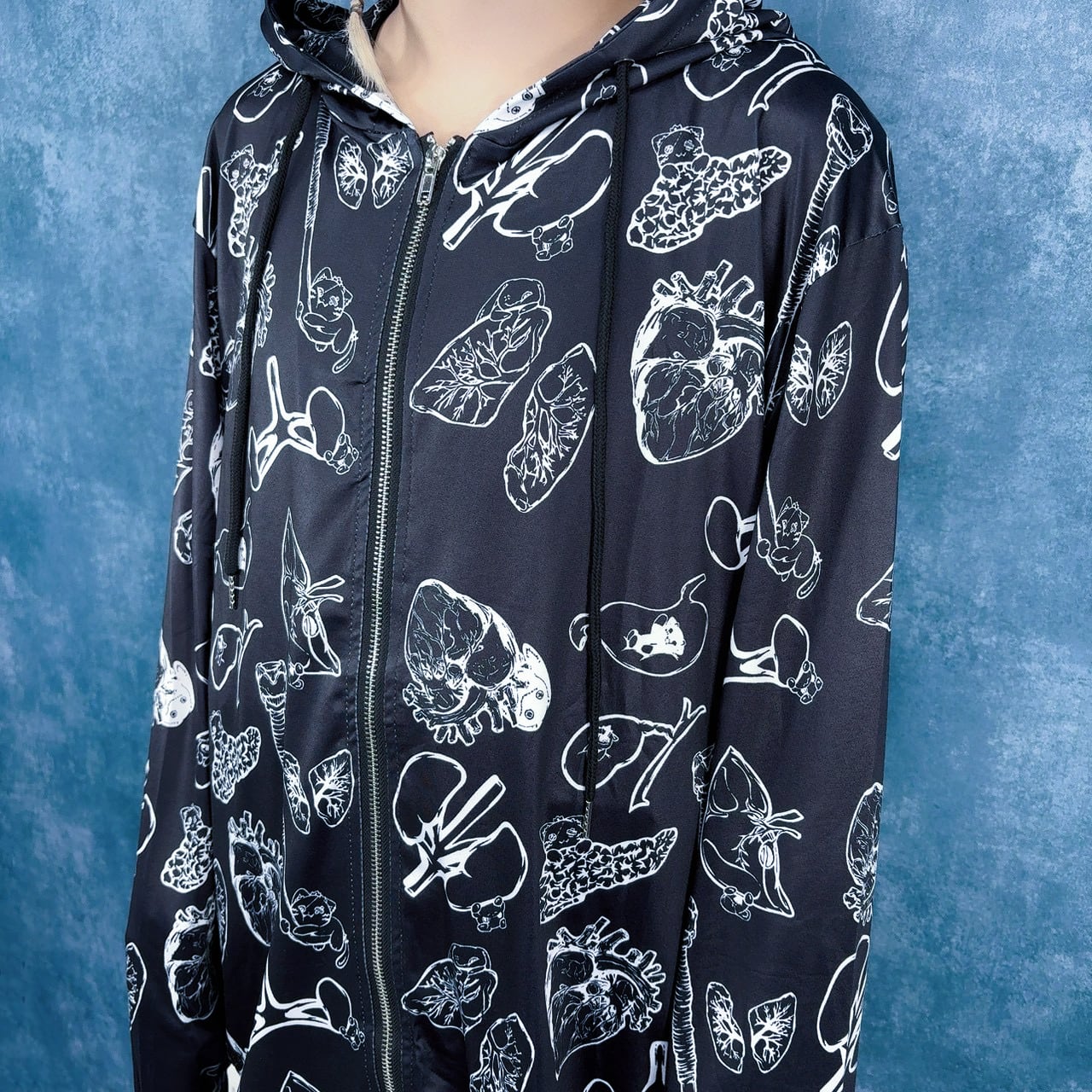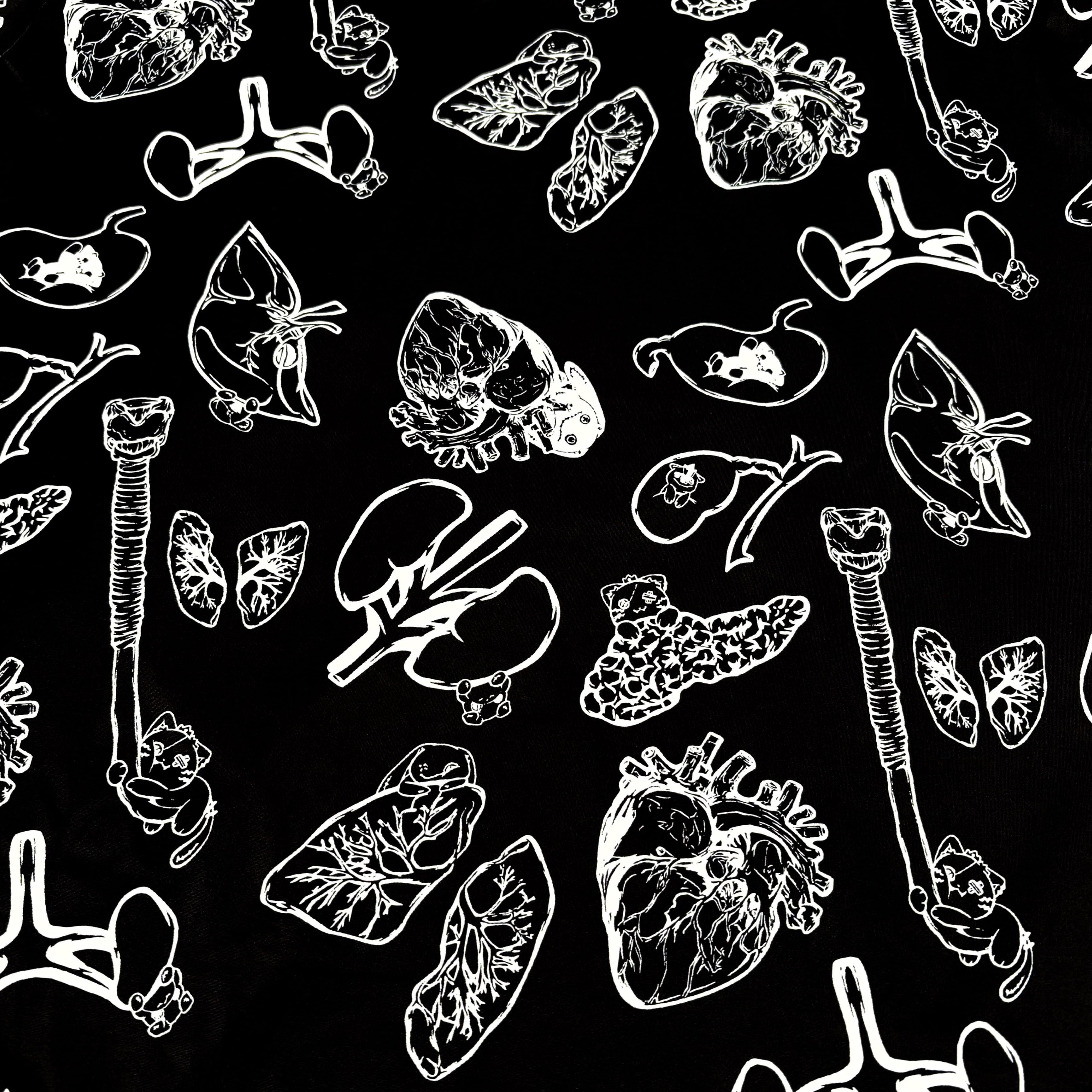 ブラックベースに描かれた、心臓・肺などの解剖学モチーフと、