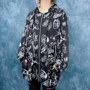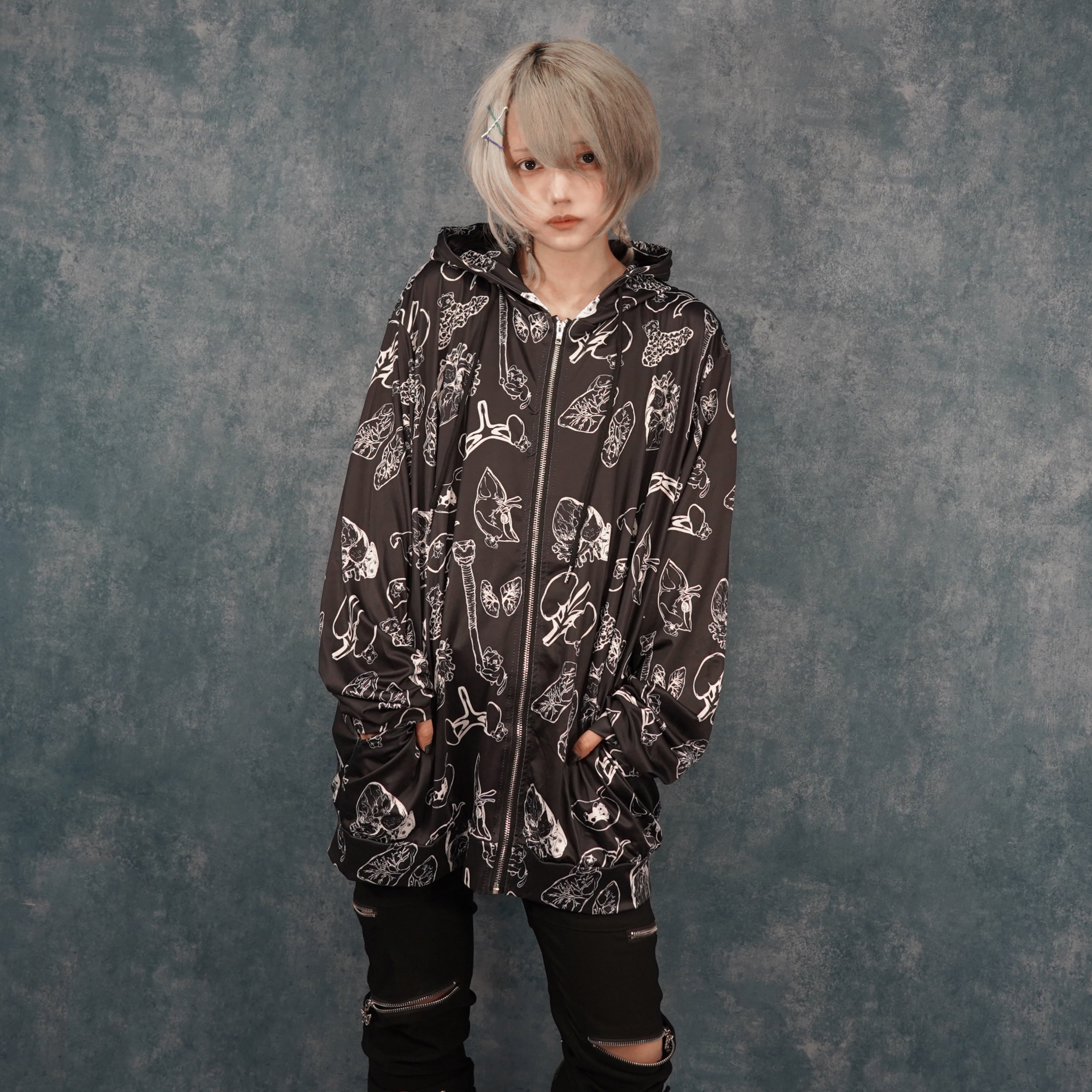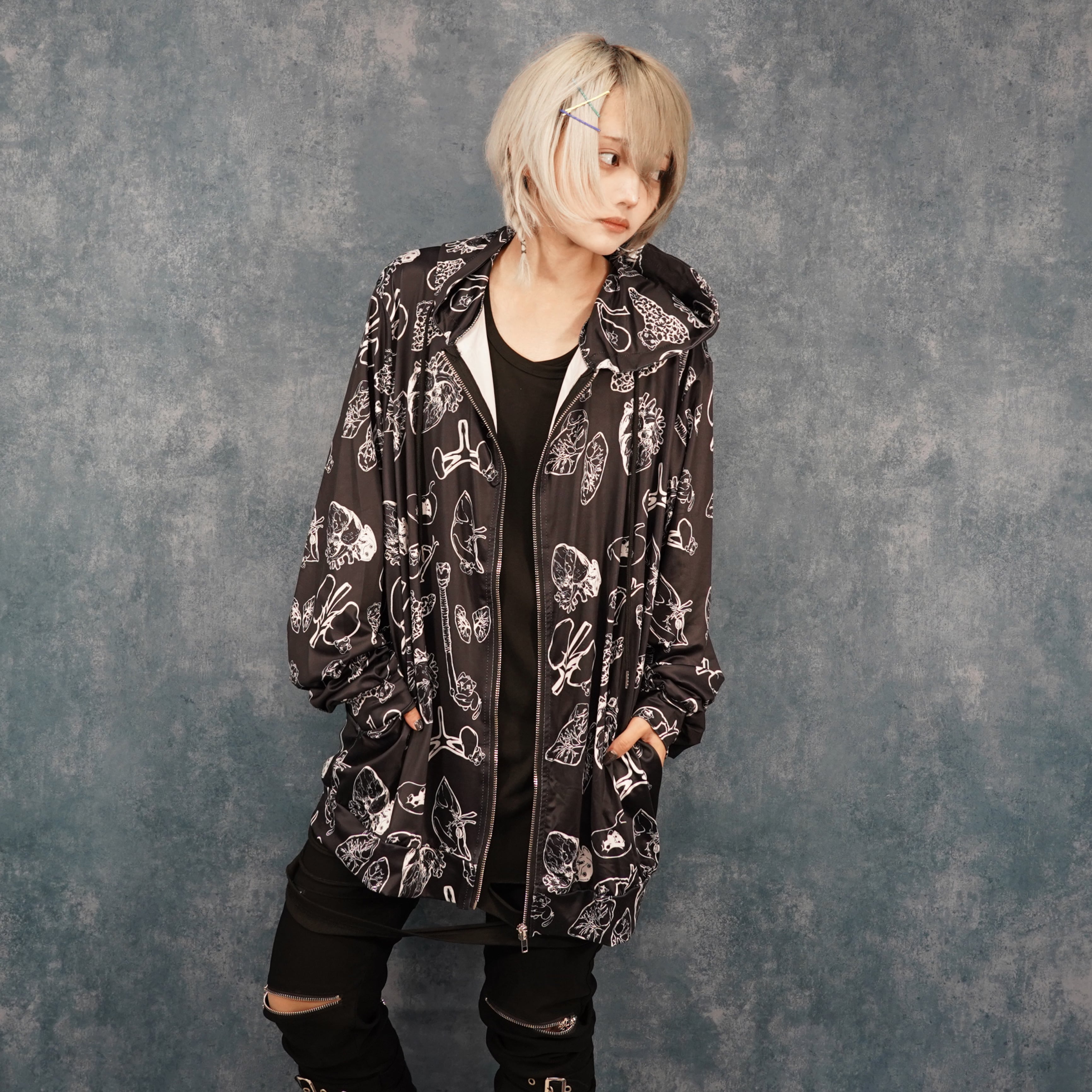 それに紛れるように潜む小さなキャラクターたちが印象的な総柄ジップアウターです。