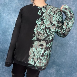 ツートーンになっておりブラック生地と正面左から背面にかけては幻想的な花の総柄が施された印象的な一着です。