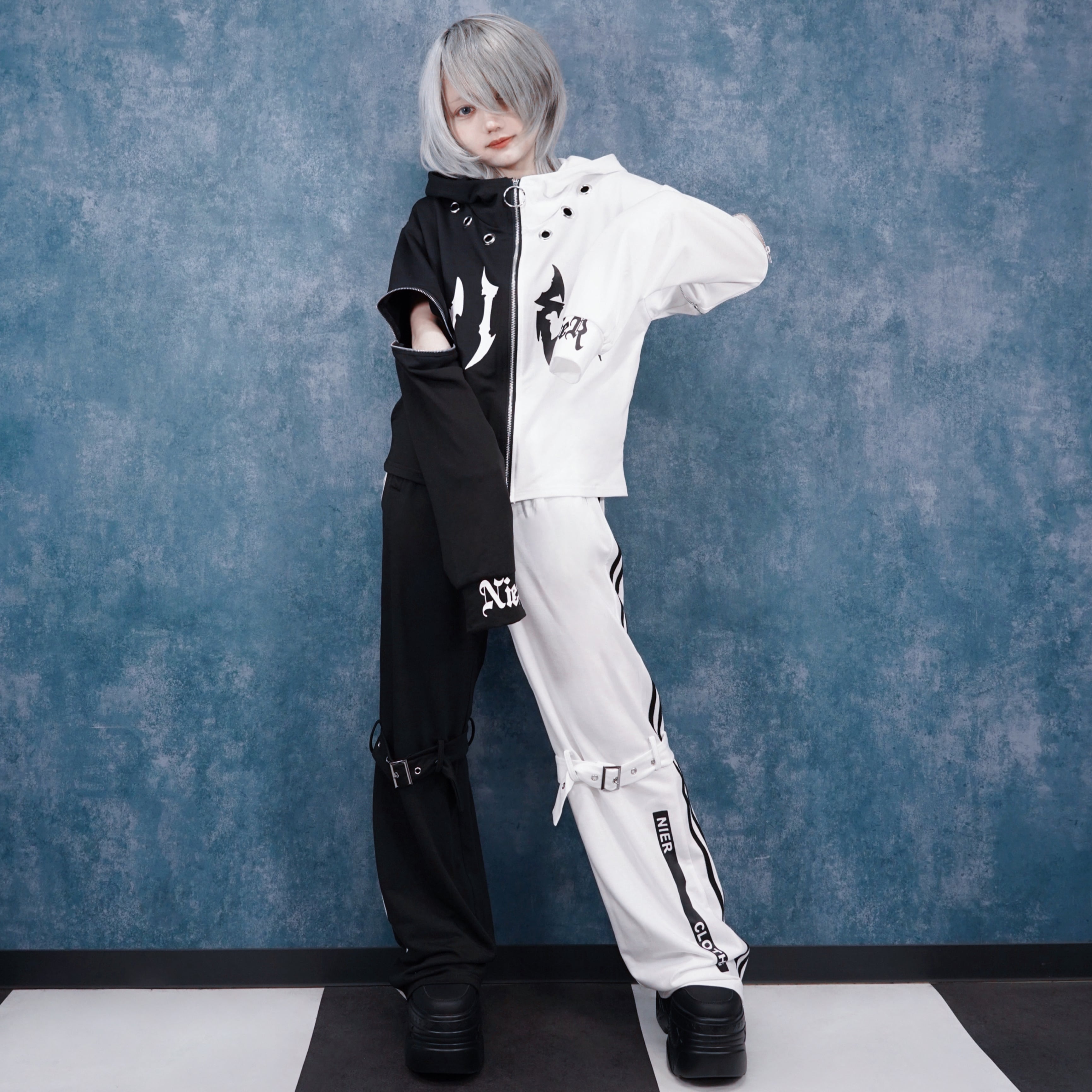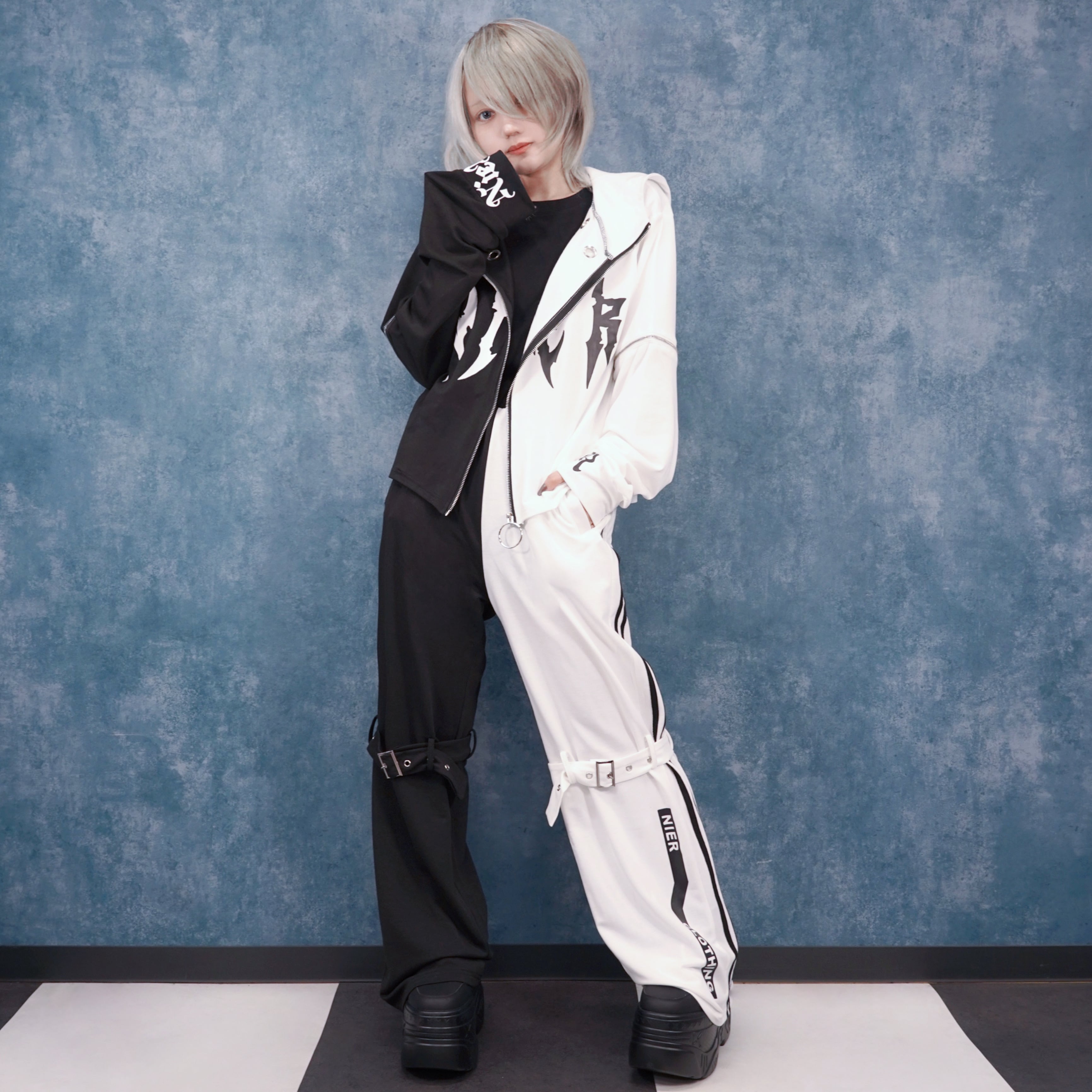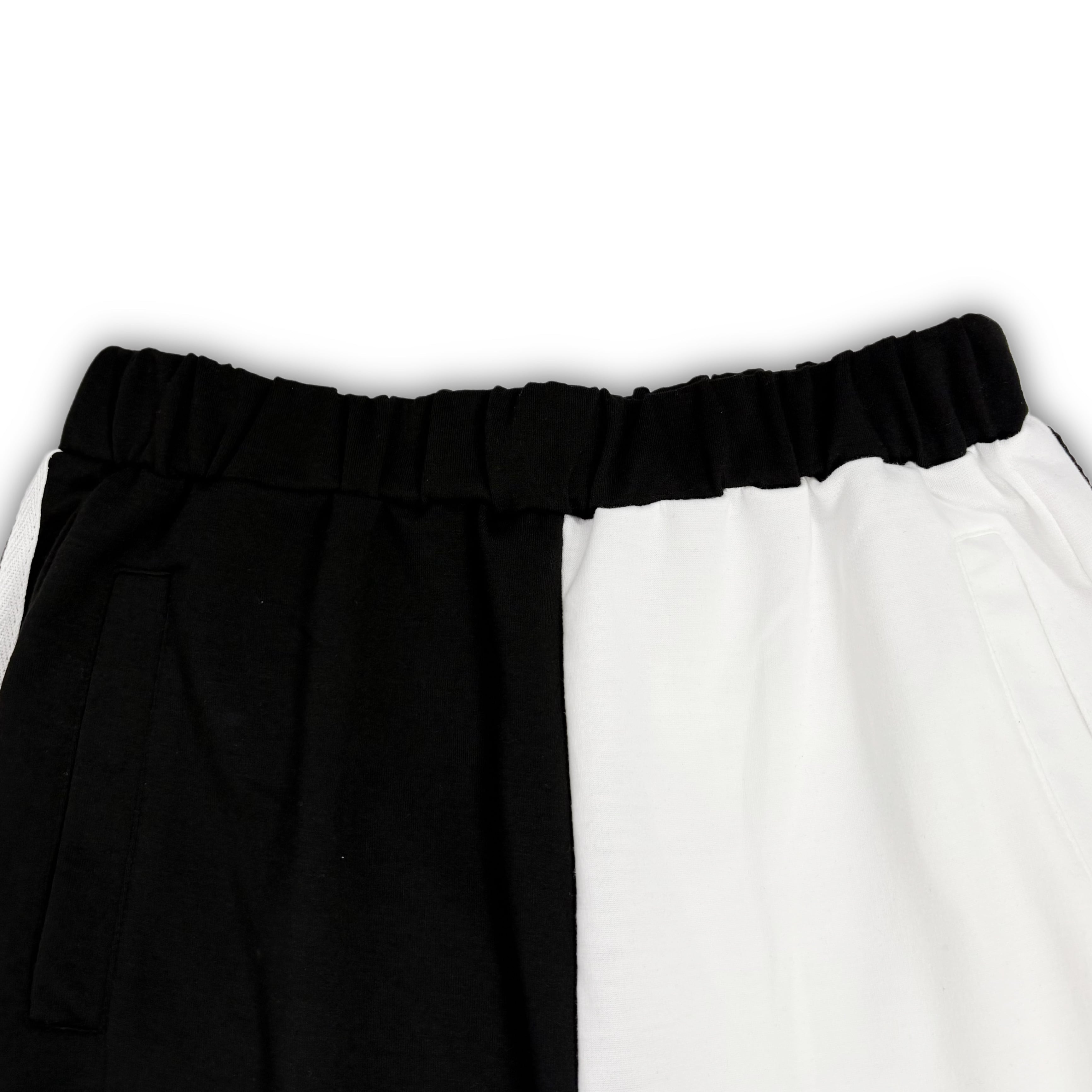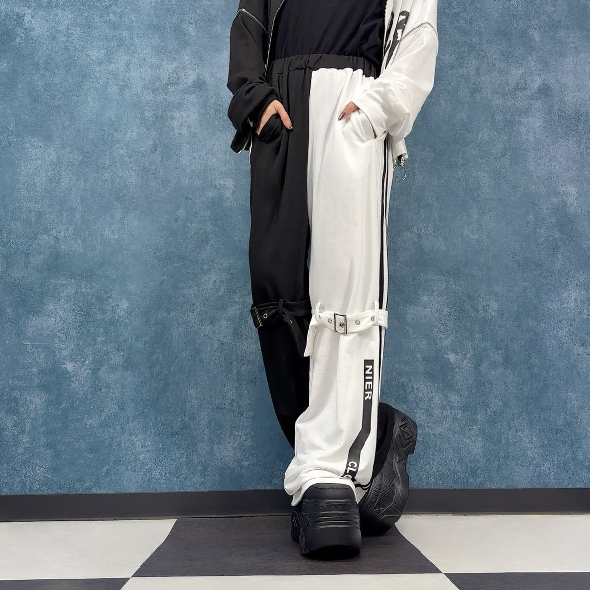 左右でカラーが異なるインパクト抜群のモノトーンバイカラーデザインが魅力のユニセックスパンツです。