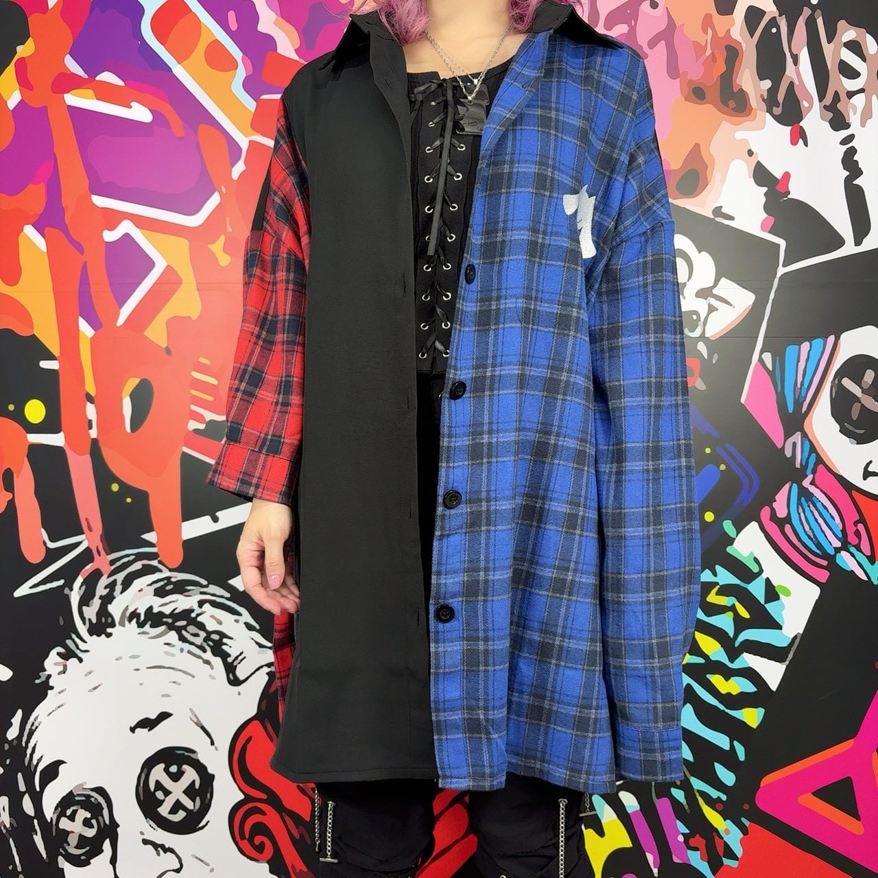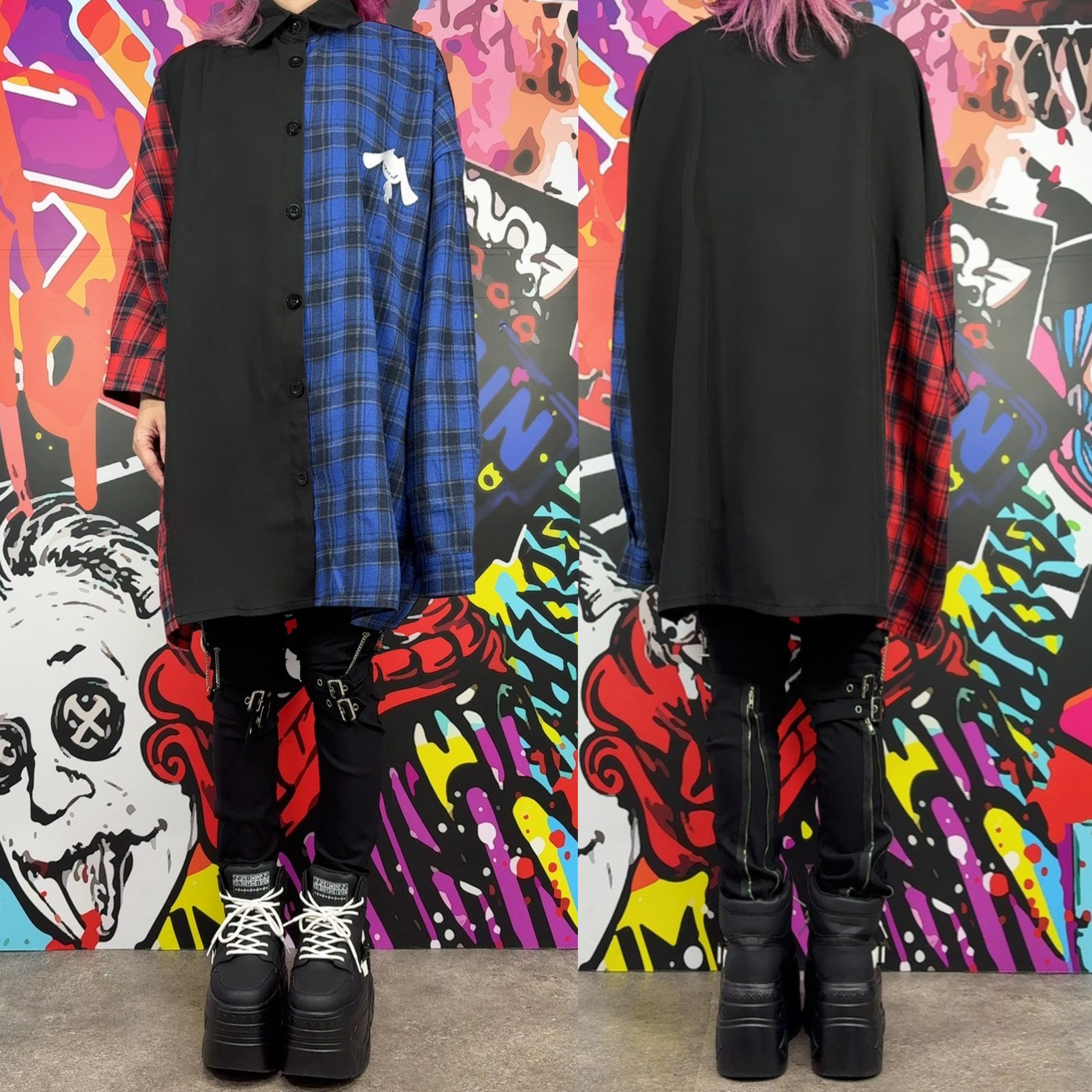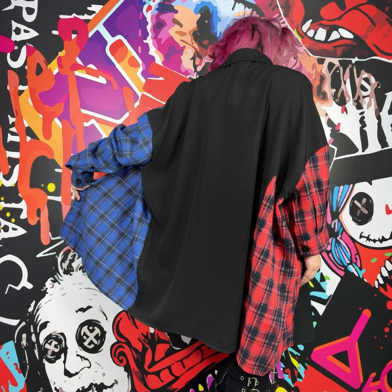 超OVERSIZE 袖丈アシンメトリーチェック柄切替シャツ【BLUE×RED】