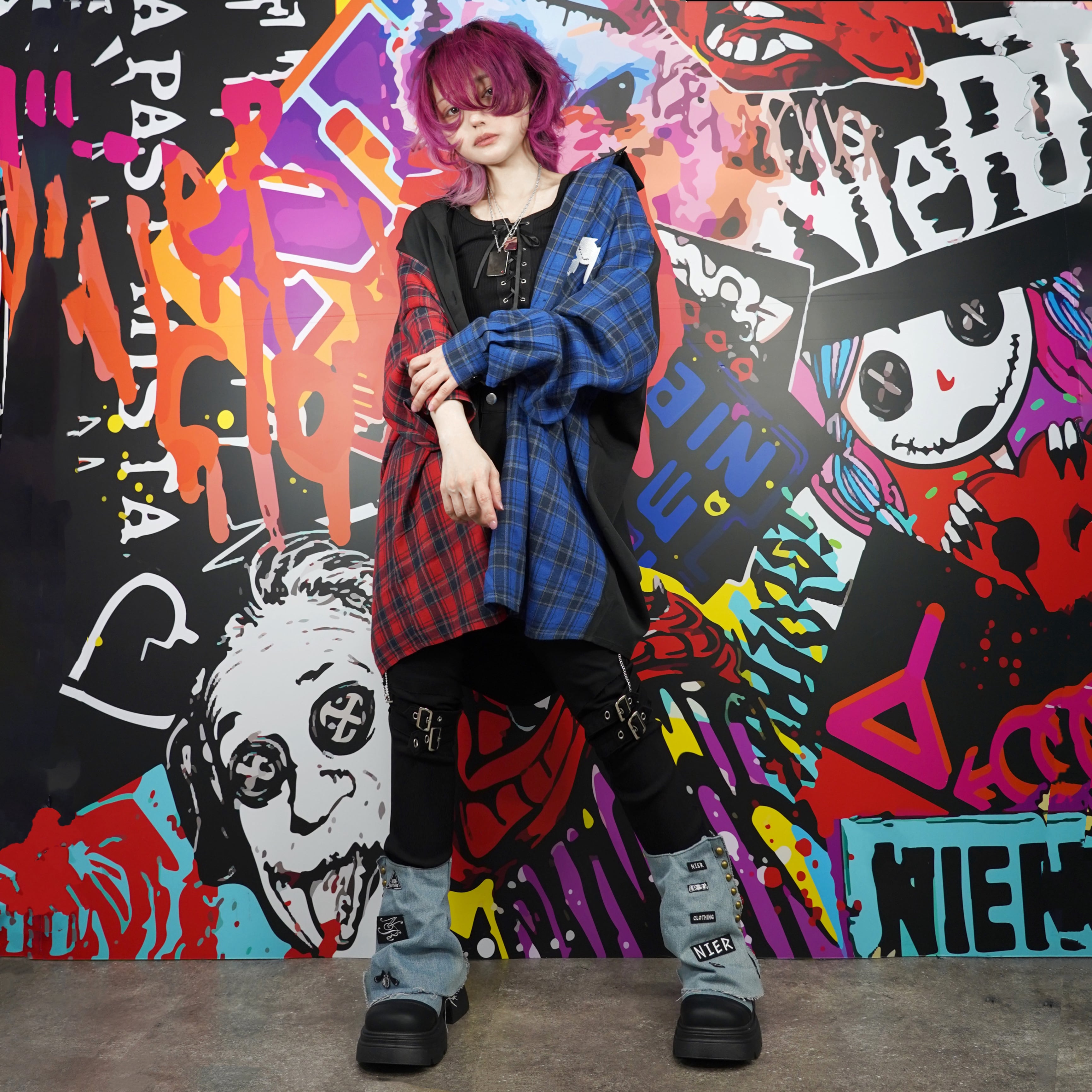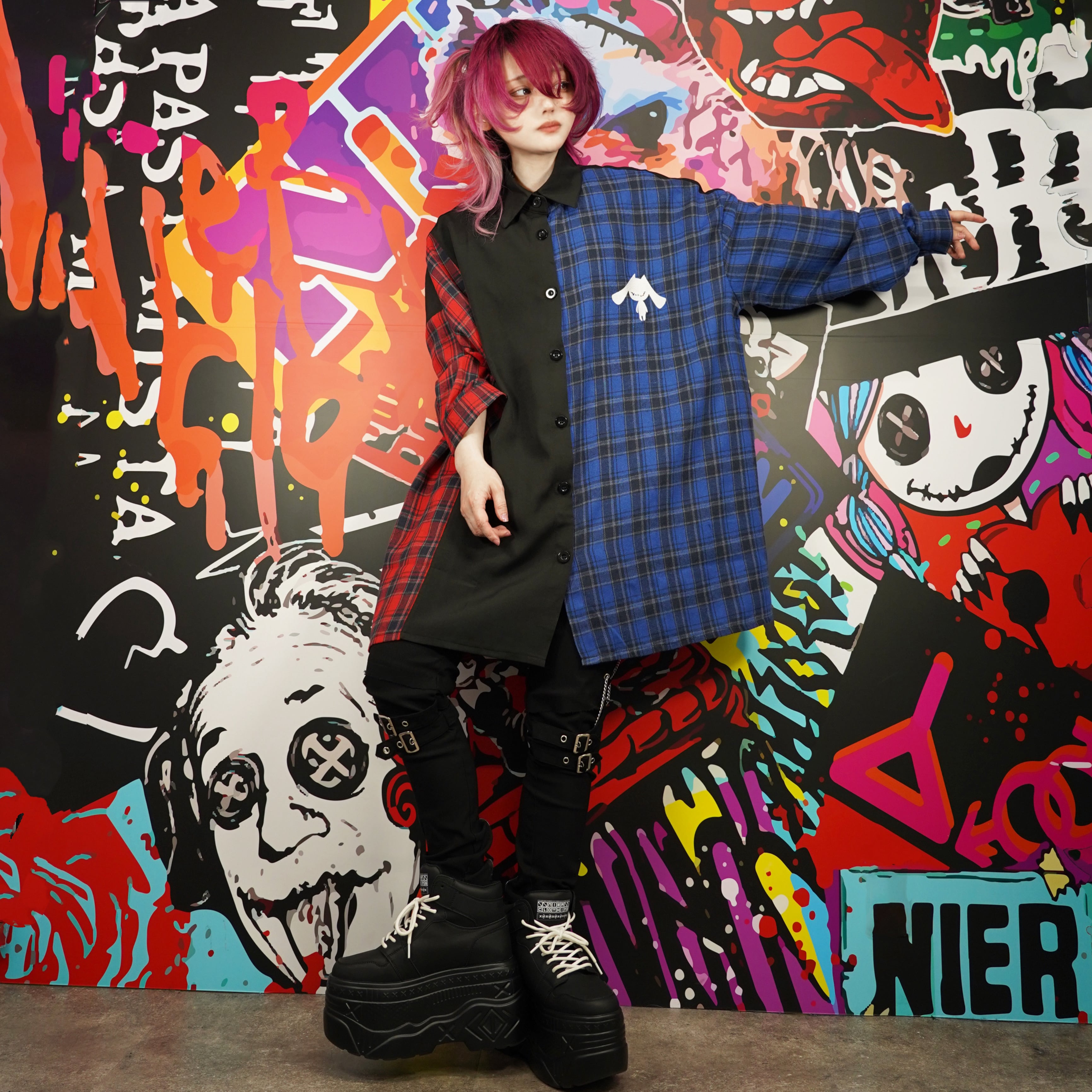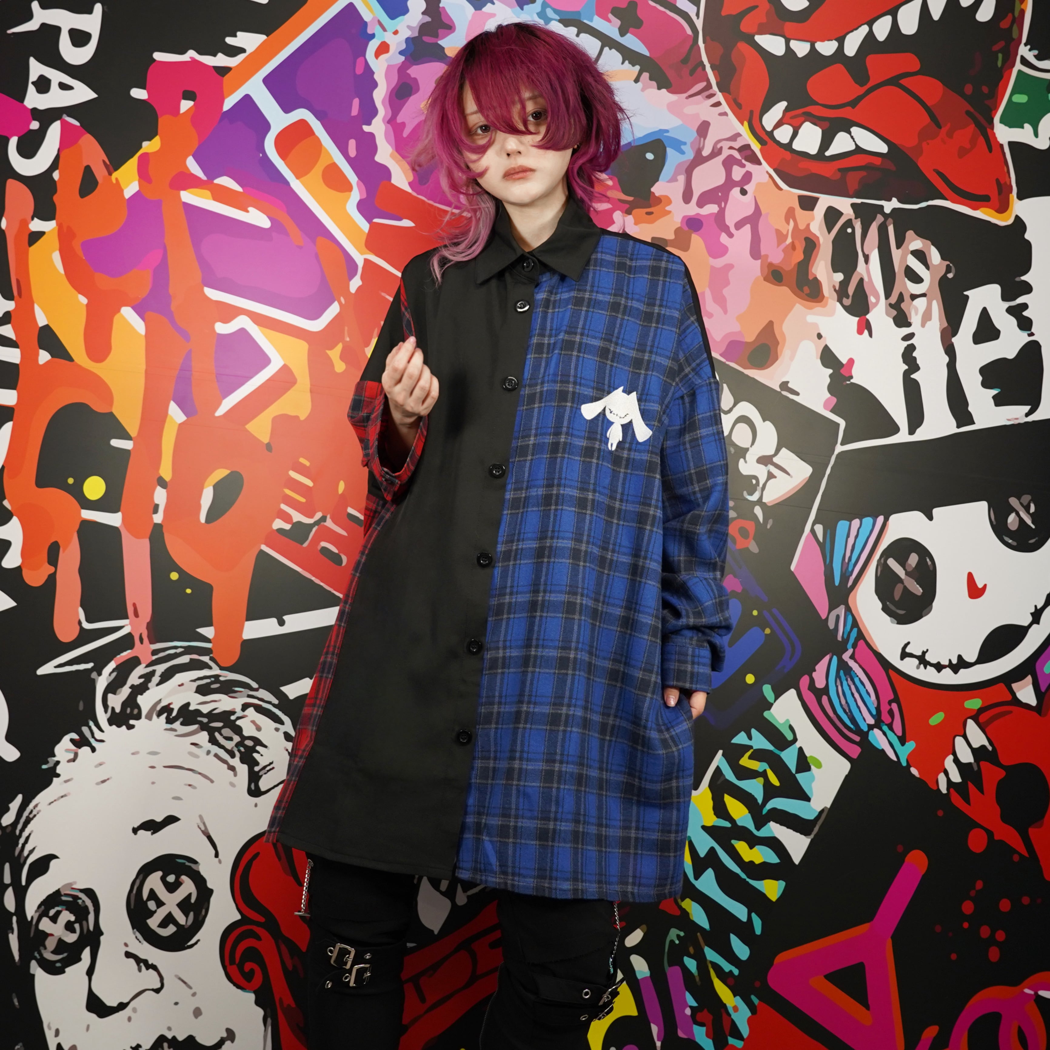 超OVERSIZE 袖丈アシンメトリーチェック柄切替シャツ【BLUE×RED】