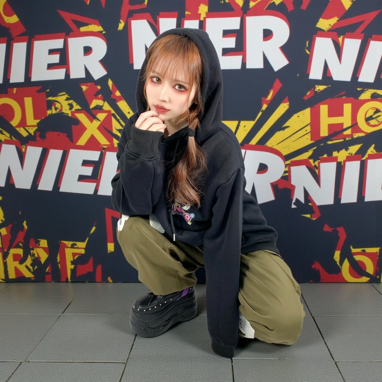 フロントには、もこもこ素材で表現されたNIERちゃんシルエットを左右に2つ配置し、視線を惹きつけるデザインに仕上げました。