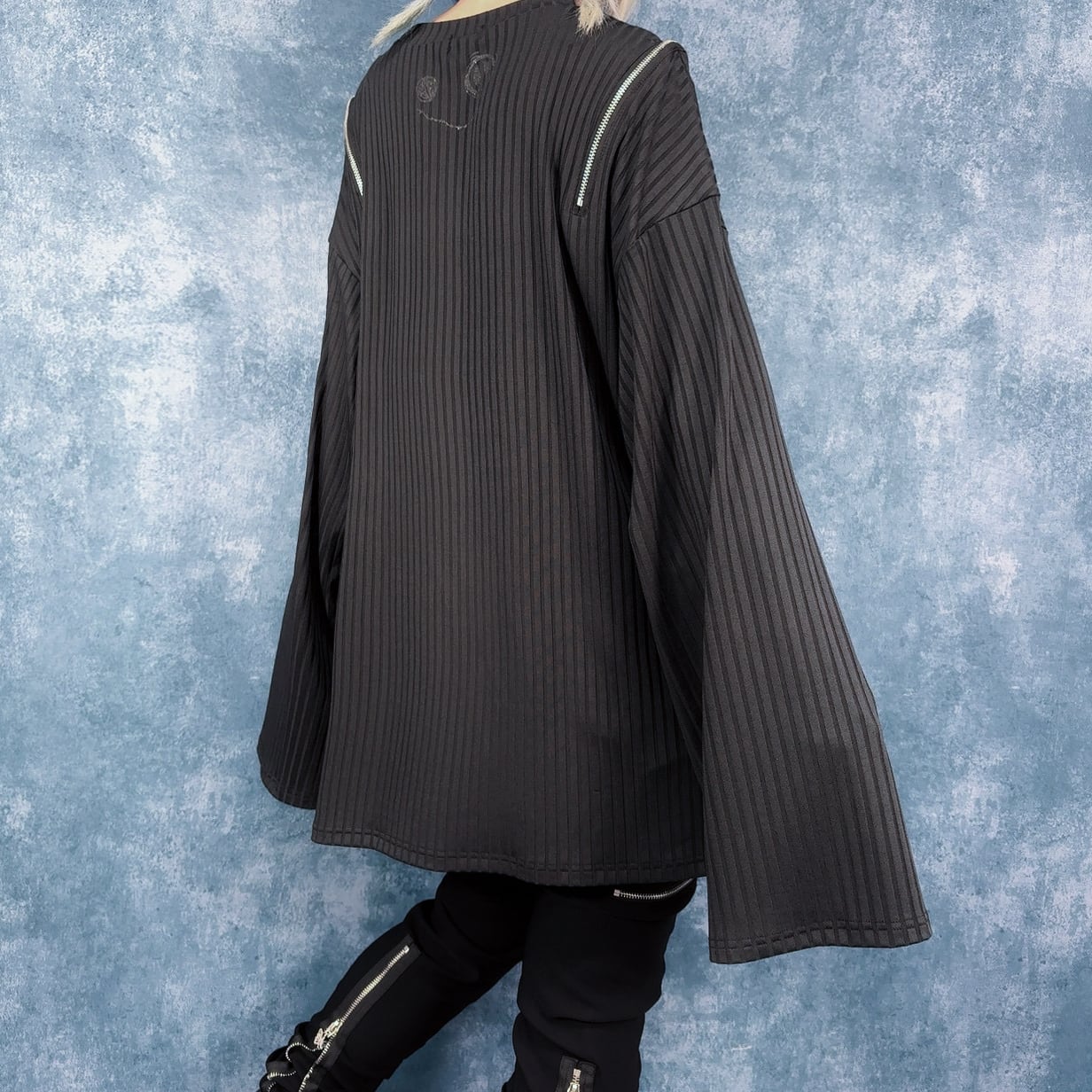 立体的なストライプ生地とジップデザインが存在感を放つ、