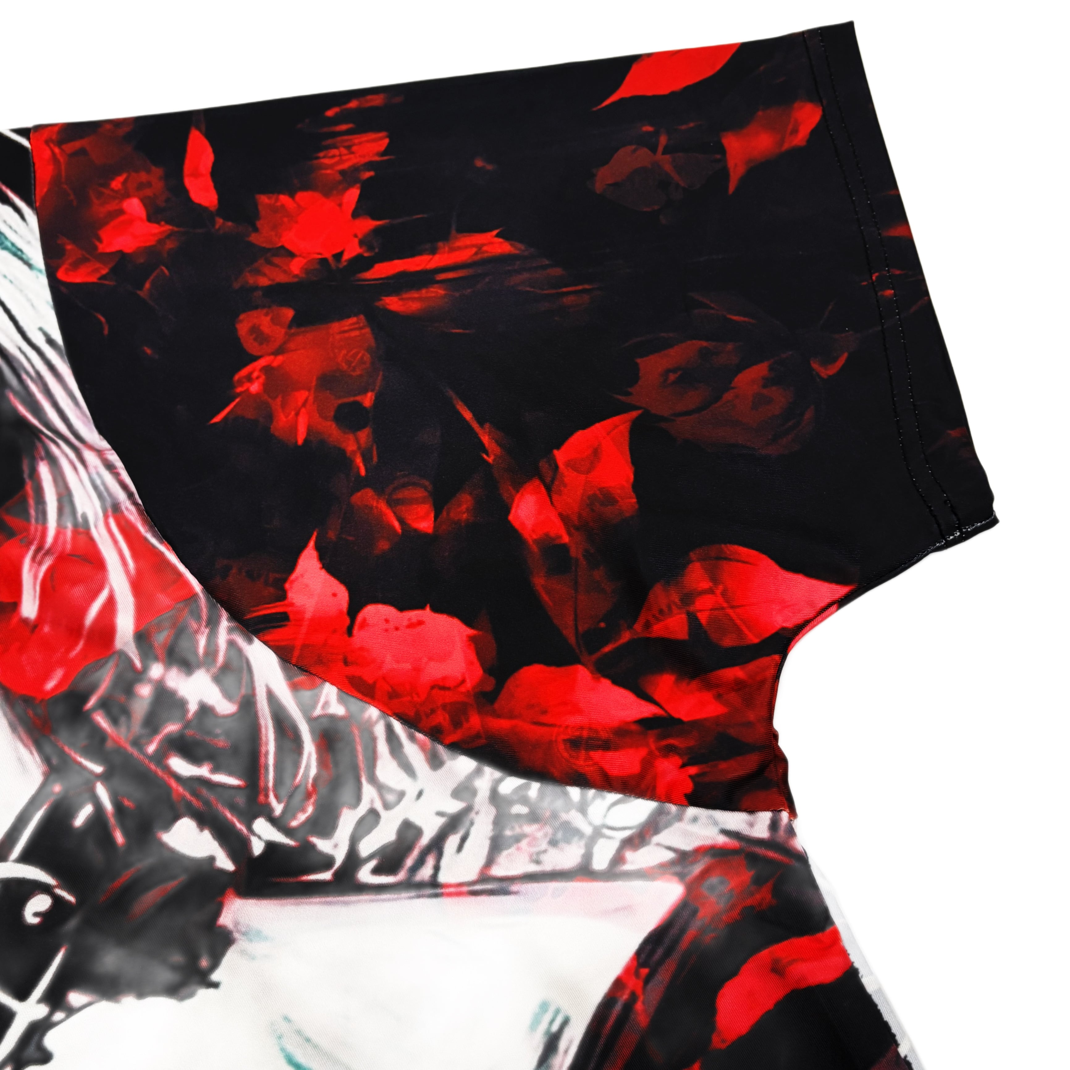 袖には深みあるレッドのフラワーアートが全面に広がり、