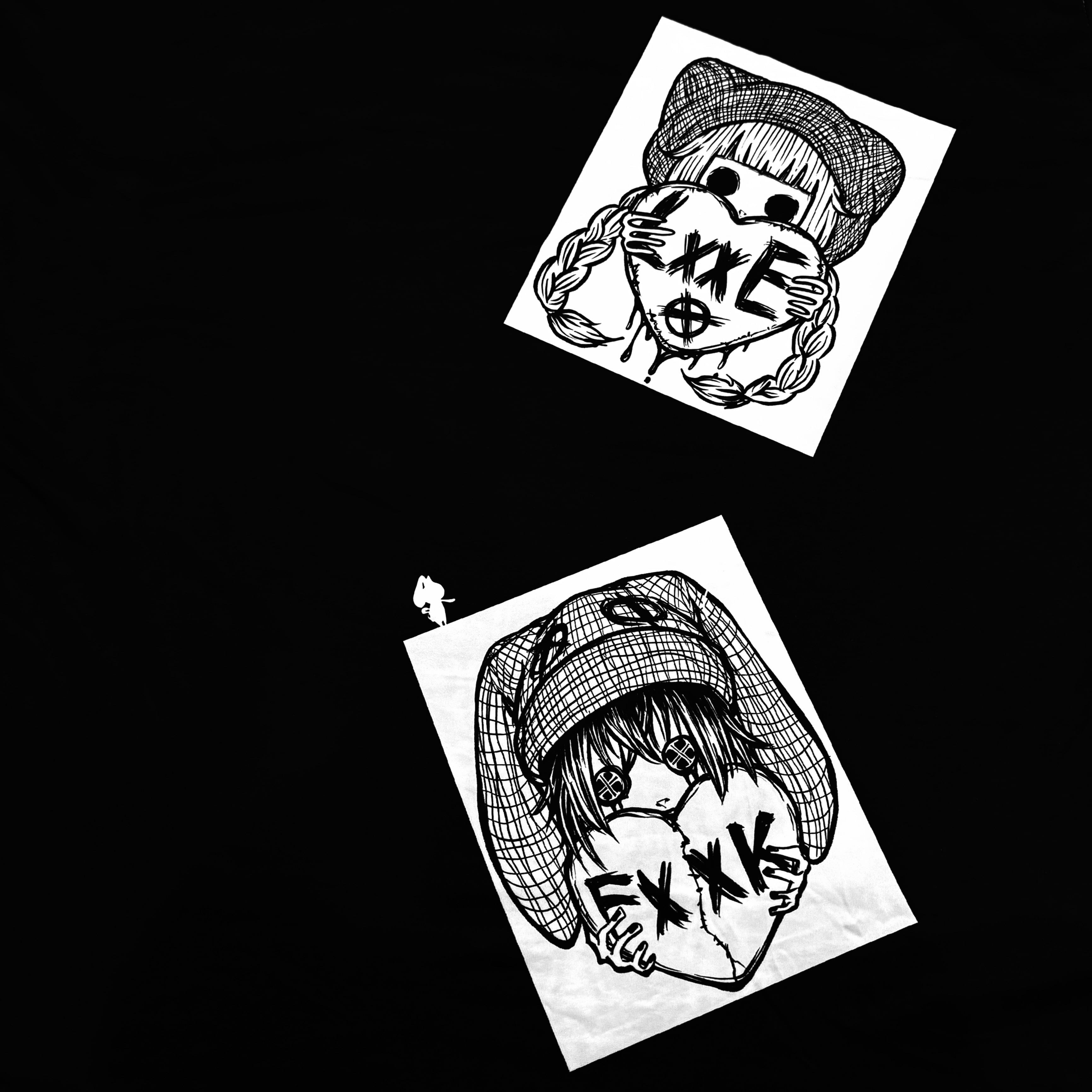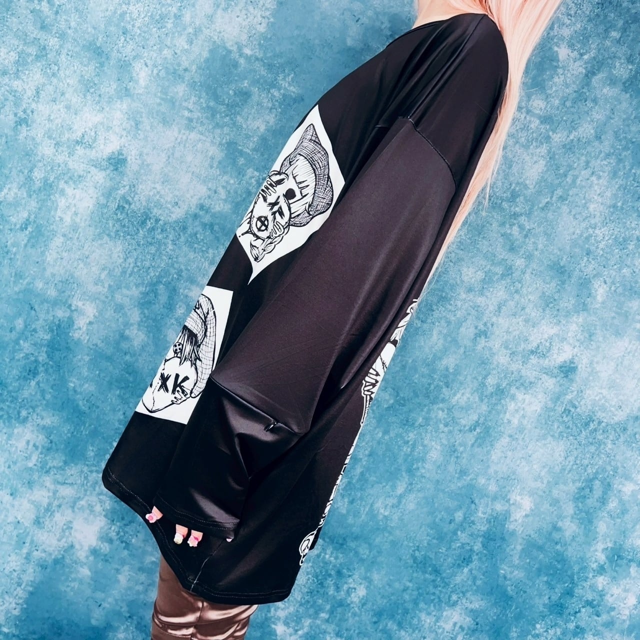 フロントとバックに描かれた独特のアートが、まるで物語の一場面のように強烈なインパクトを放ちます。