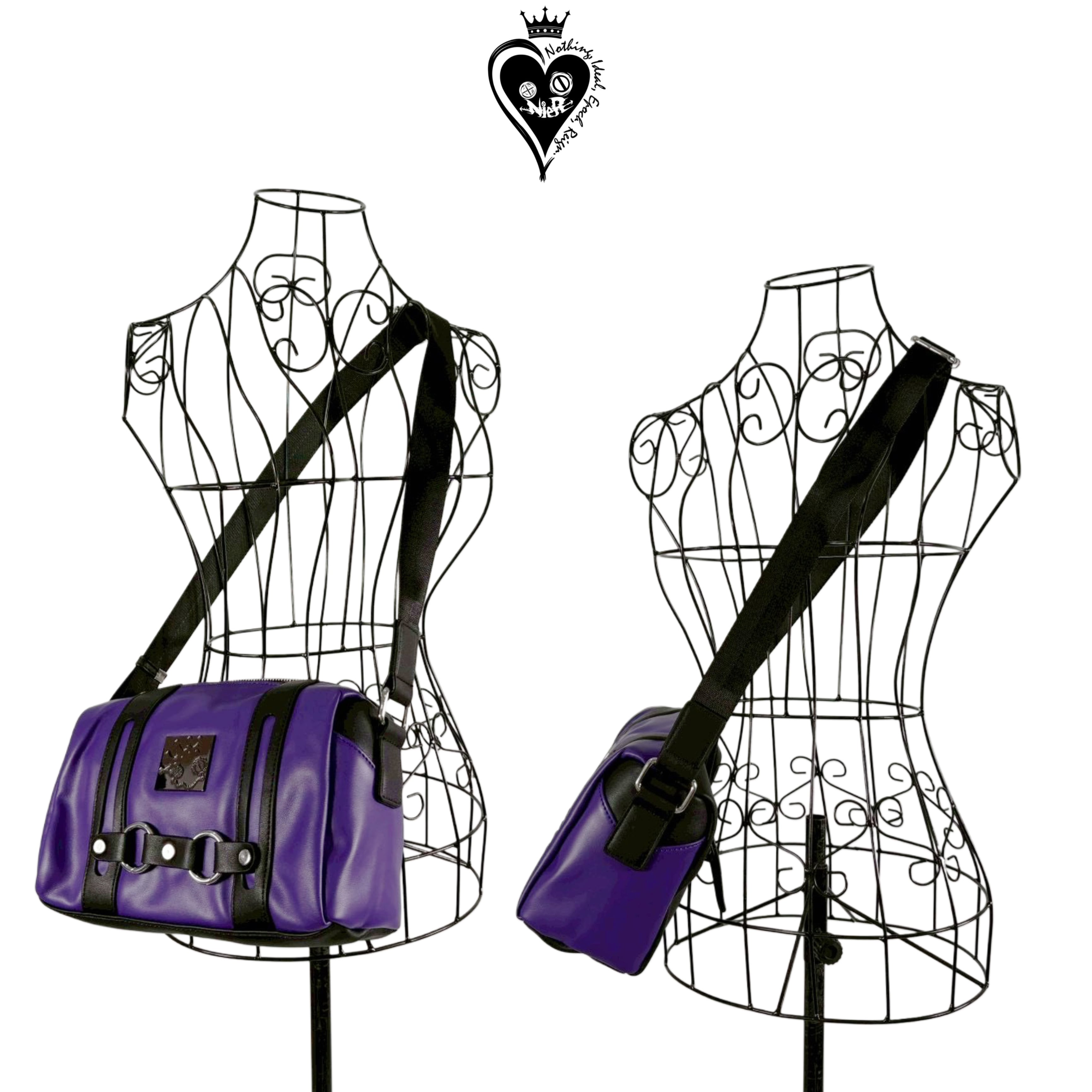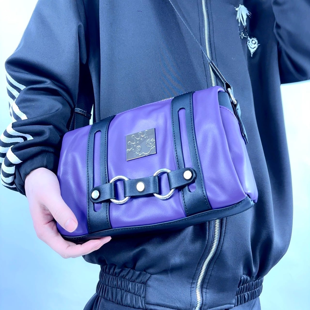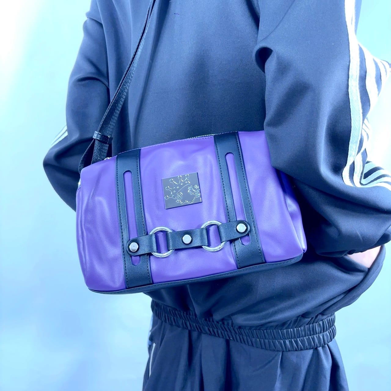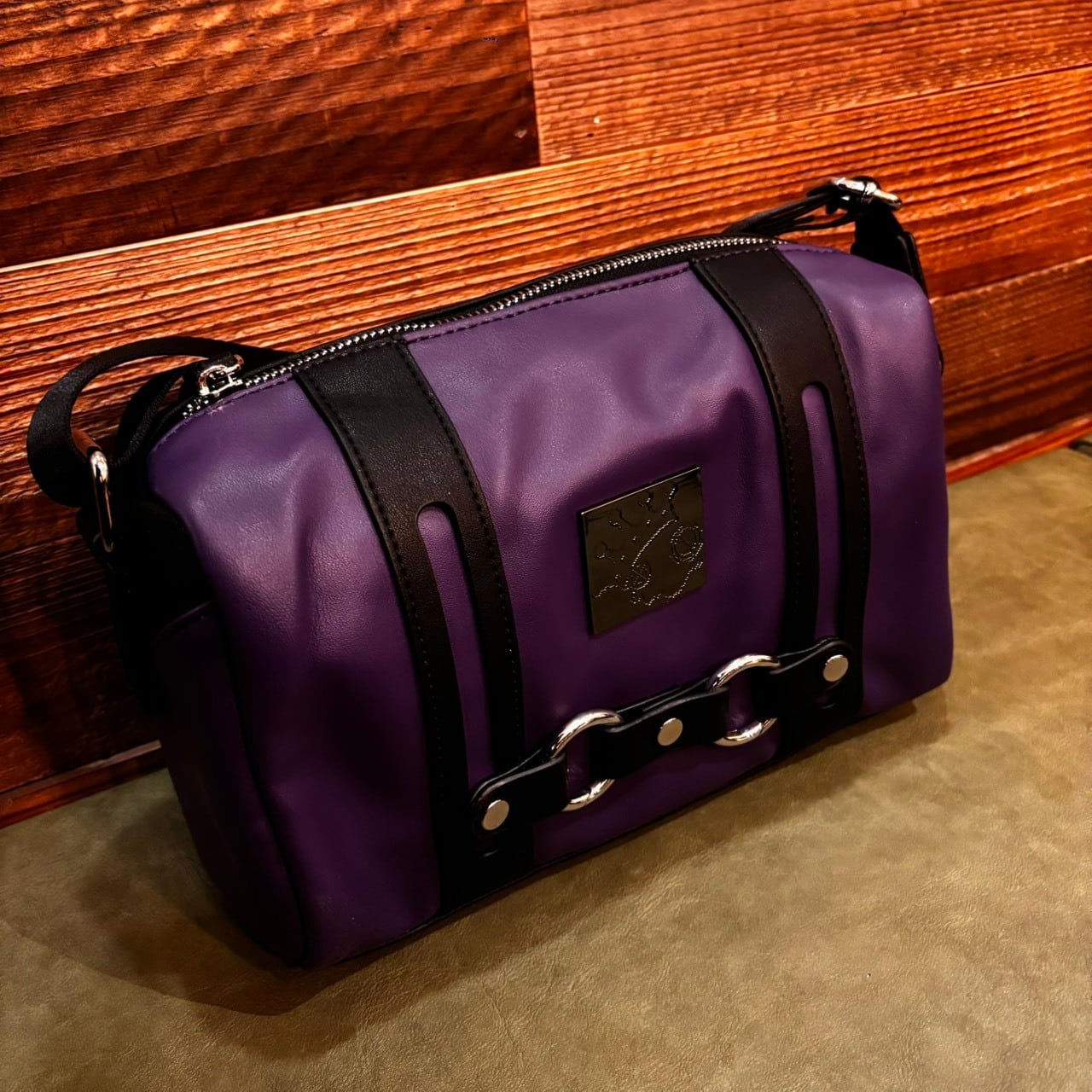 艶感のあるパープルボディにブラック+メタルパーツを合わせた、クールな配色のショルダーバッグ。