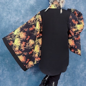 対照的に袖と襟には、燃えるような“彼岸花”モチーフの総柄アートを落とし込み、