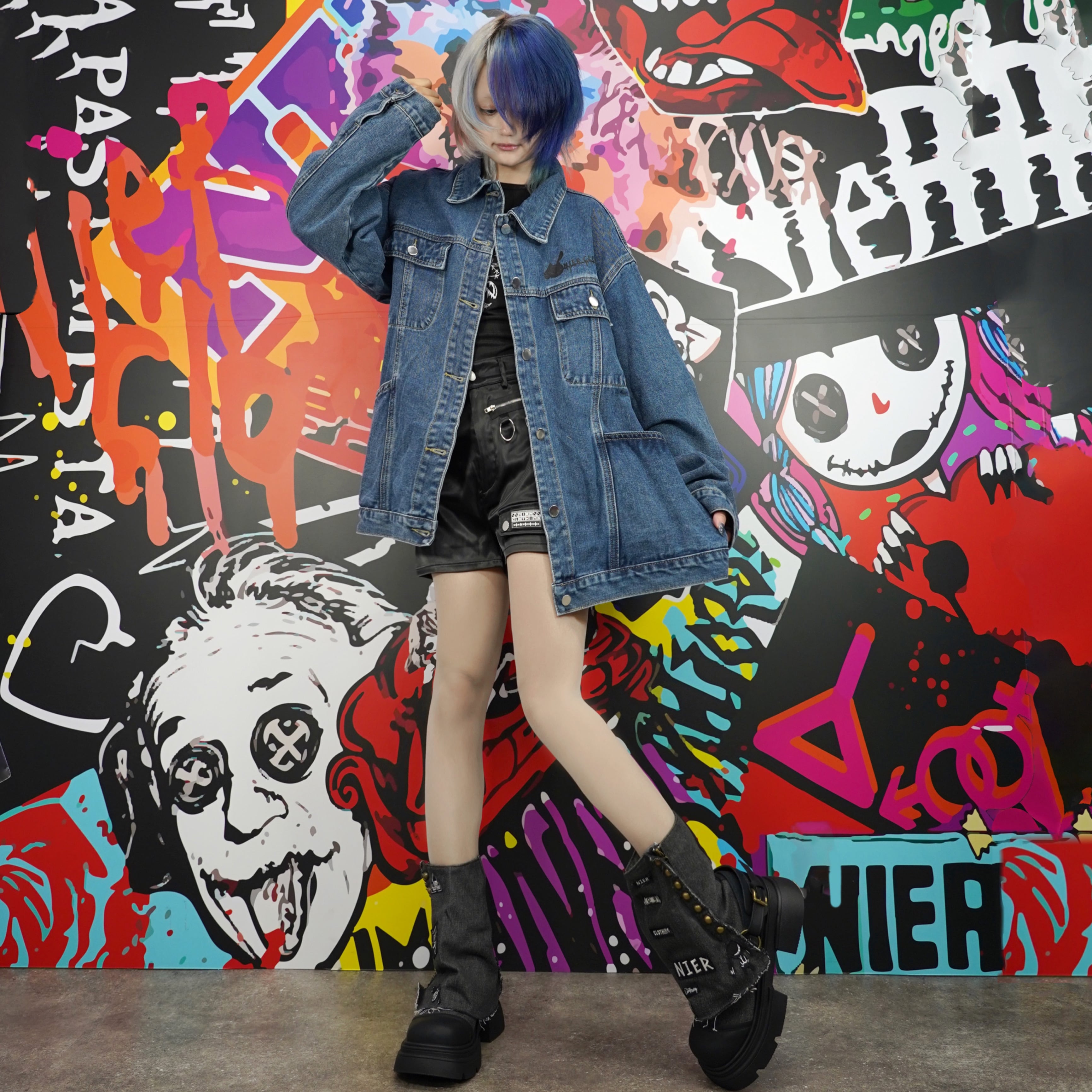 デニム×レザーの異素材コンビに、複数のパッチやスタッズを贅沢に配置。