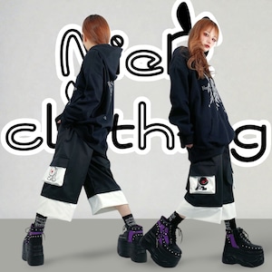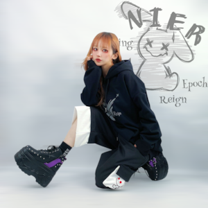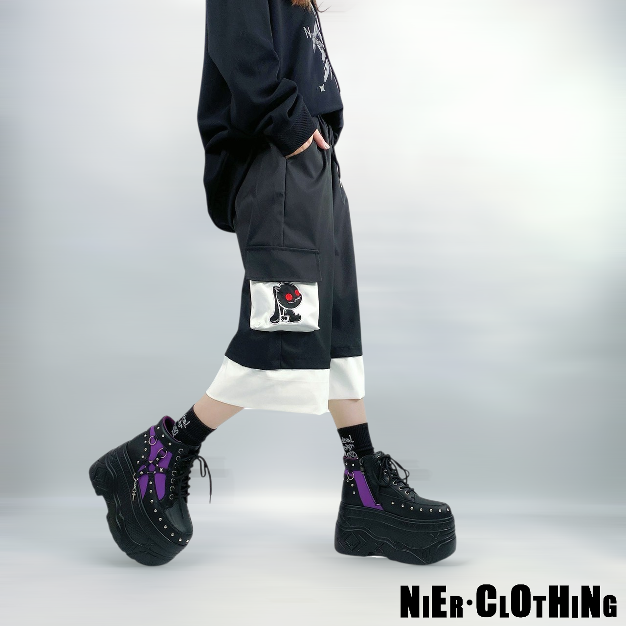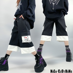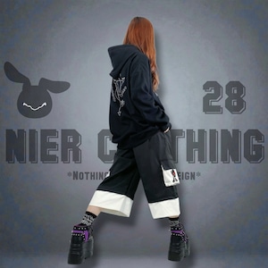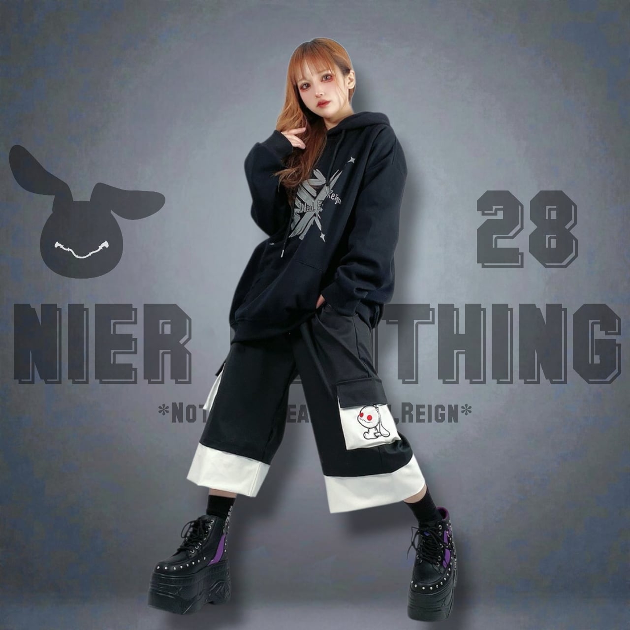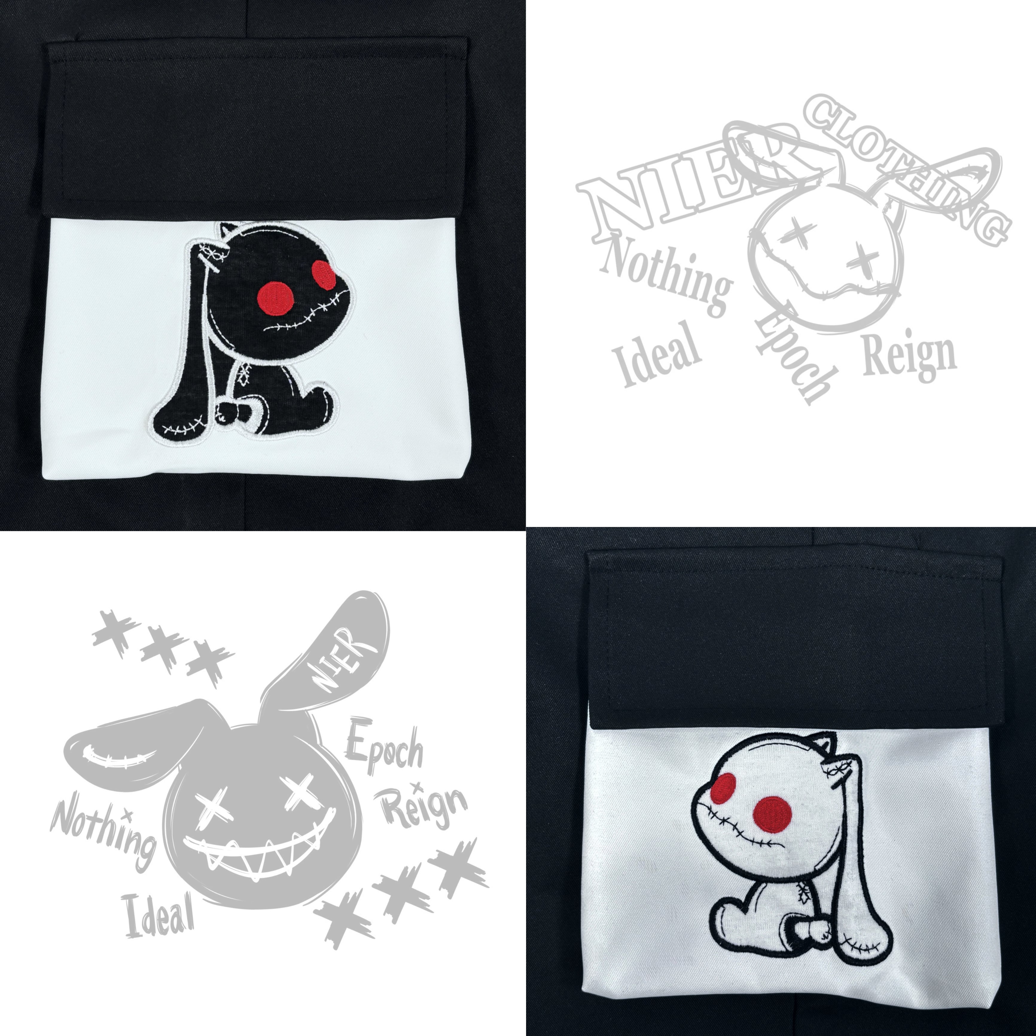 両サイドのカーゴポケットには、NIERちゃんのキュートでちょっぴりダークなワンポイントイラストが施され、