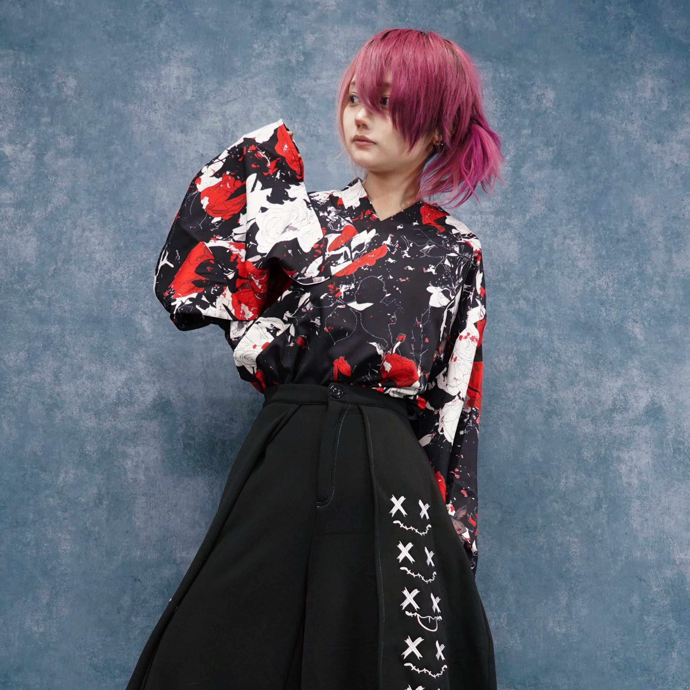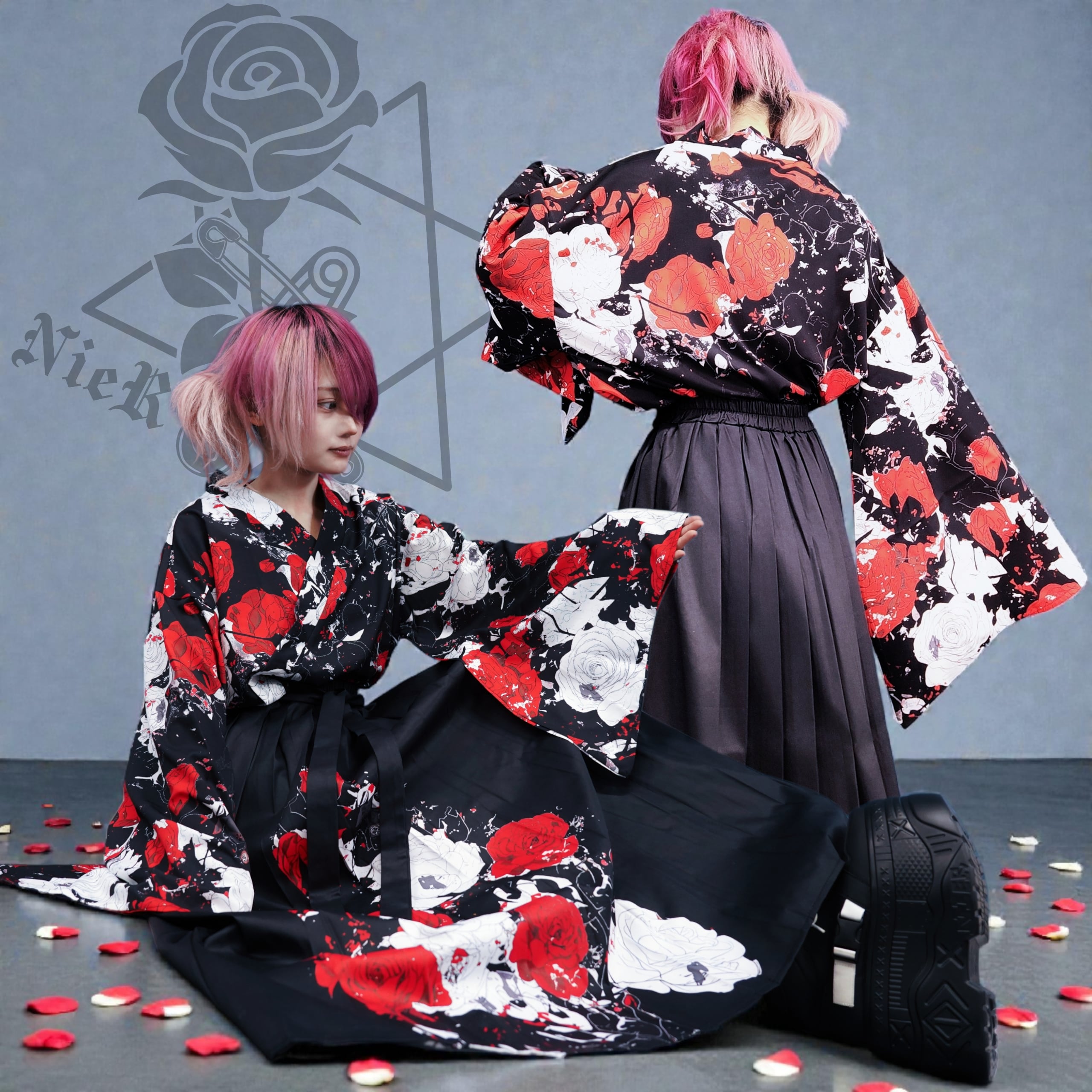 赤と白の薔薇を大胆に描いた和柄デザインが、
