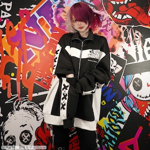 袖の大胆な「✕モチーフ」と胸元のコラボアートがアクセント。