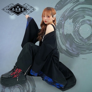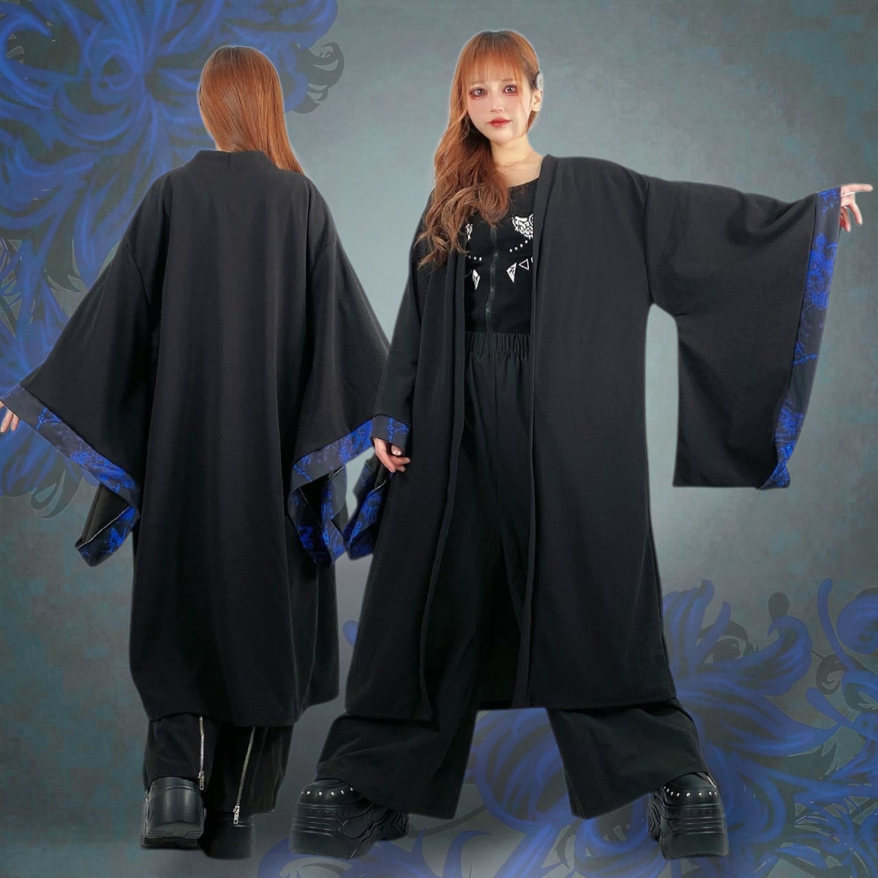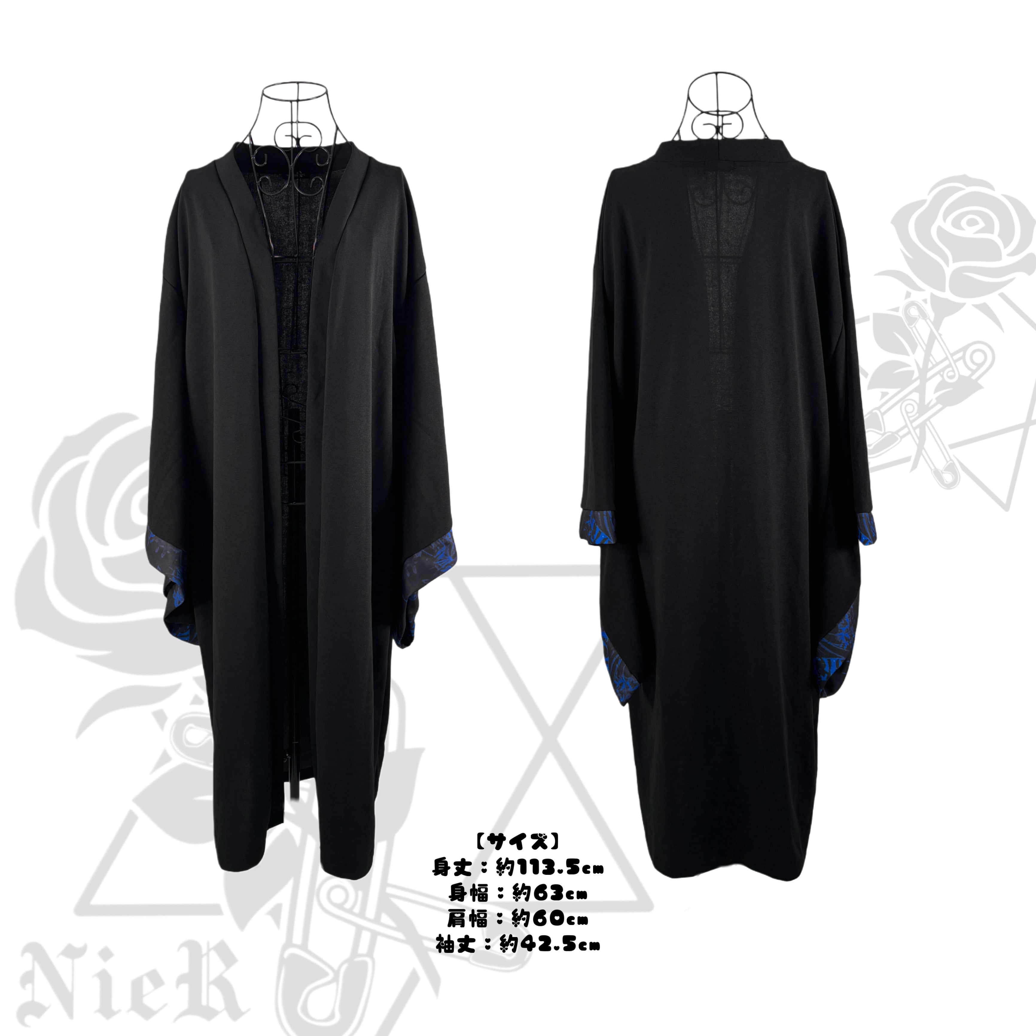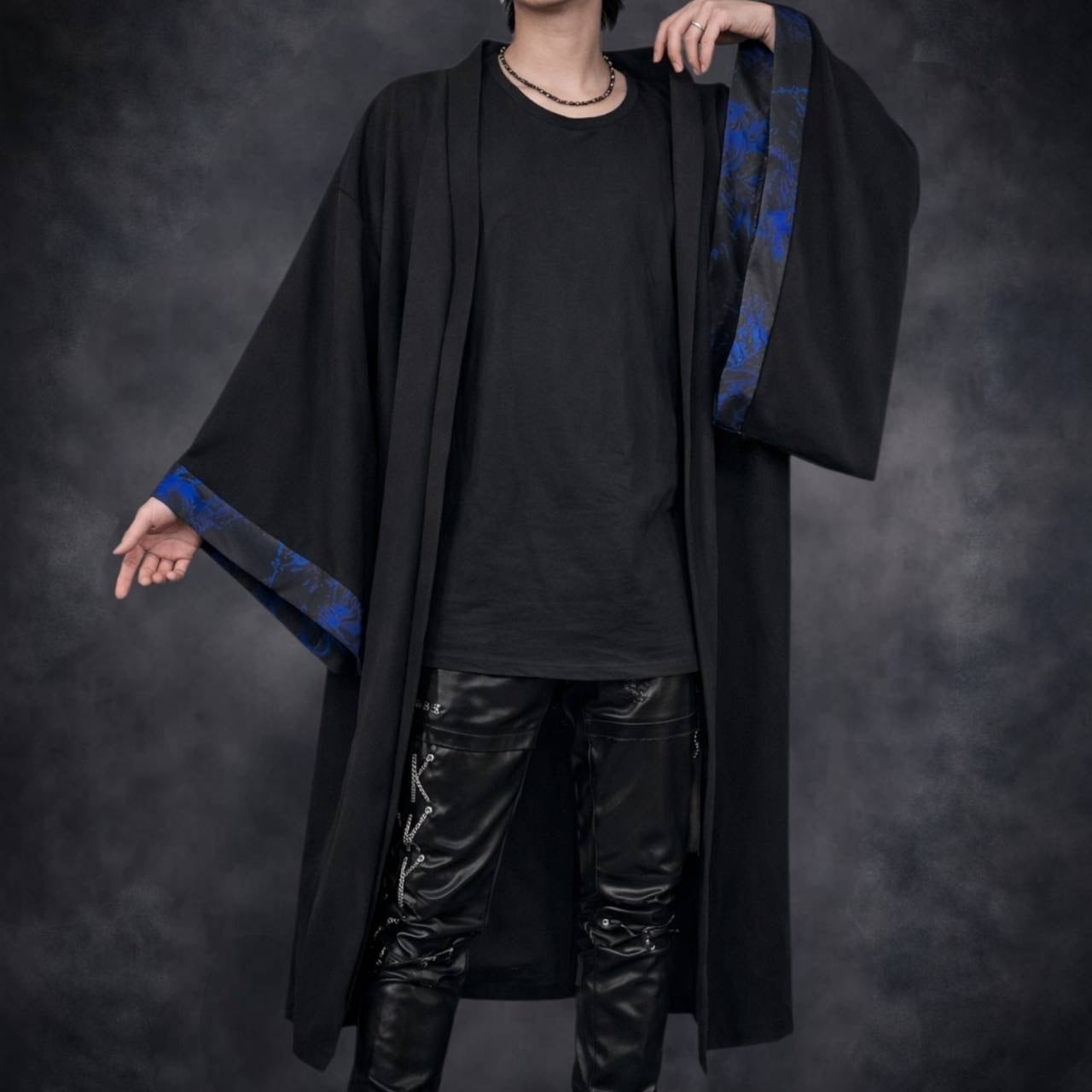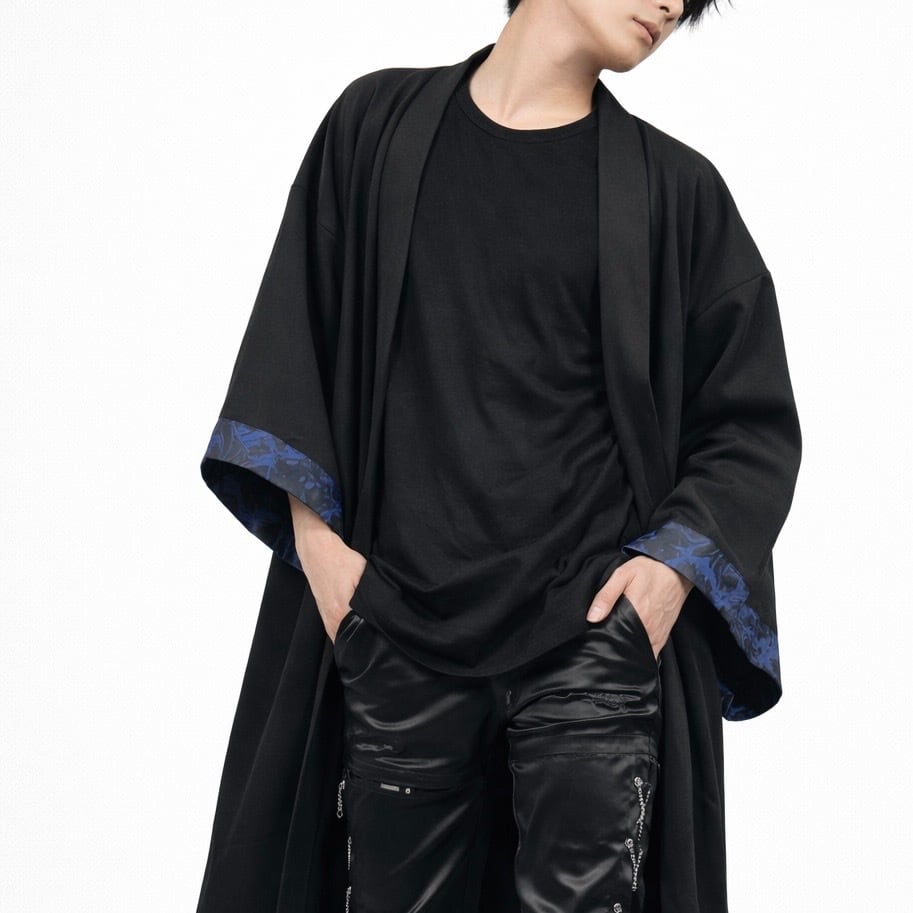 妖しく咲き誇る青の彼岸花柄を袖裾に落とし込み、羽織るだけで世界観が完成する一着です。