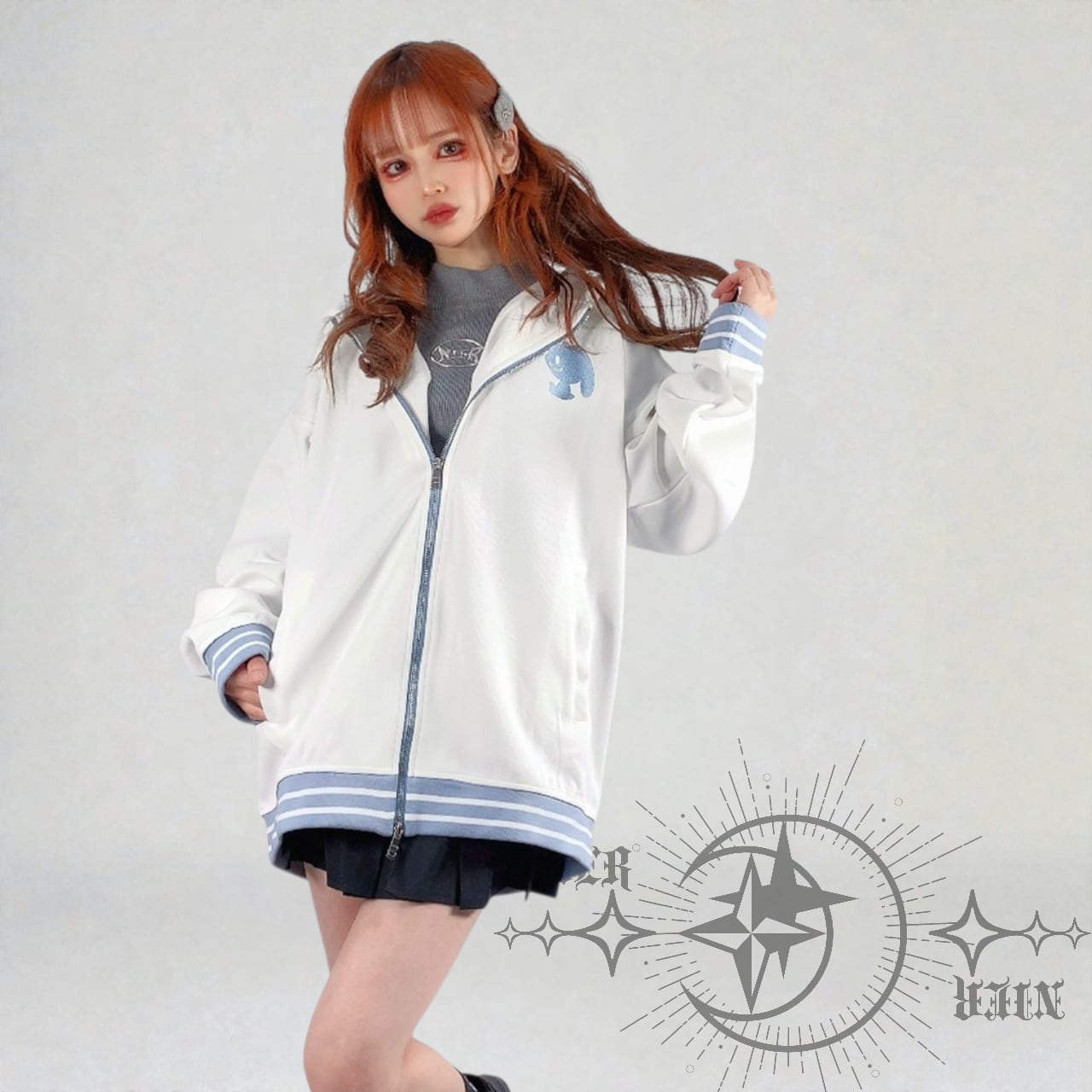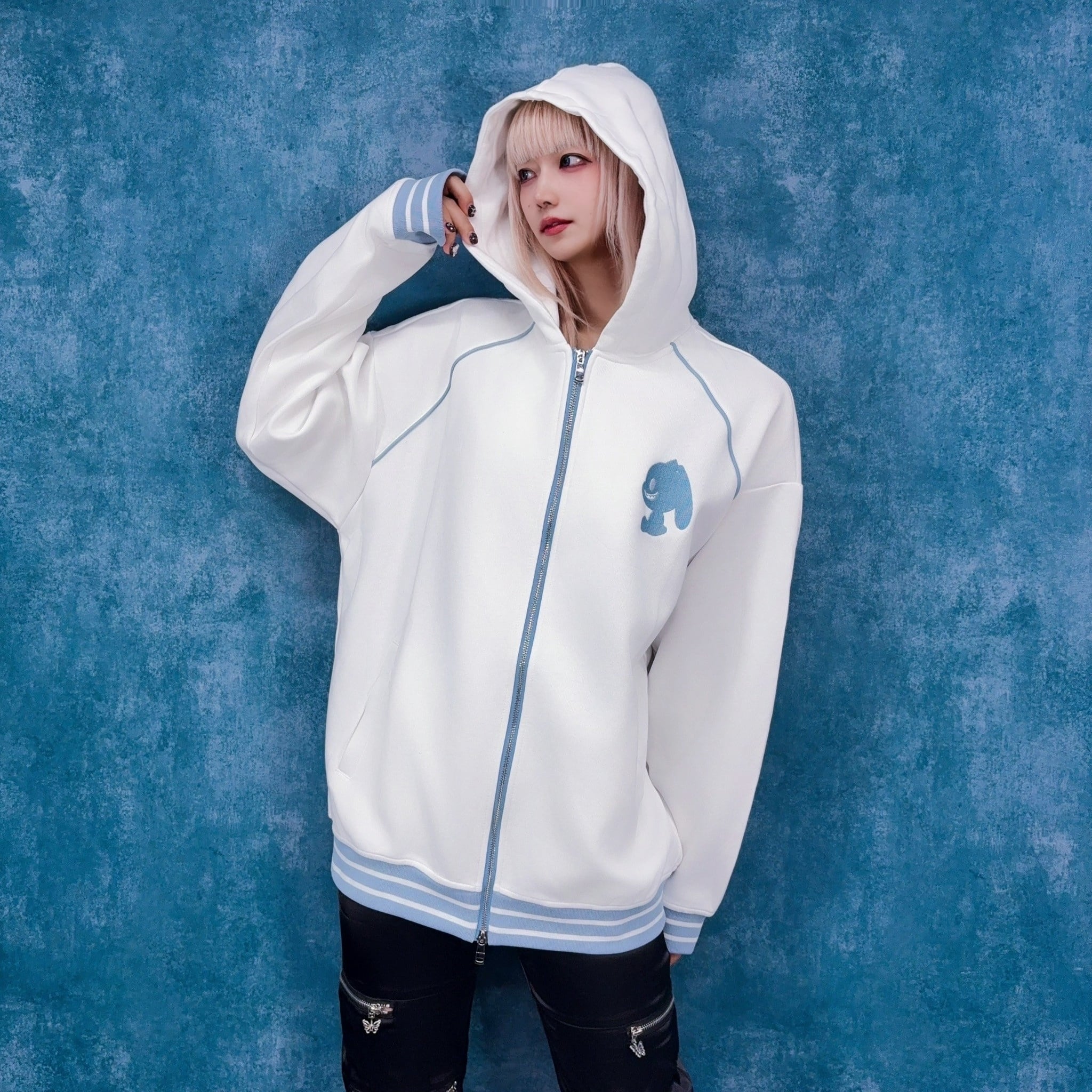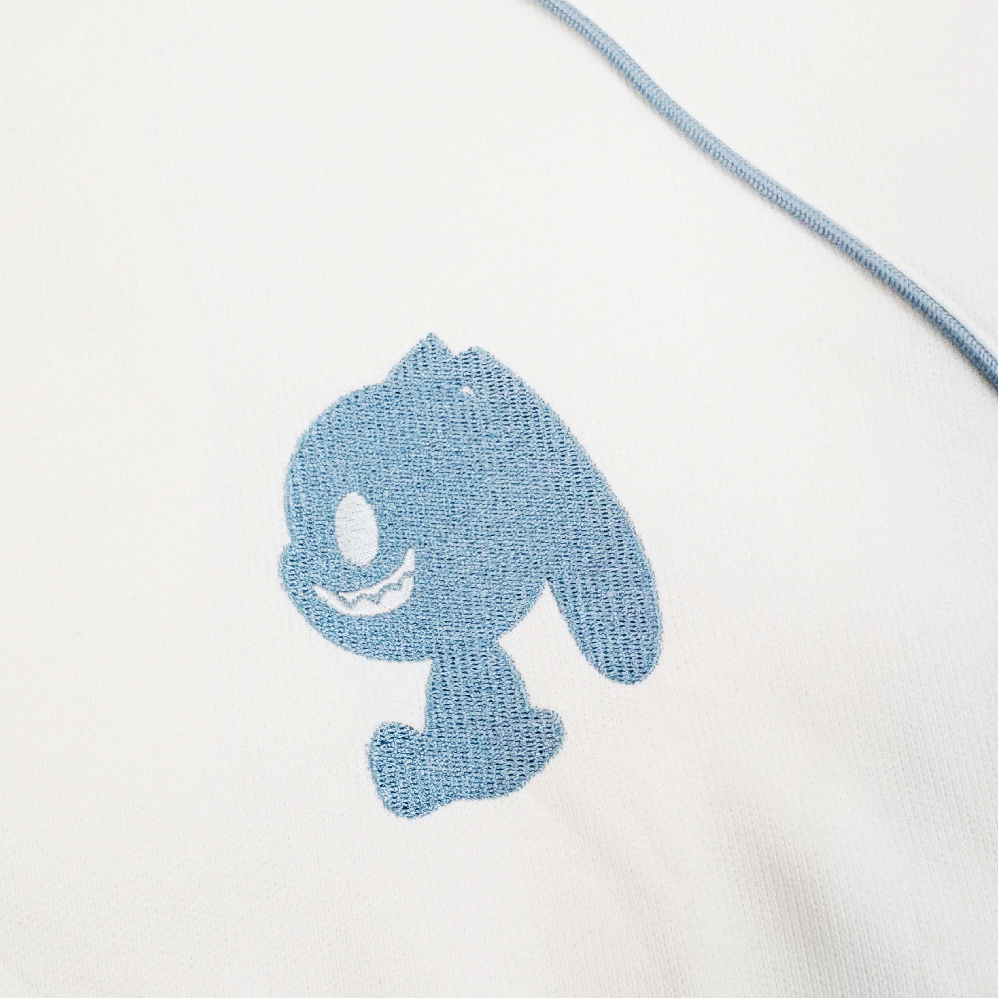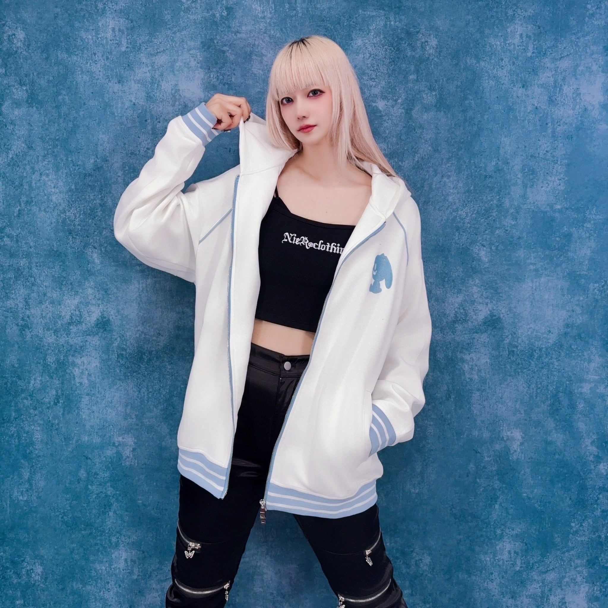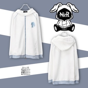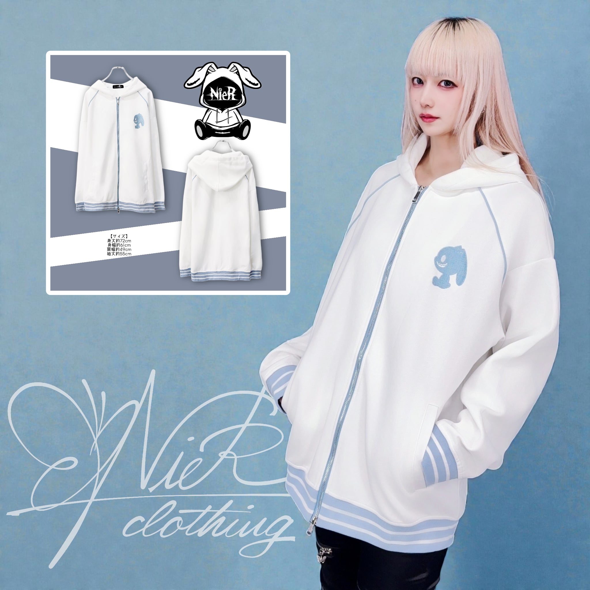 胸元に配置された淡色ブルーのNIERちゃんシルエットが映える、