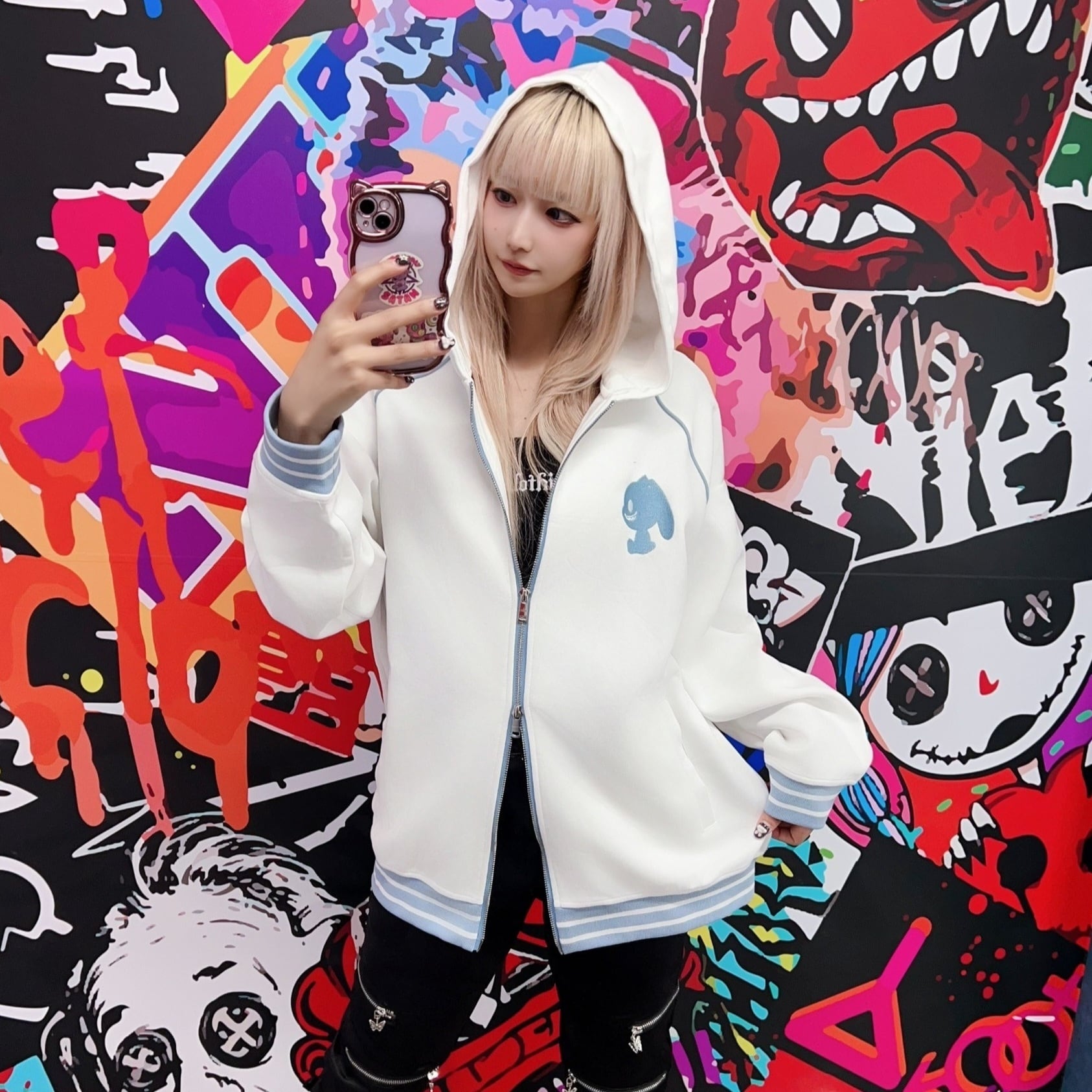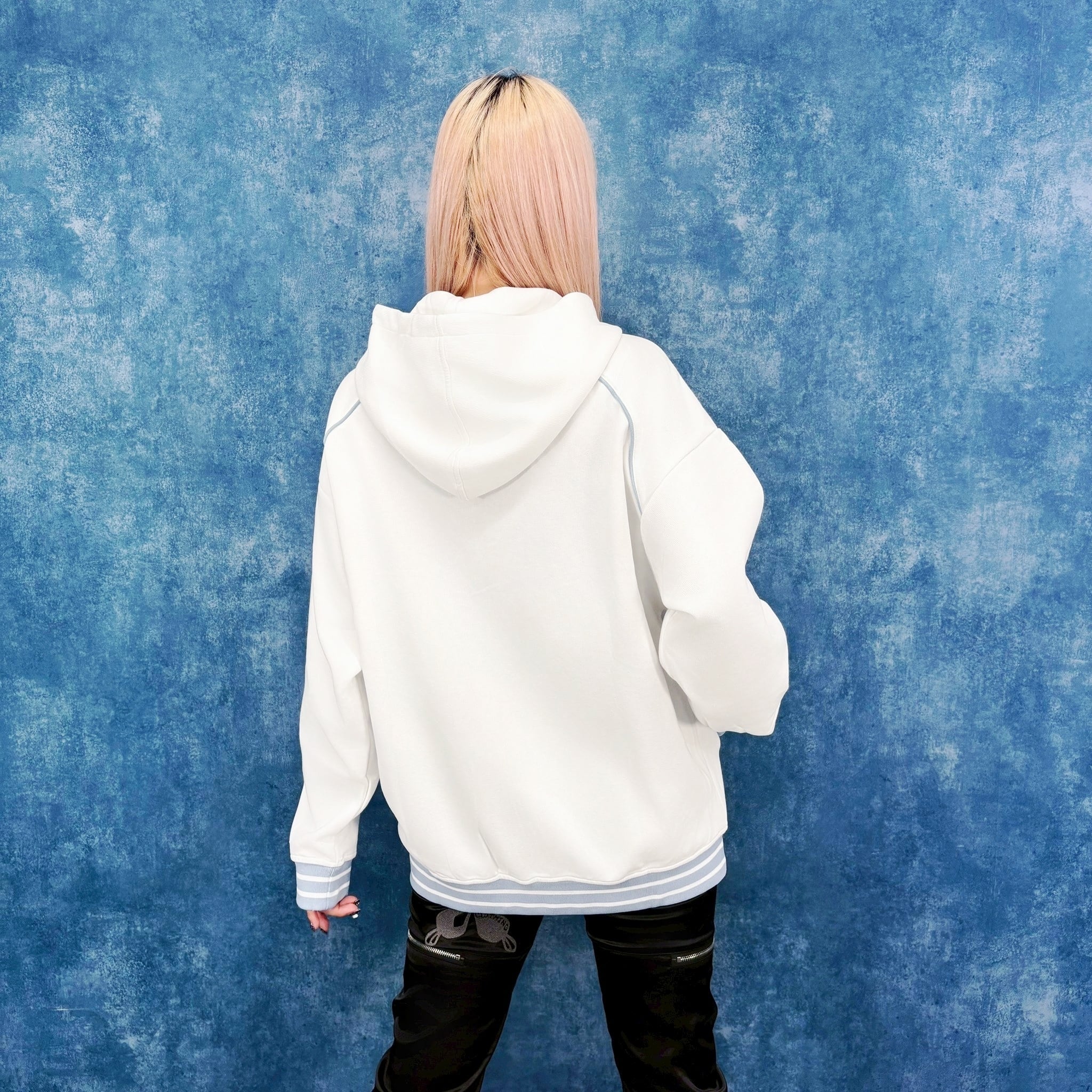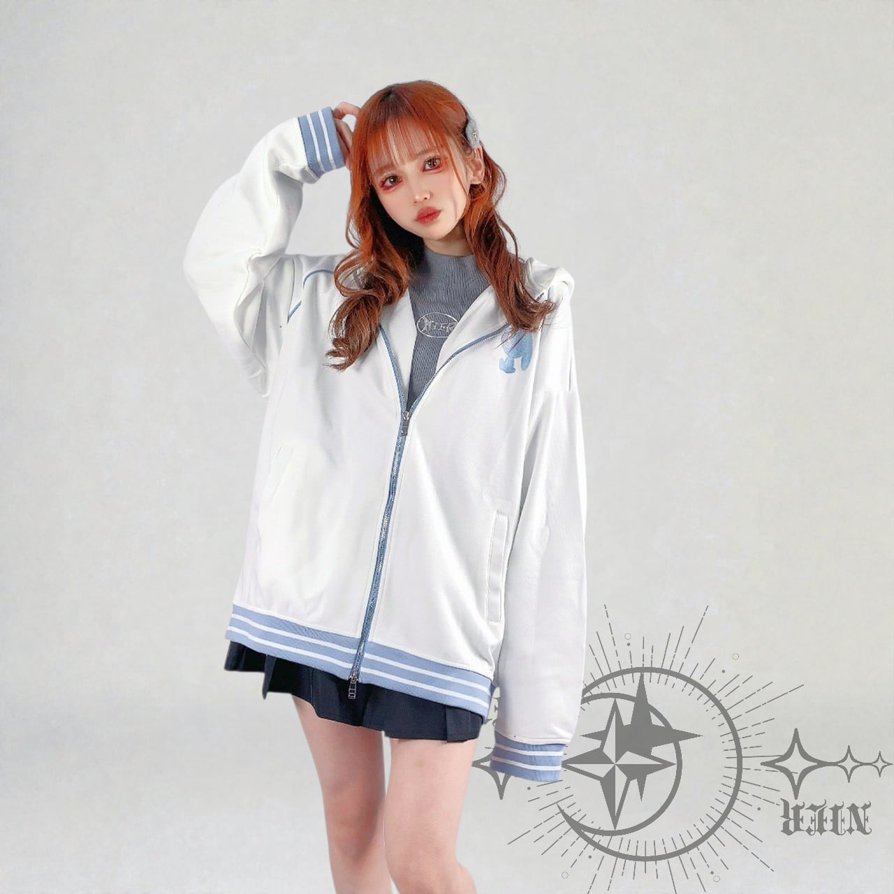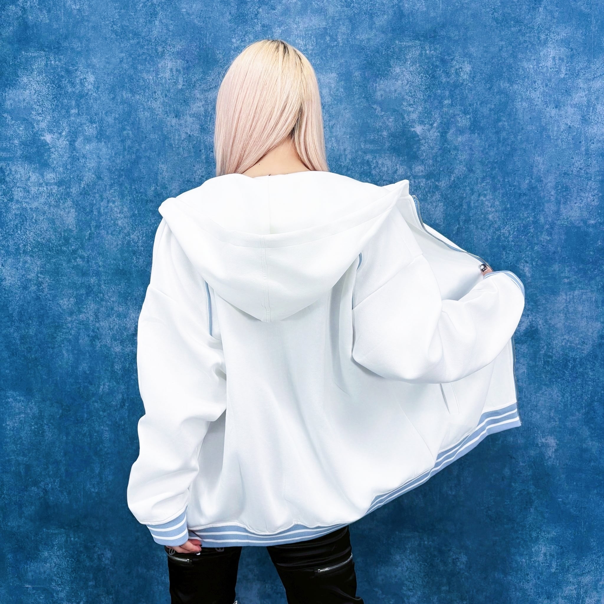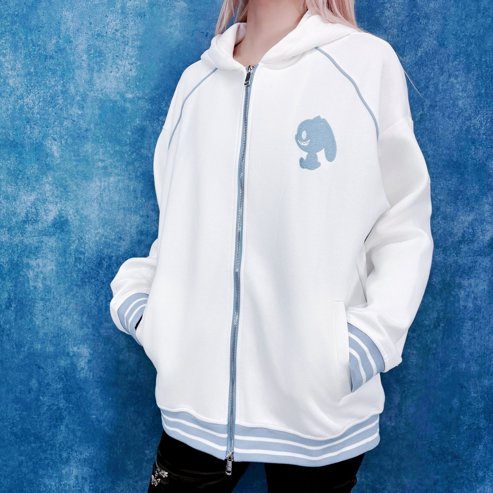 胸元に配置された淡色ブルーのNIERちゃんシルエットが映える、