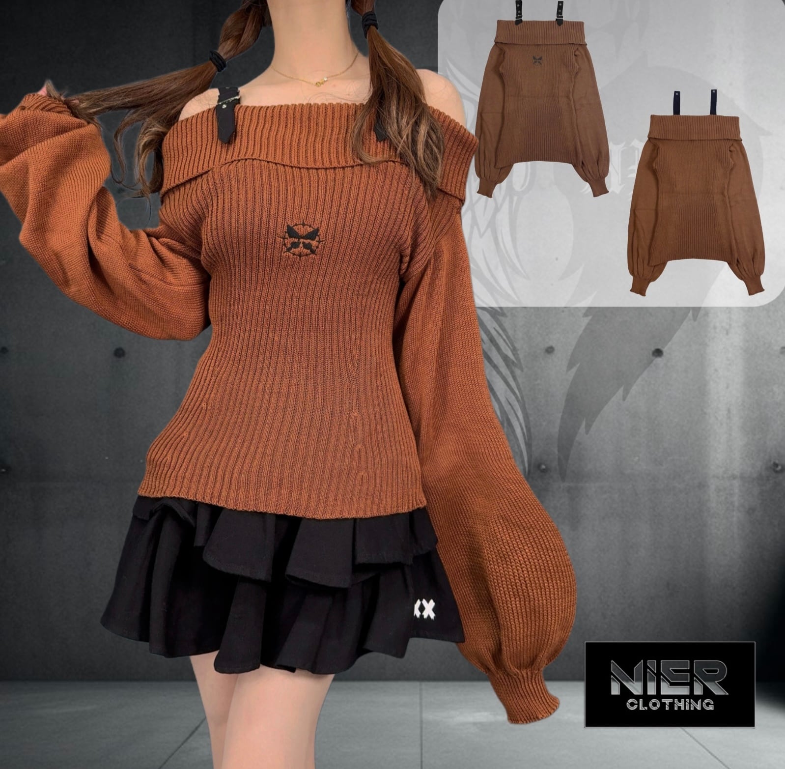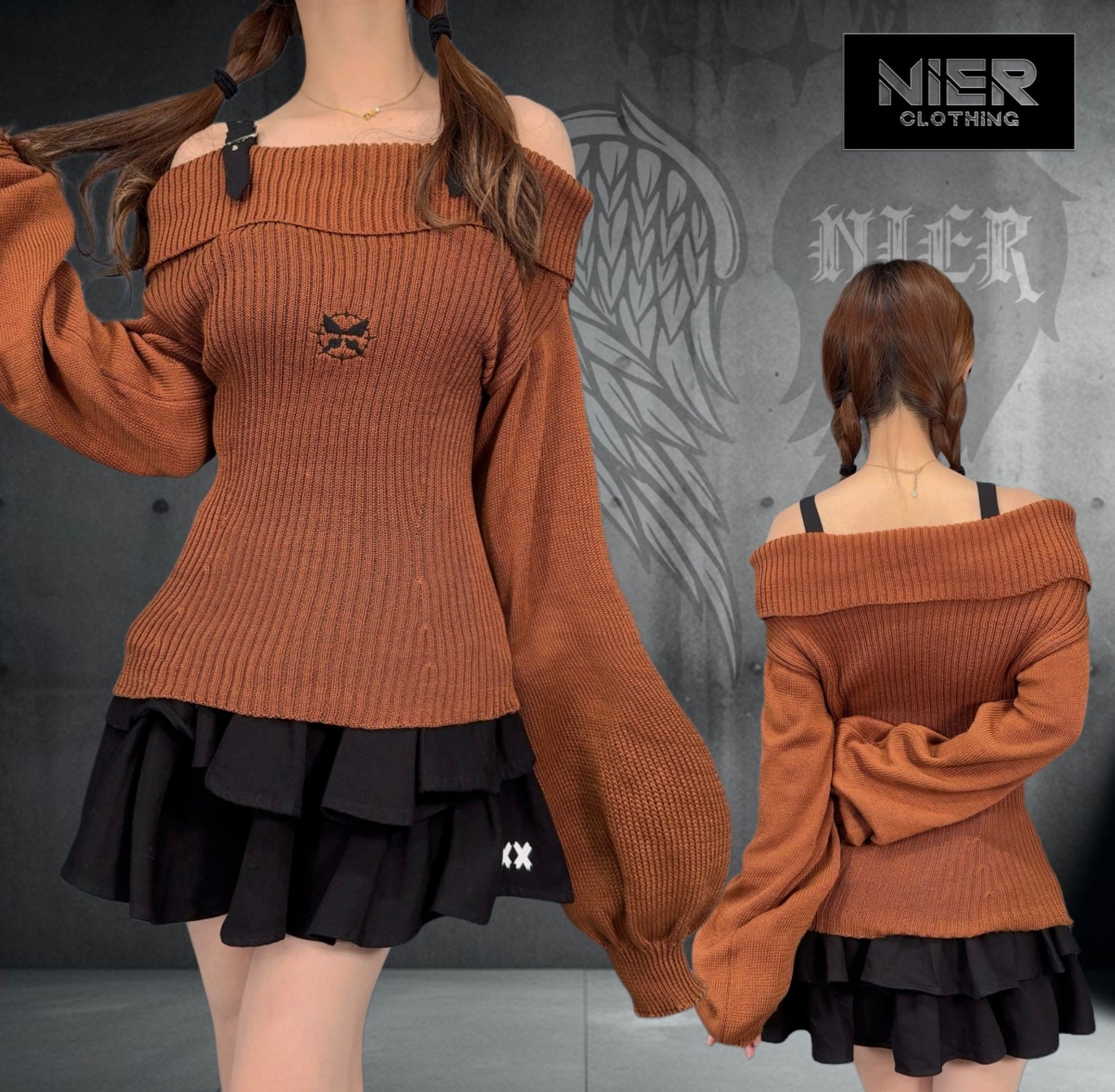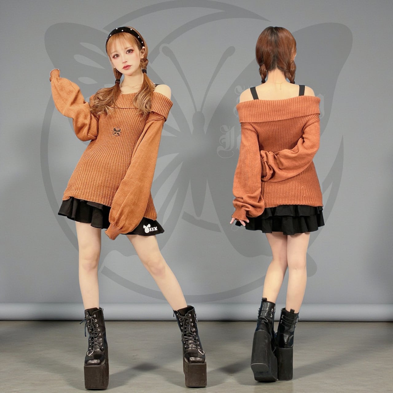 STRAP×OFF-SHOULDER CHOCOLATE KNIT【BUTTERFLY刺繍】