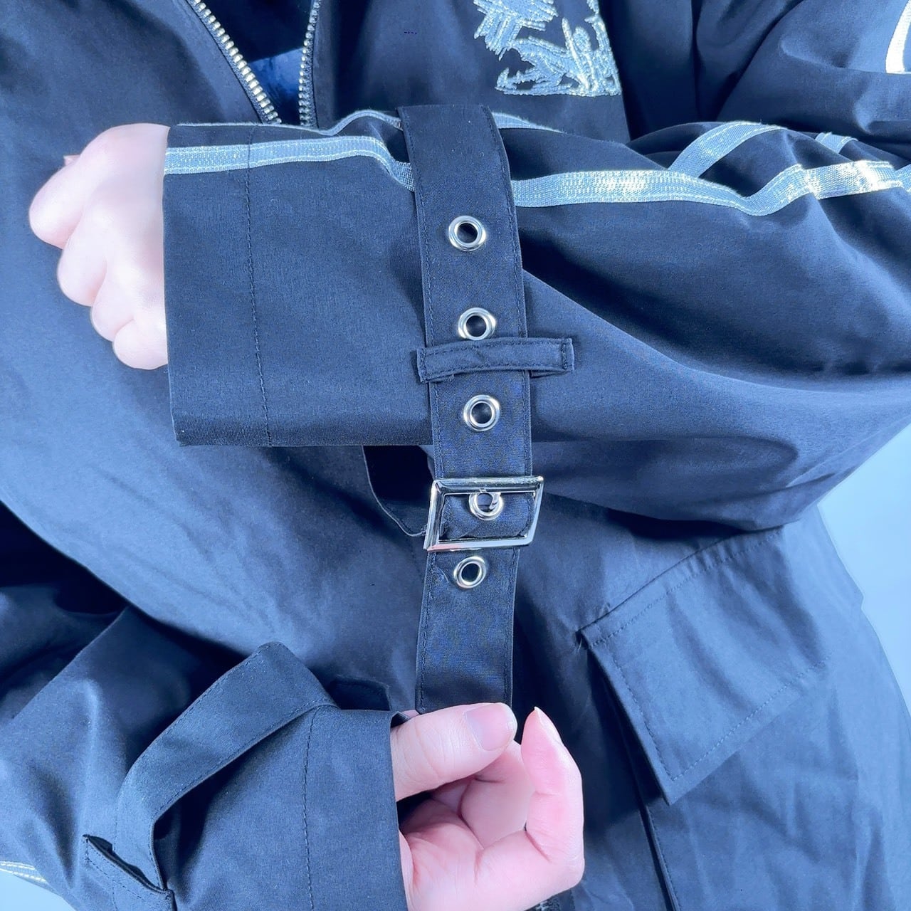 袖にはベルト装飾を配置し、
