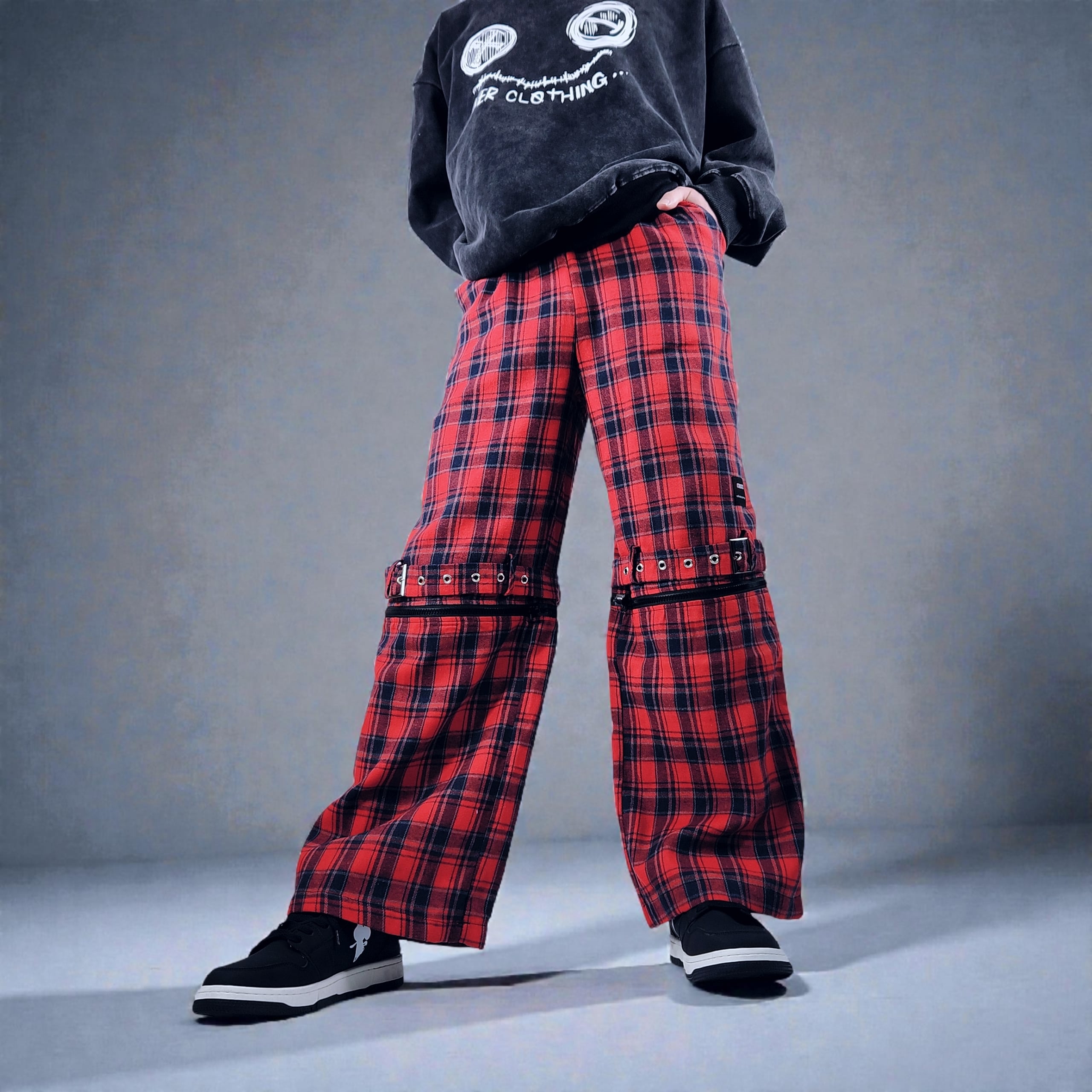 赤チェックに、ZIPとハトメベルトが効いた軽量パンツが登場。