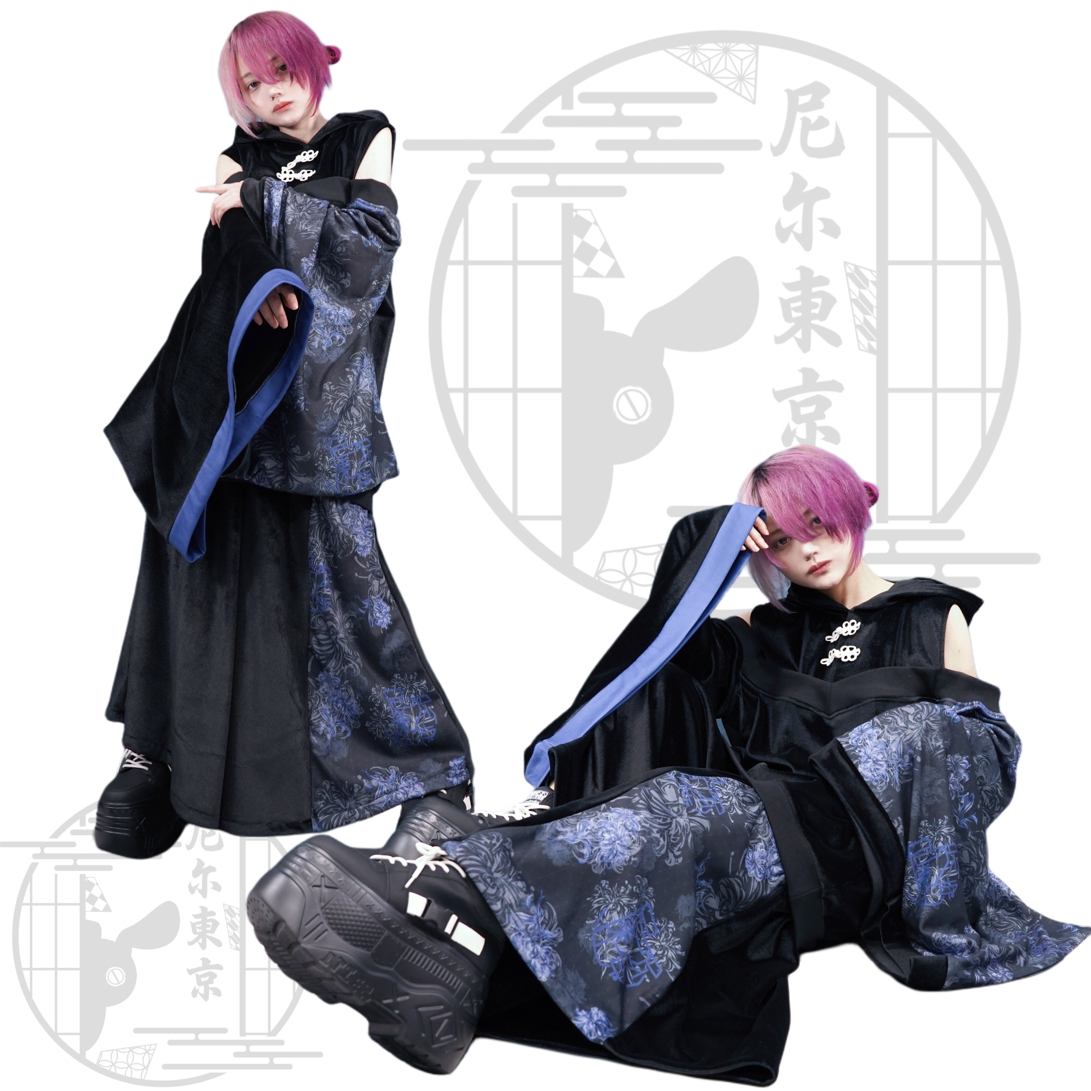 上品な光沢感のあるブラックベロアに、青く浮かび上がる彼岸花柄を組み合わせた