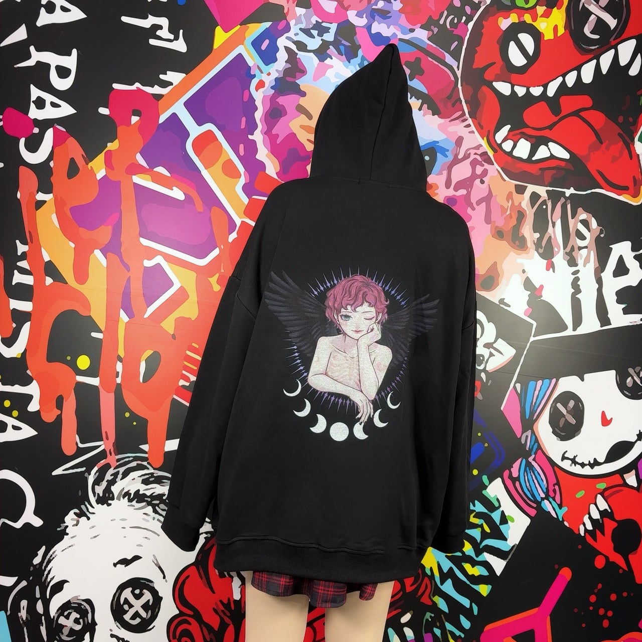 バックには黒い翼のエンジェルモチーフを大胆にプリントしたアートデザインパーカーです。