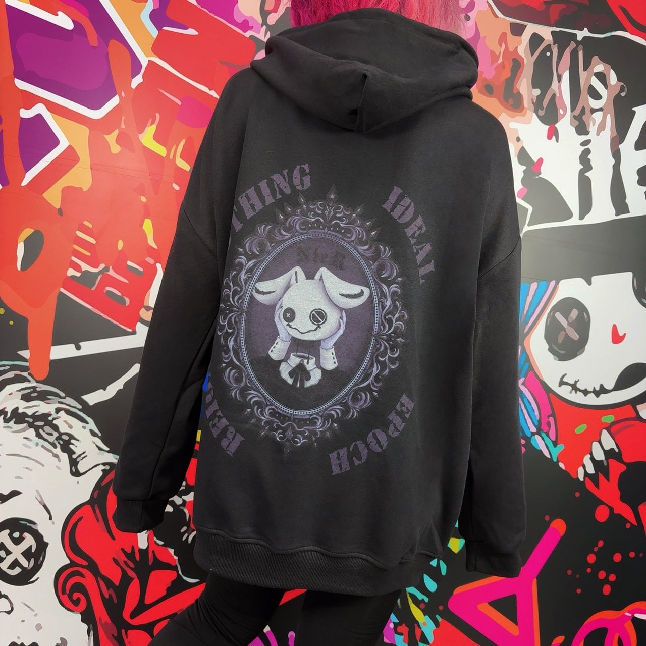 背面にはゴシックフレームに囲まれたダークアートを大胆にプリントした、存在感抜群のパーカーとなります。