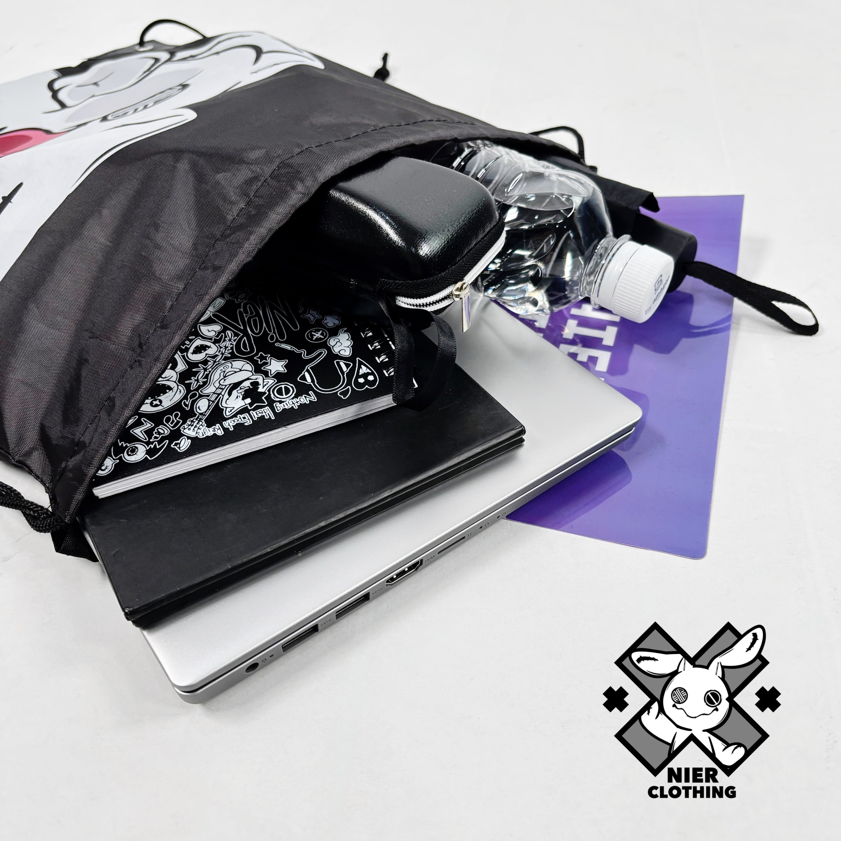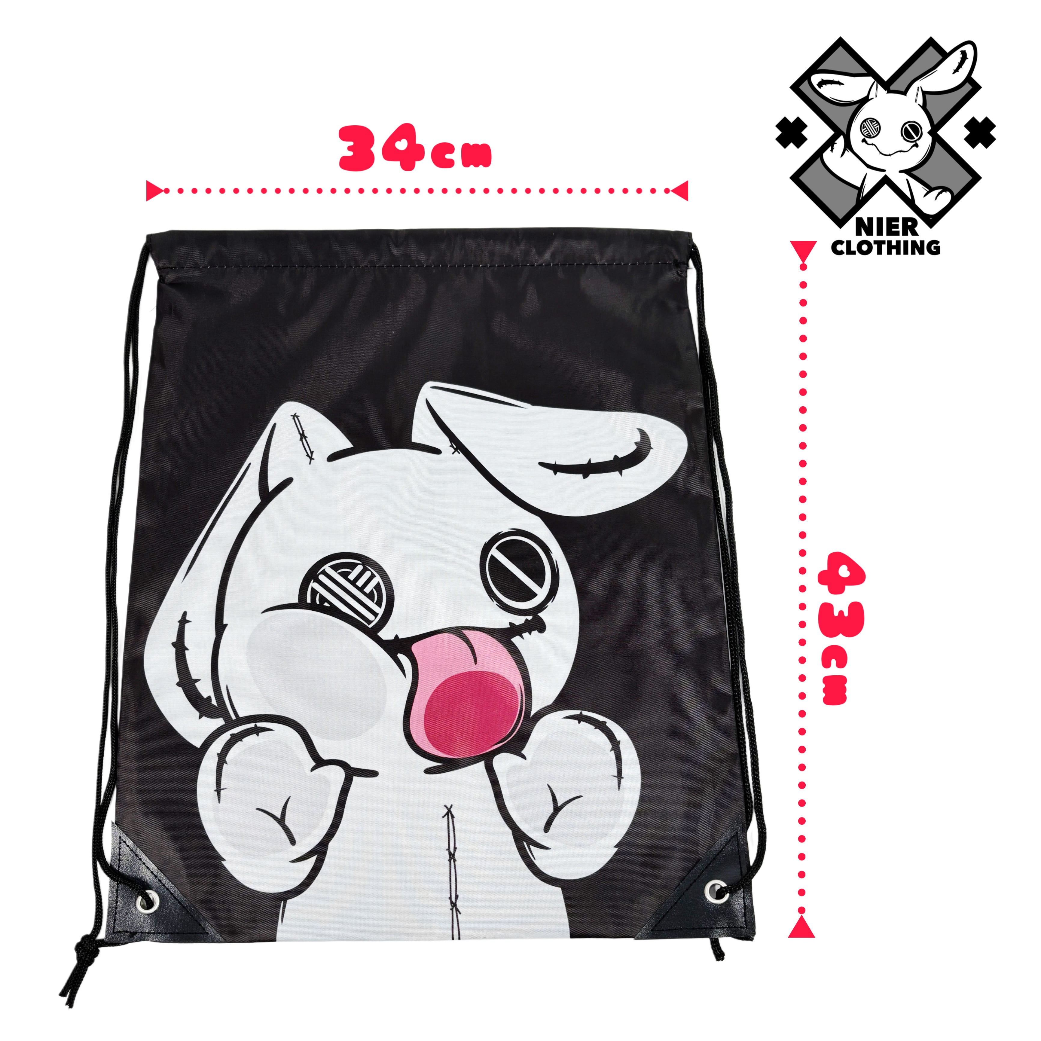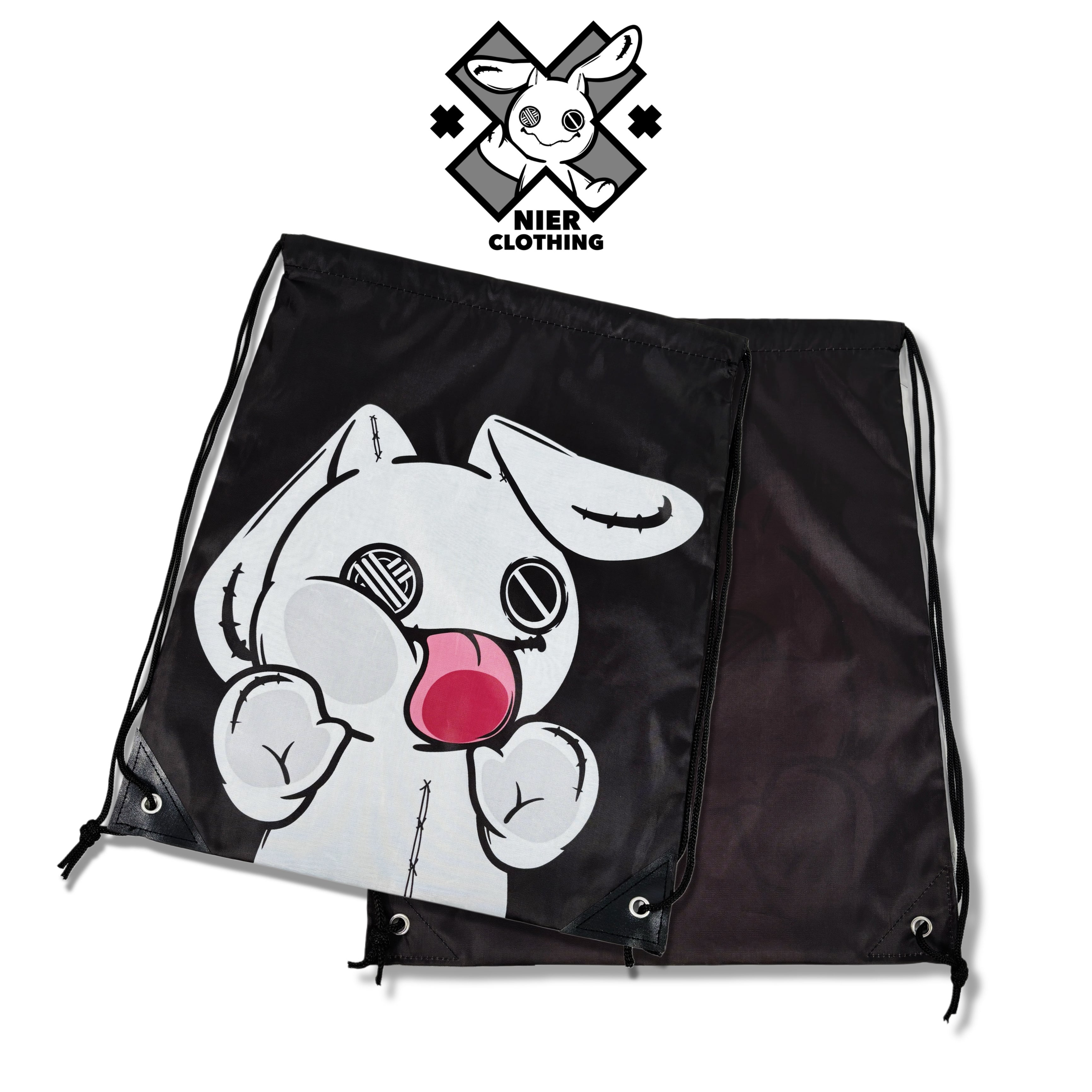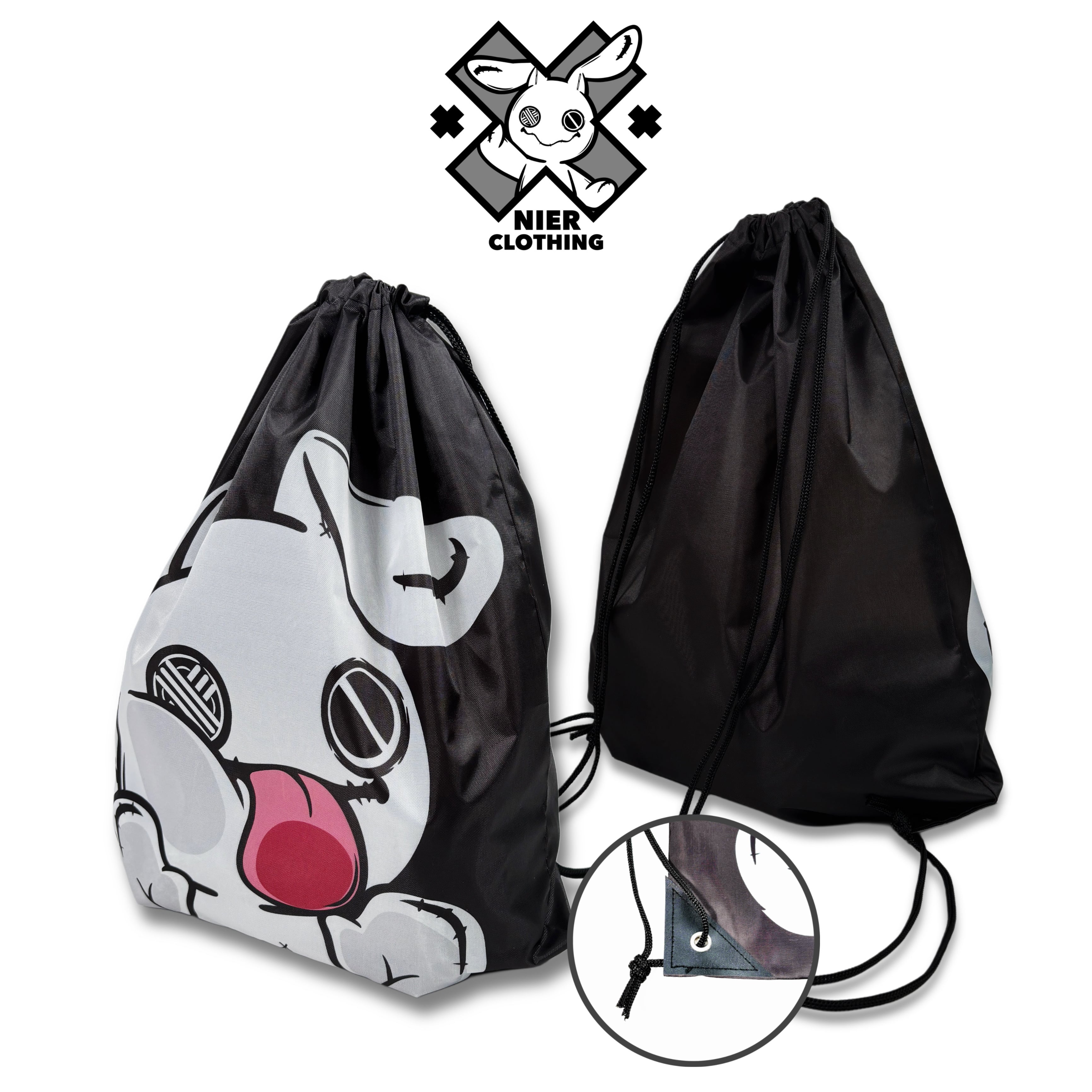 NIERちゃんのユーモアあふれるデザインが目を惹くナップサックです。