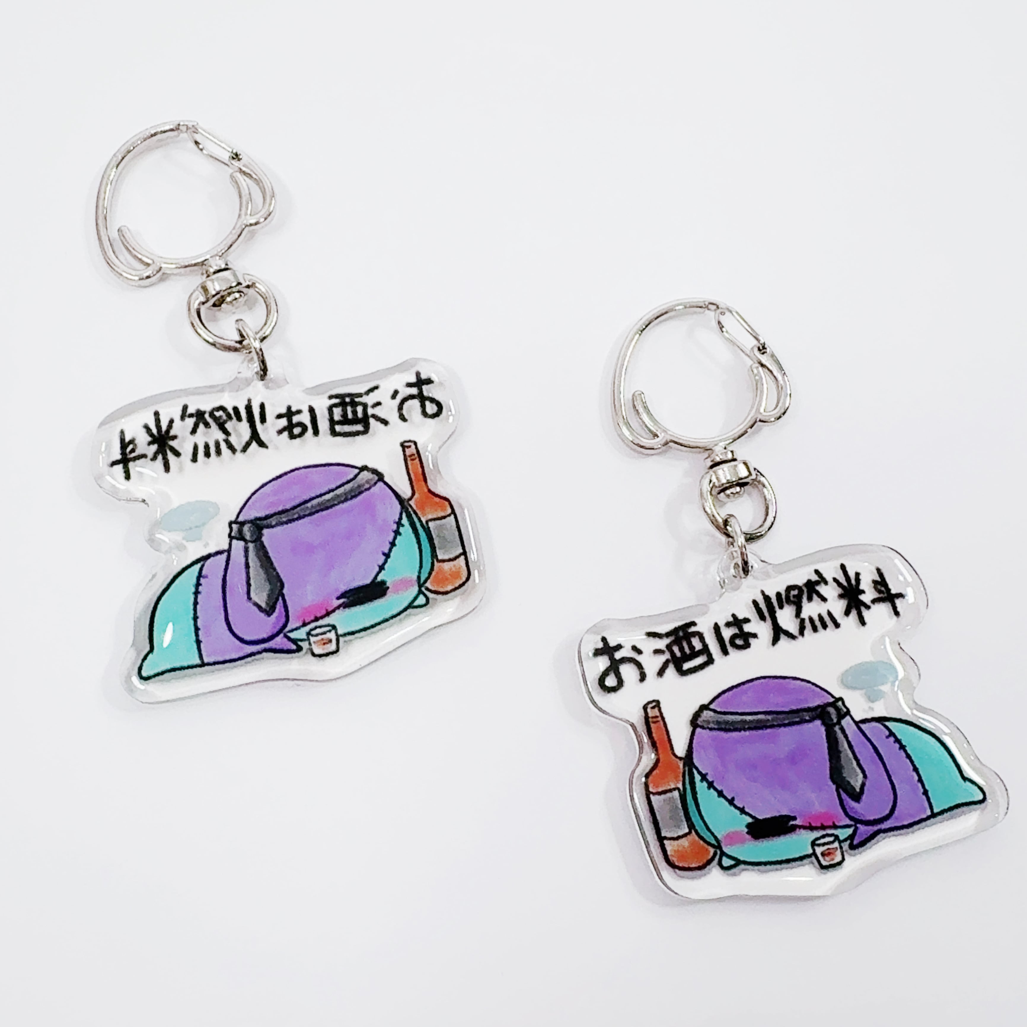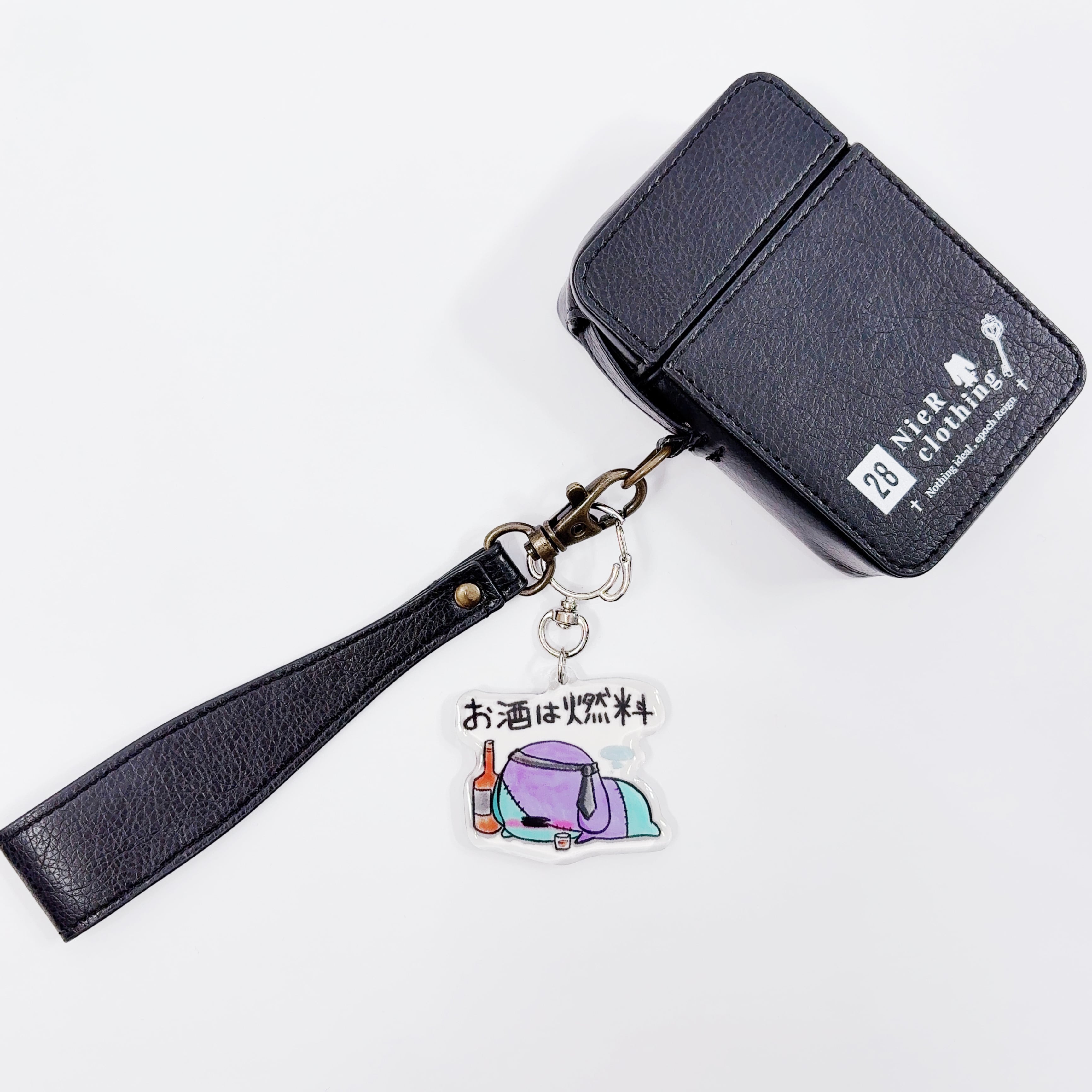 「お酒は燃料」の文字が印象的なアクリルキーホルダーです。