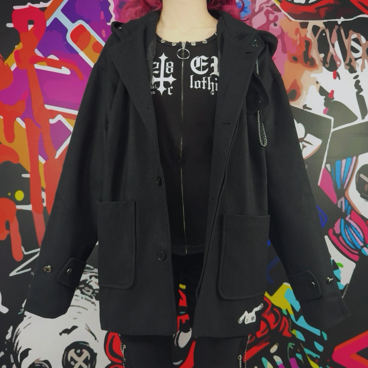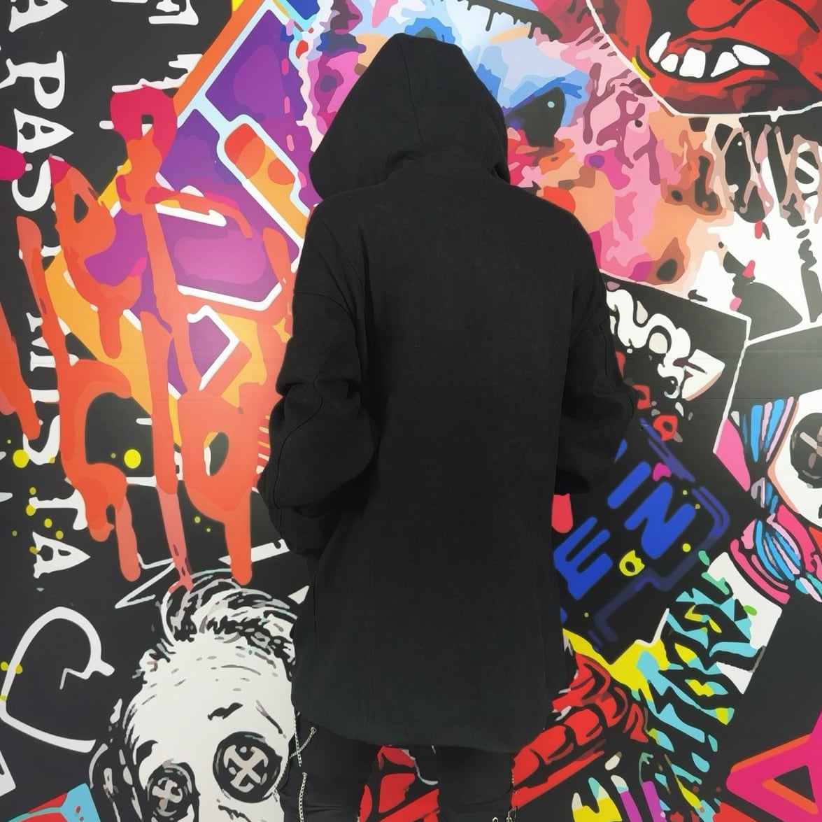 裏地付きフードデザインでライブやイベントから普段使いまで幅広く活躍するブラックアウターです。