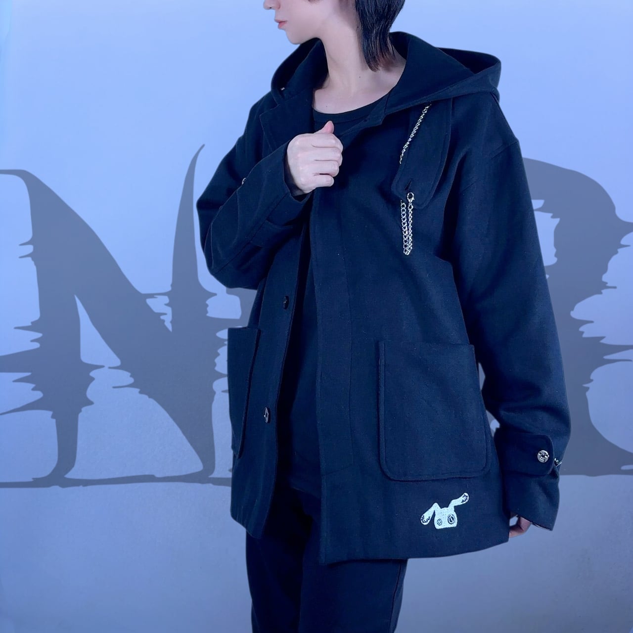 シンプルなブラックアウターに、ギミックの効いたディテールを落とし込んだフード付きコートになります。
