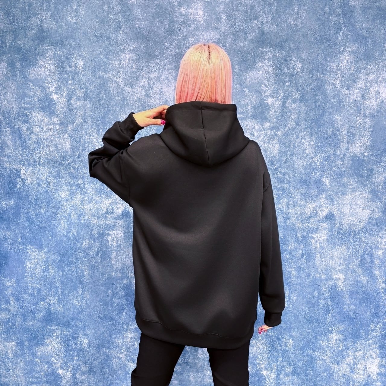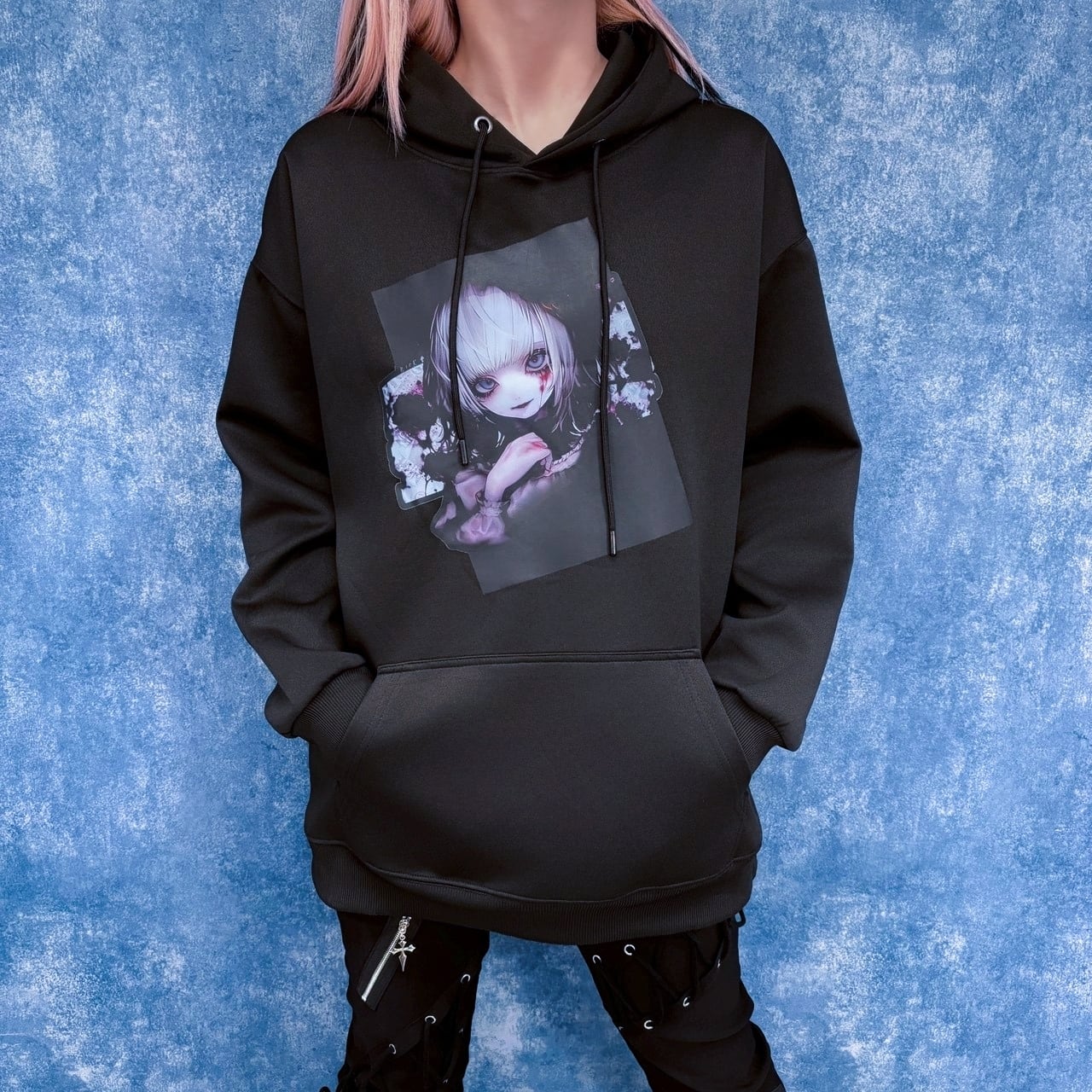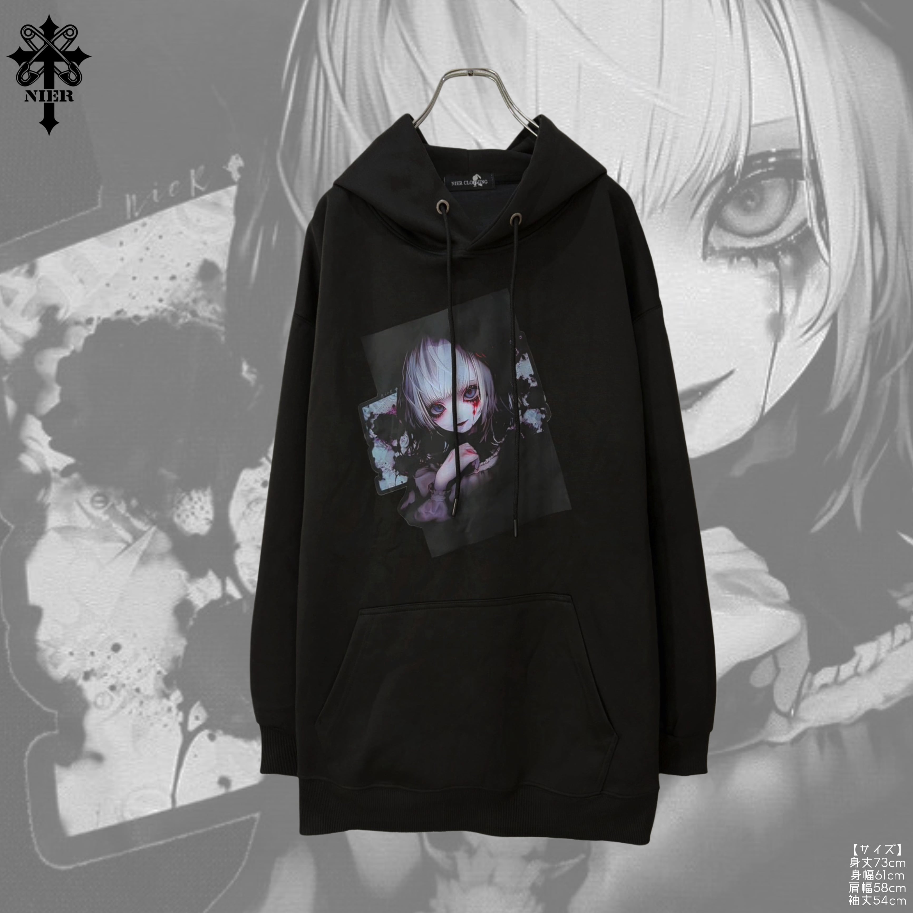 ダークでアーティスティックなイラストをフロントに配置した、印象的なプルオーバーパーカーです。
