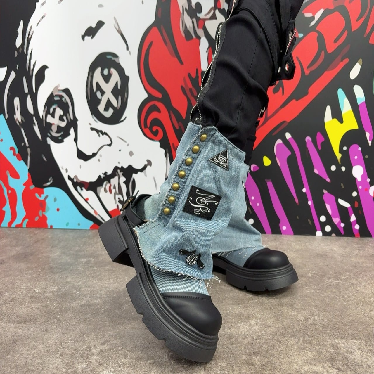 デニム×レザーの異素材コンビに、複数のパッチやスタッズを贅沢に配置。