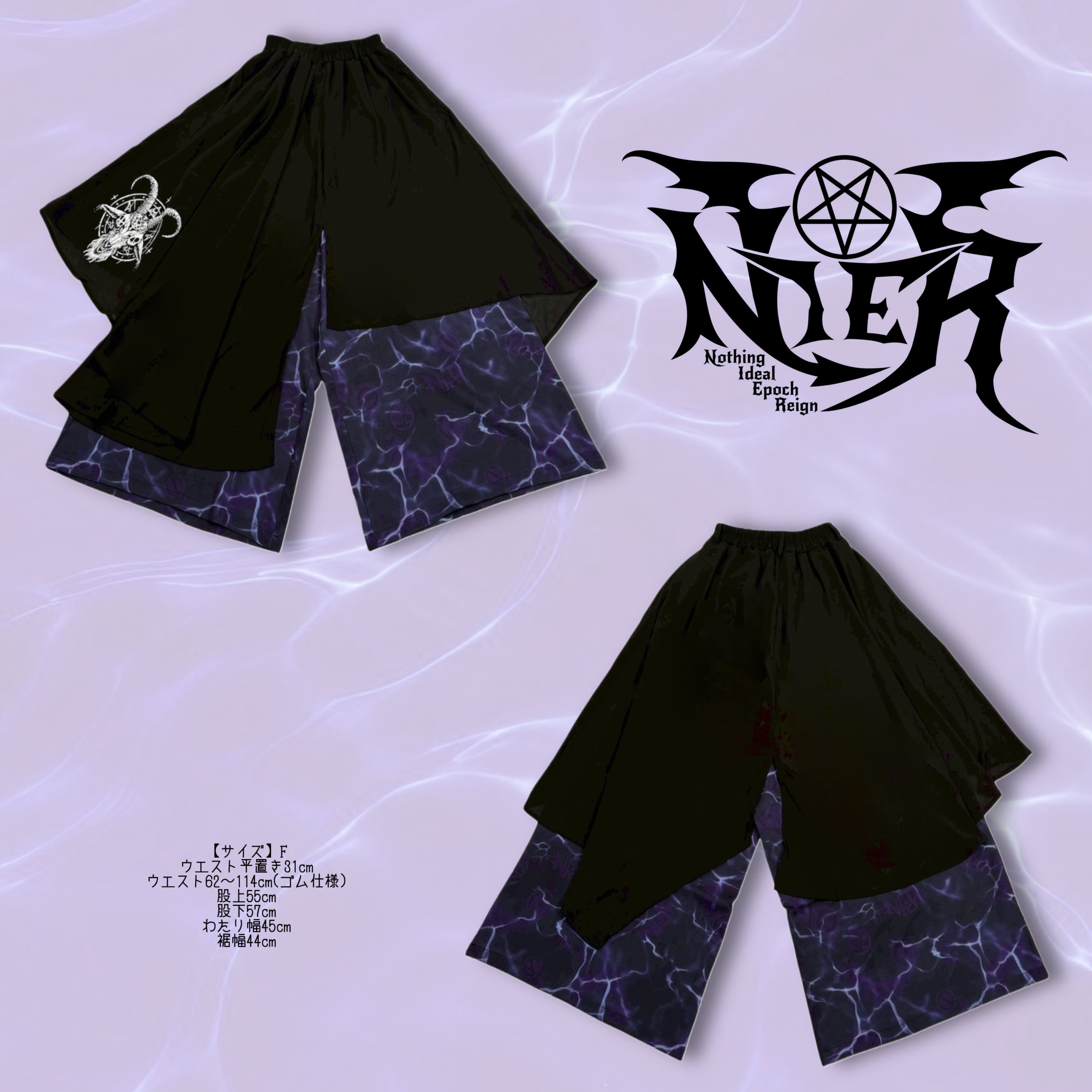 NIERフェイスが浮かび上がる総柄パンツをレイヤードしたフラップ付きパンツです。